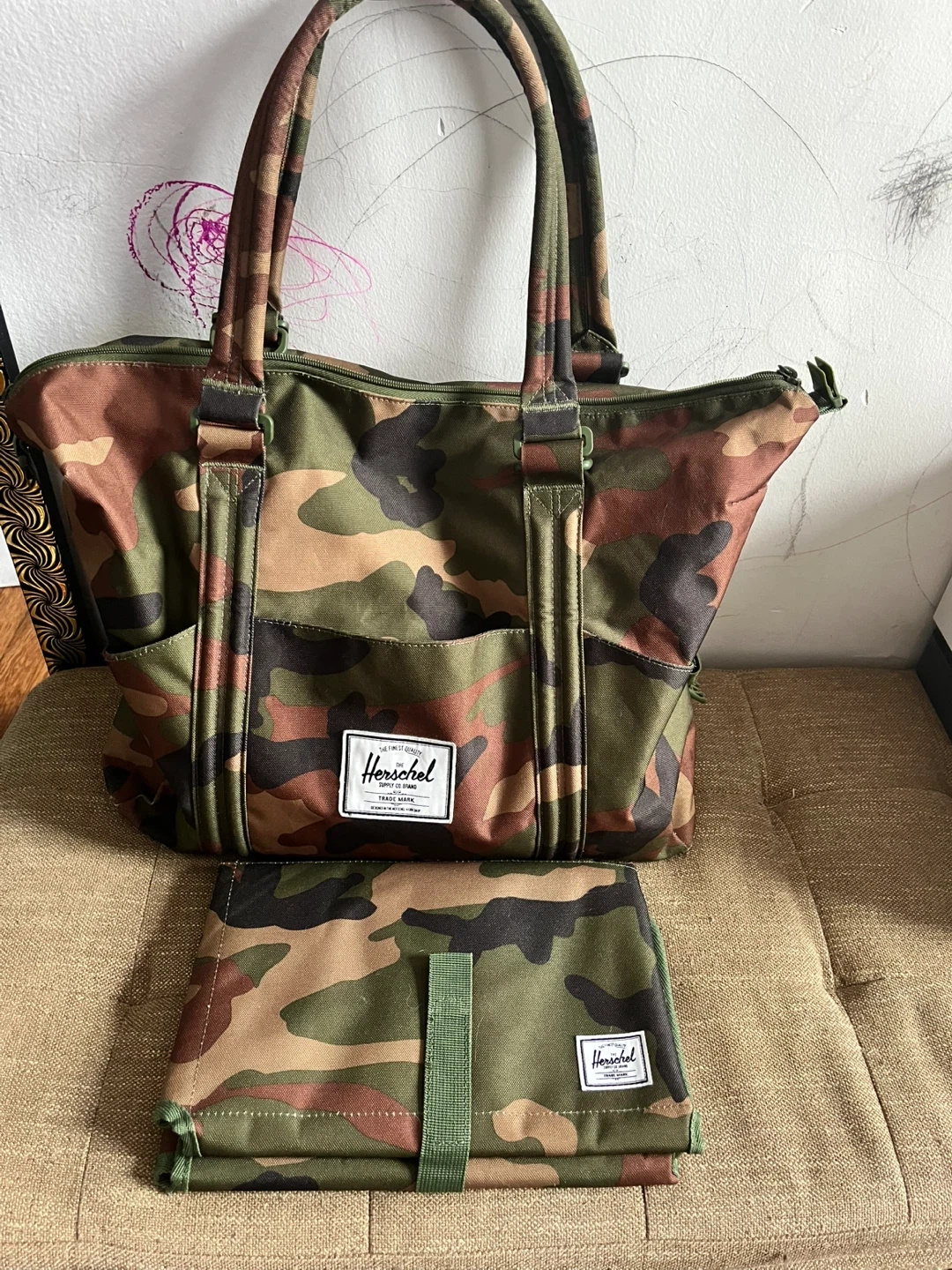 Inside stitching has been removed for it to be more open. Portable changing table is in perfect condition, never used, $5.00 for both. First come, first serve.