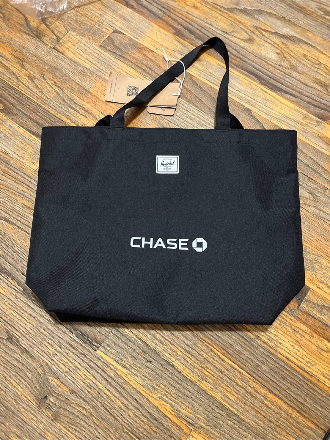 I'm selling a brand new Herschel x Chase tote bag in black! It's a great, versatile bag for everyday use. The bag features the Herschel logo and the Chase logo. Perfect for carrying groceries, books, or anything else you need on the go
