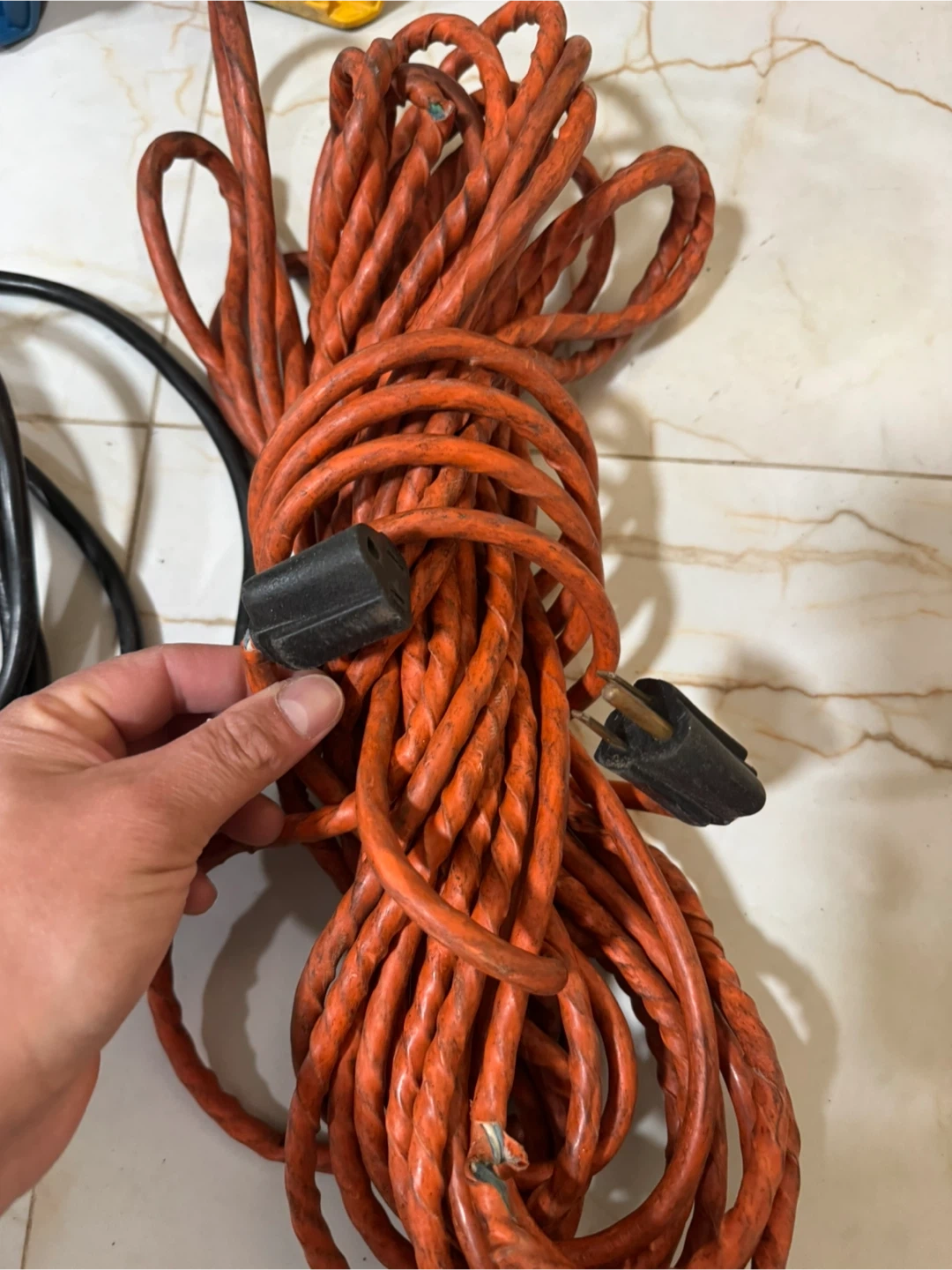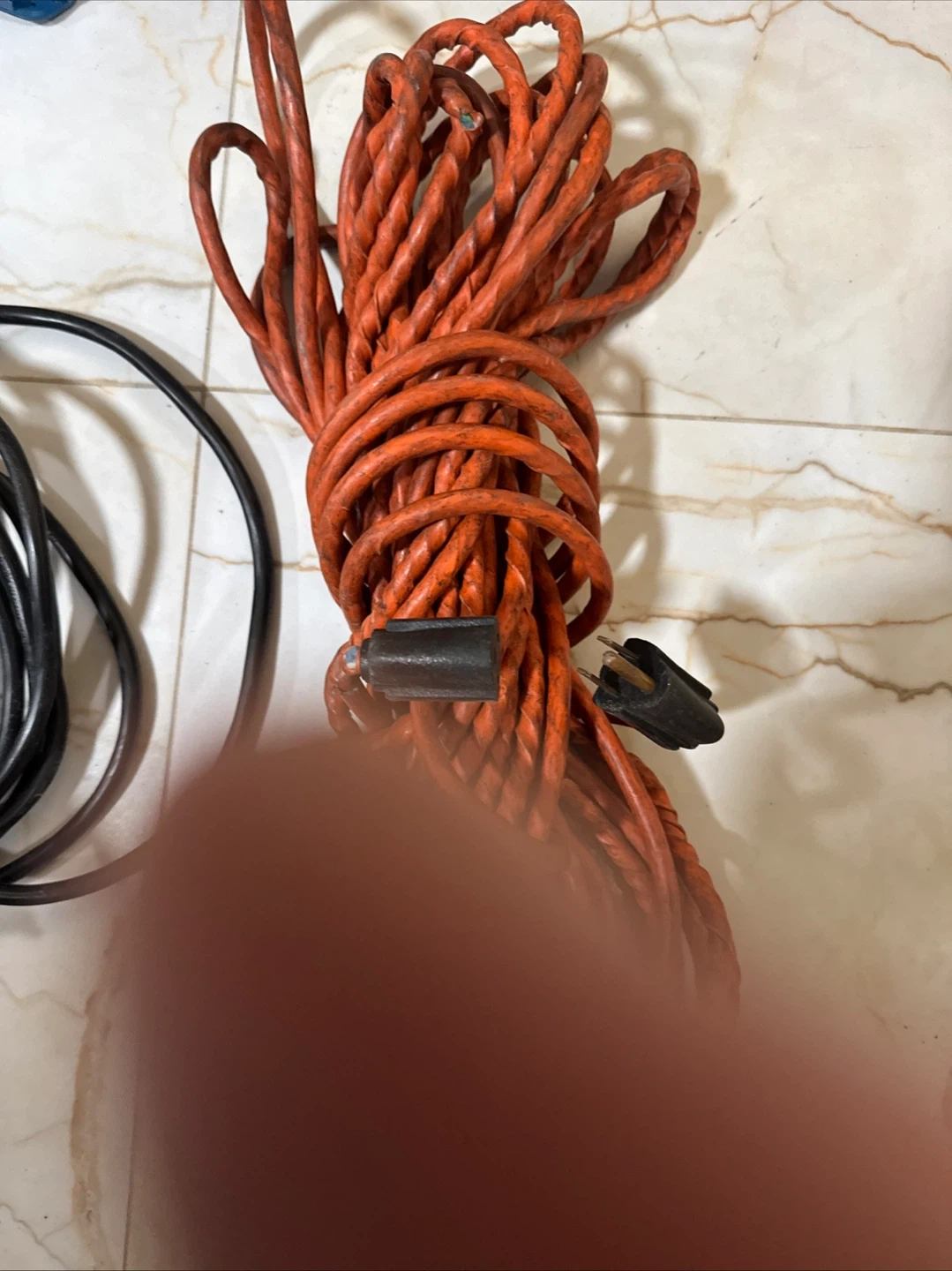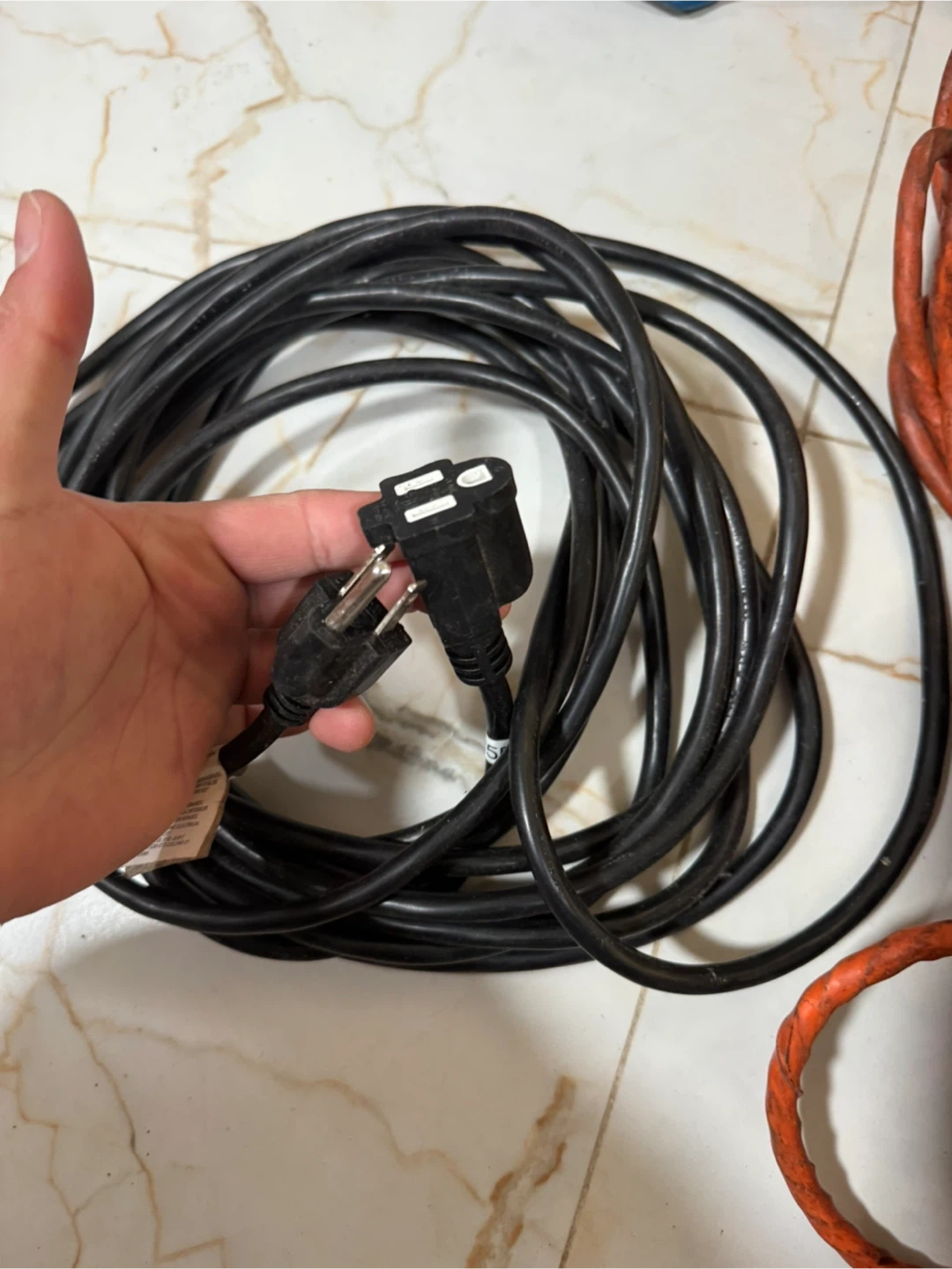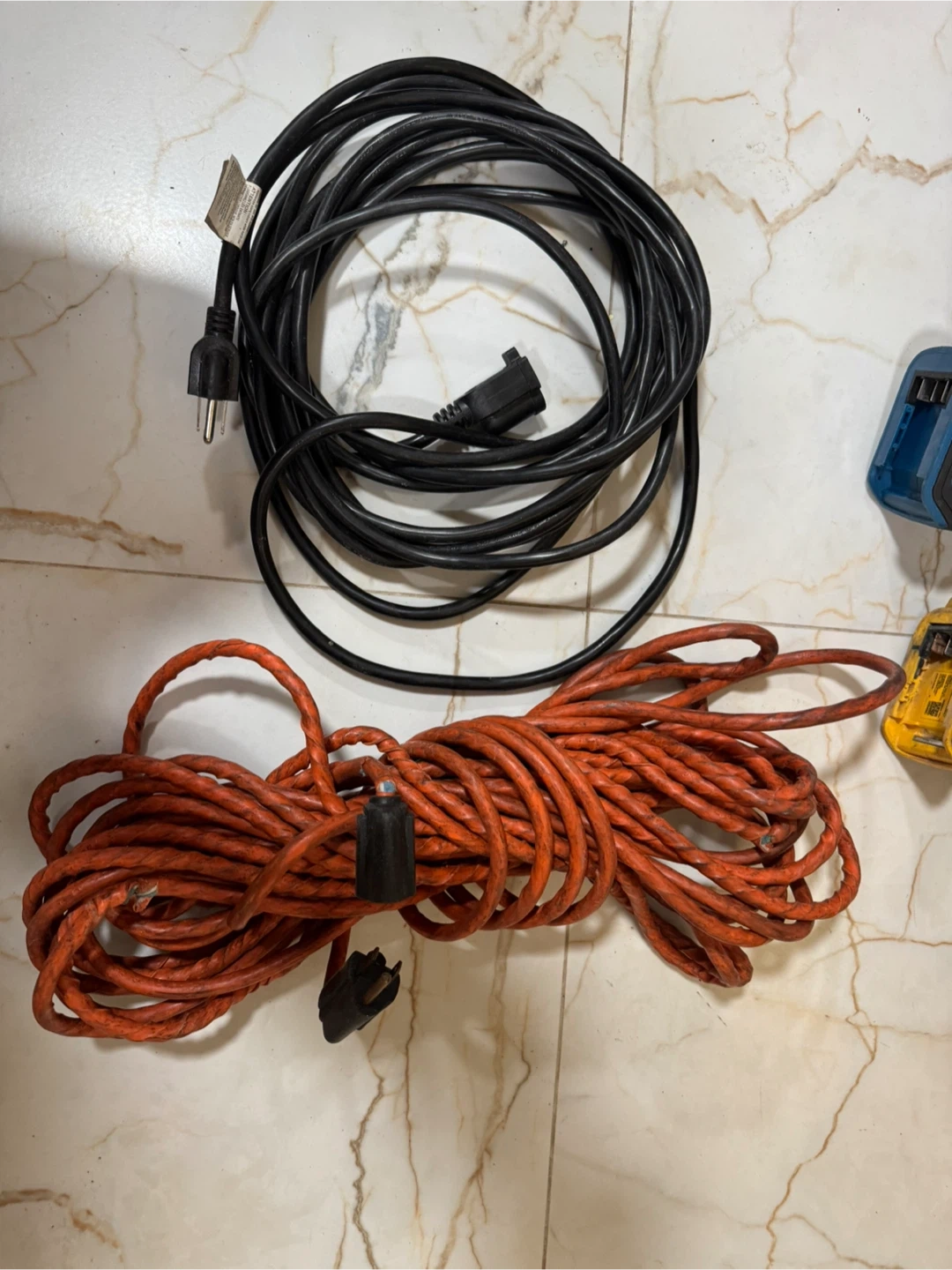 Includes one orange heavy-duty extension cord and one black extension cord. Both cords have male and female plug ends. Dos extenciones eléctricas