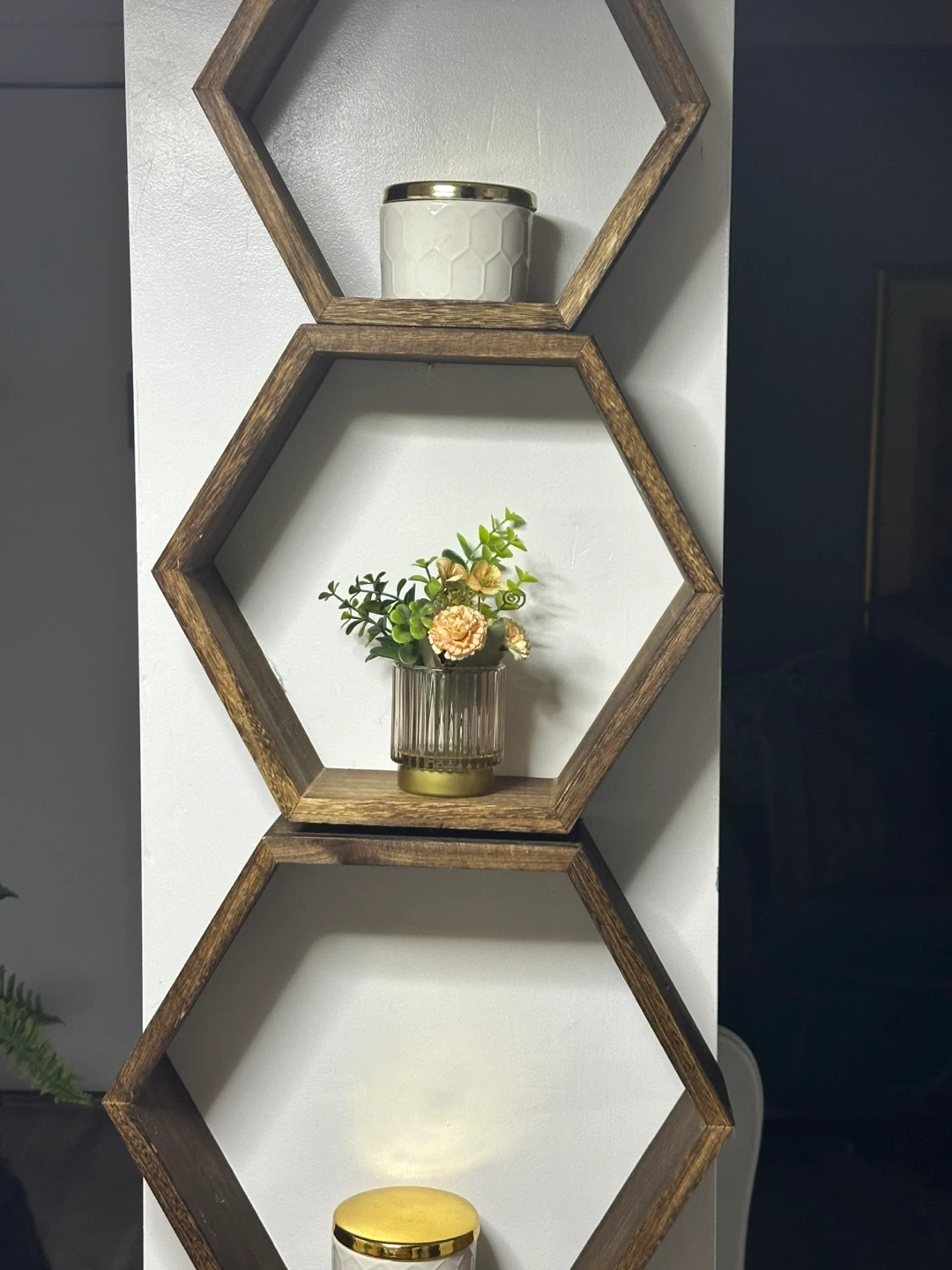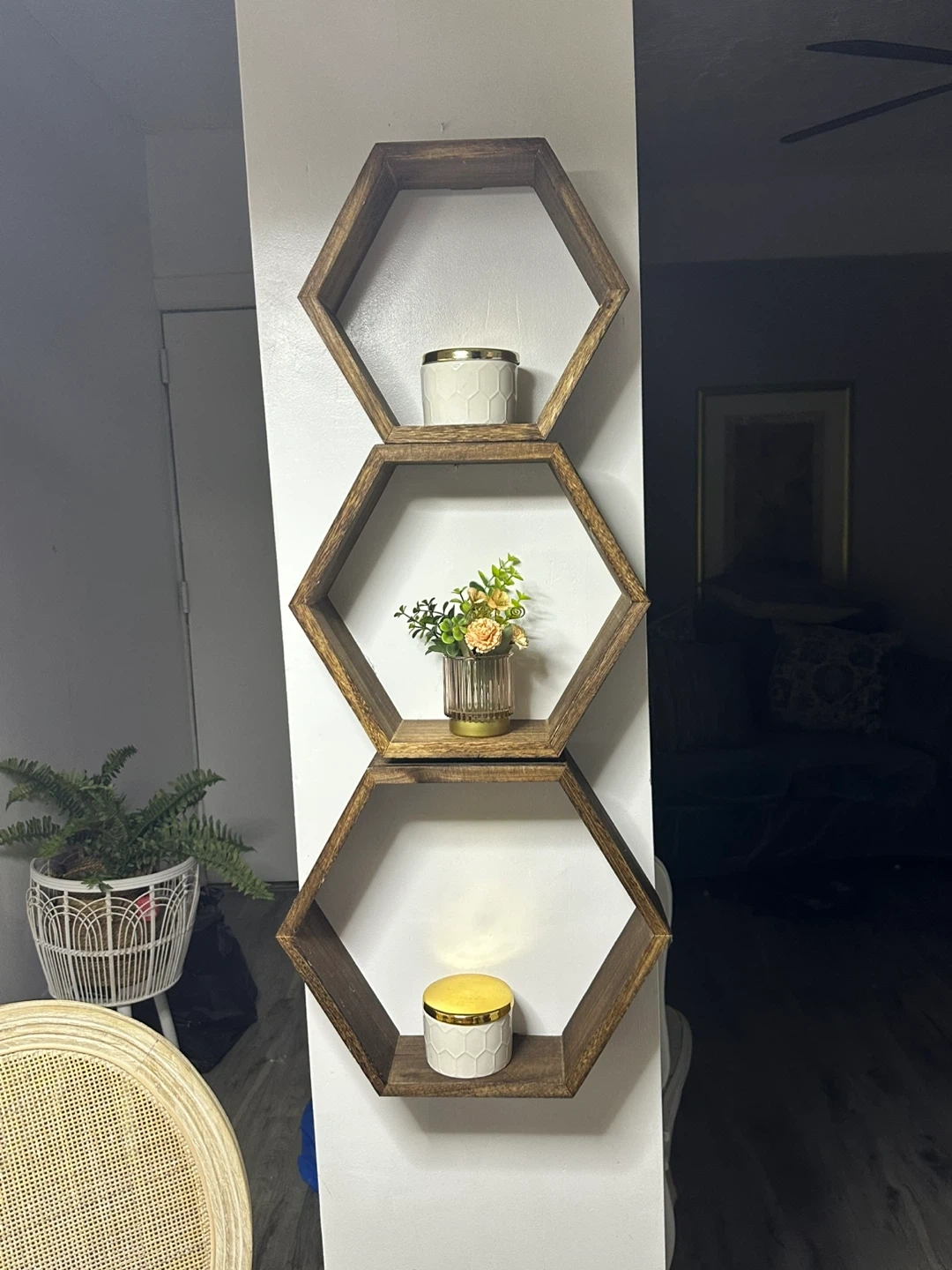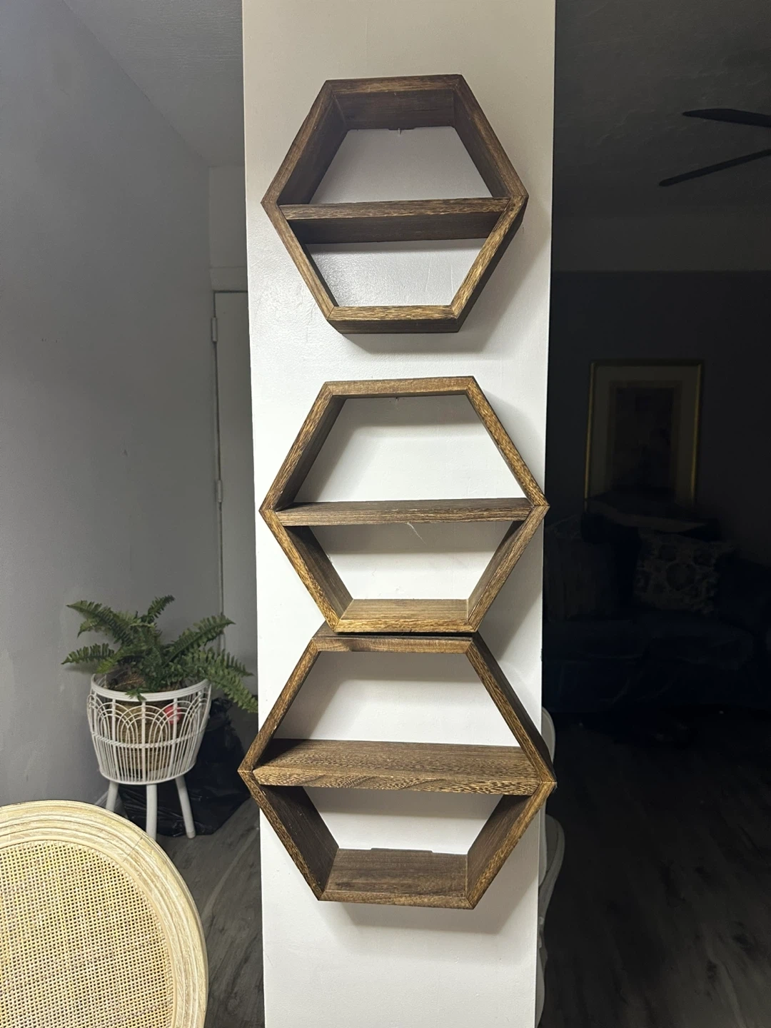 I'm selling a set of hexagon wall shelves! They're perfect for adding a touch of modern style to any room. They're made of wood and are in great condition. Great for displaying plants, photos, or other decorative items