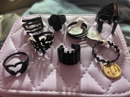 Set of 8 Gothic black stainless steel rings in sizes 17-20. These round rings are perfect for any occasion and feature a black color with an excellent cut grade. The rings are personalized with a Gothic theme and are made of high-quality stainless steel. Let me know if you're interested!