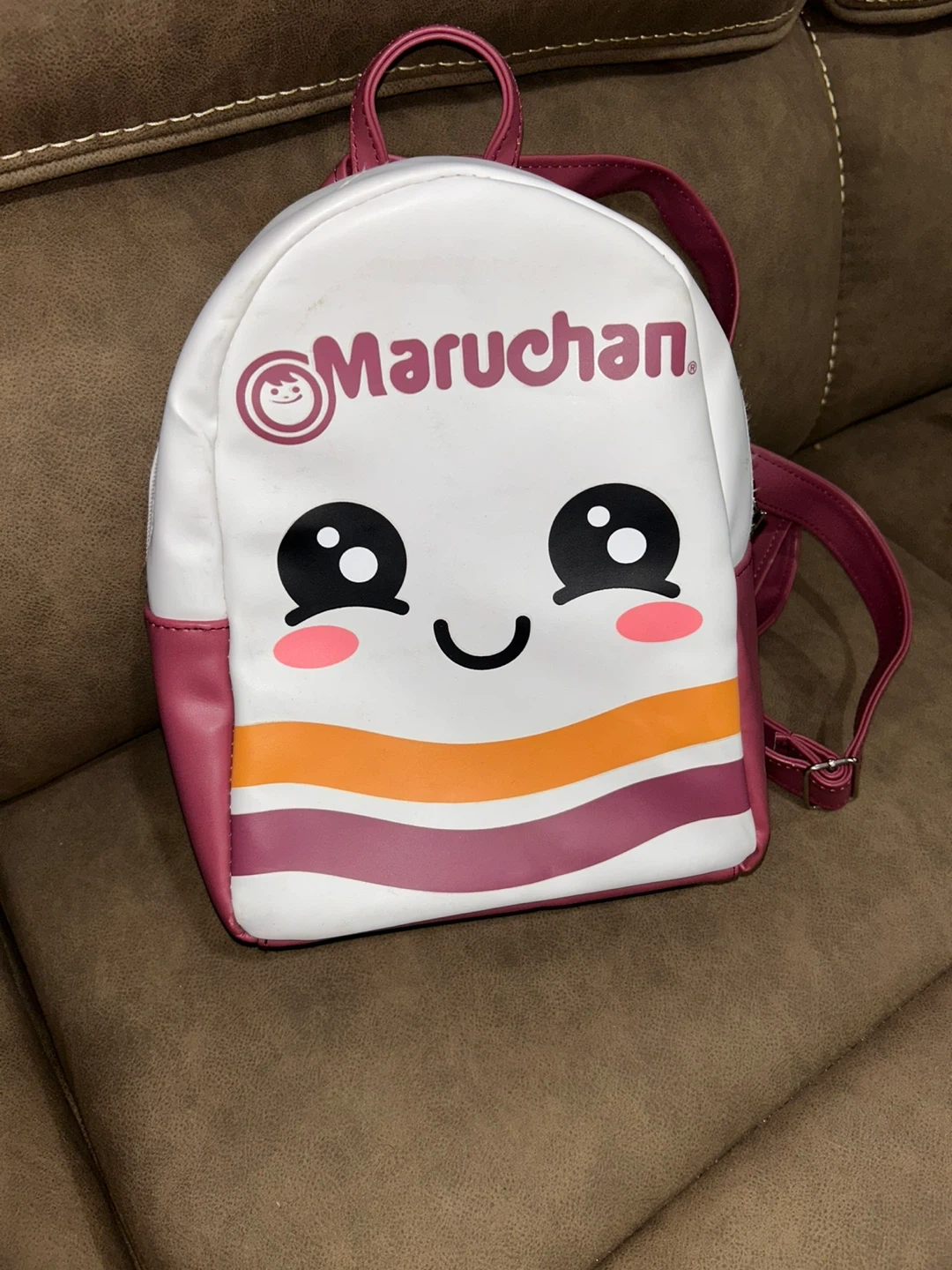 This is a cute mini backpack featuring the Maruchan Ramen mascot! It's white with pink accents and straps. The interior is lined with red fabric. It's a fun accessory for any Maruchan fan!