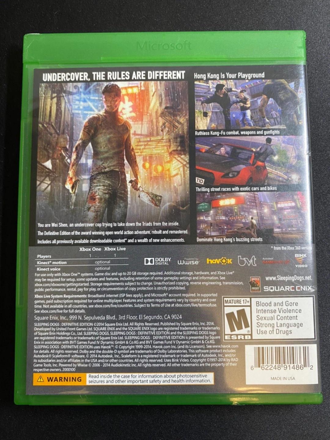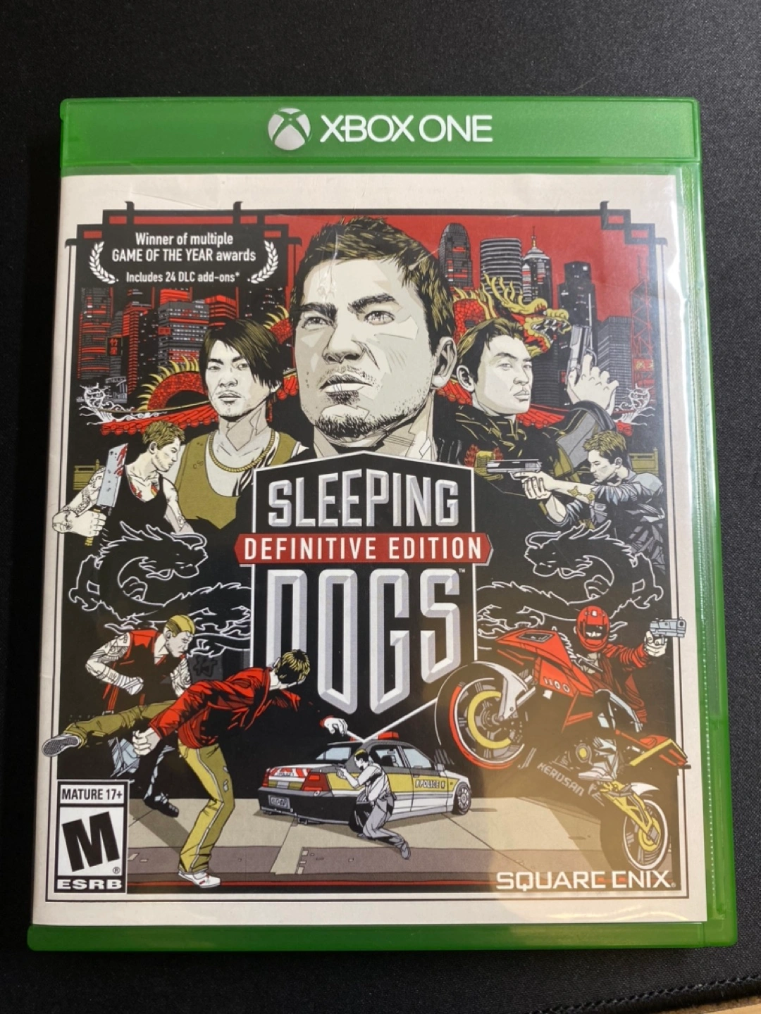 Xbox One game. Definitive Edition. Includes 24 DLC add-ons. Award-winning open world action game. Hong Kong setting. Mature 17+.