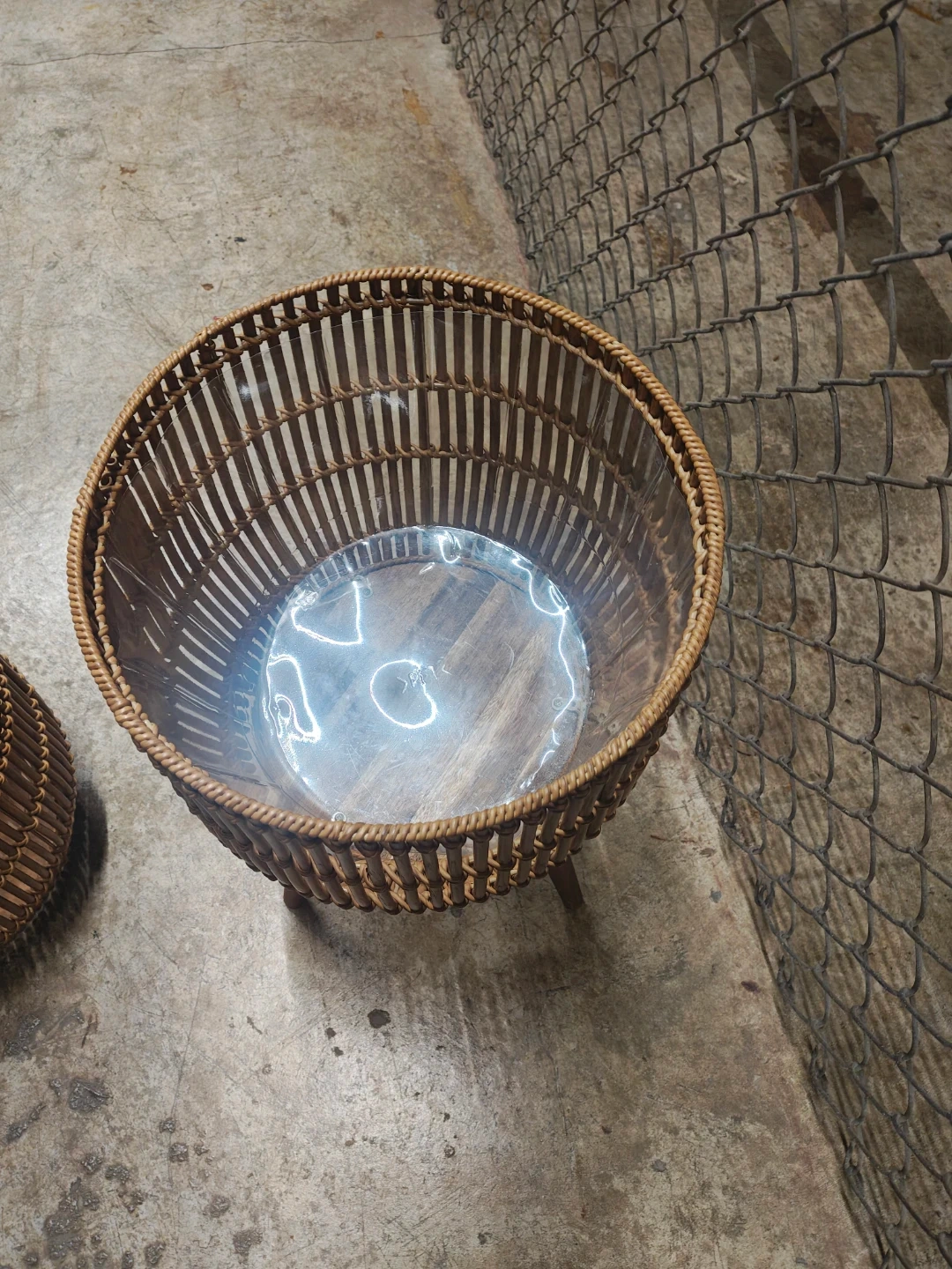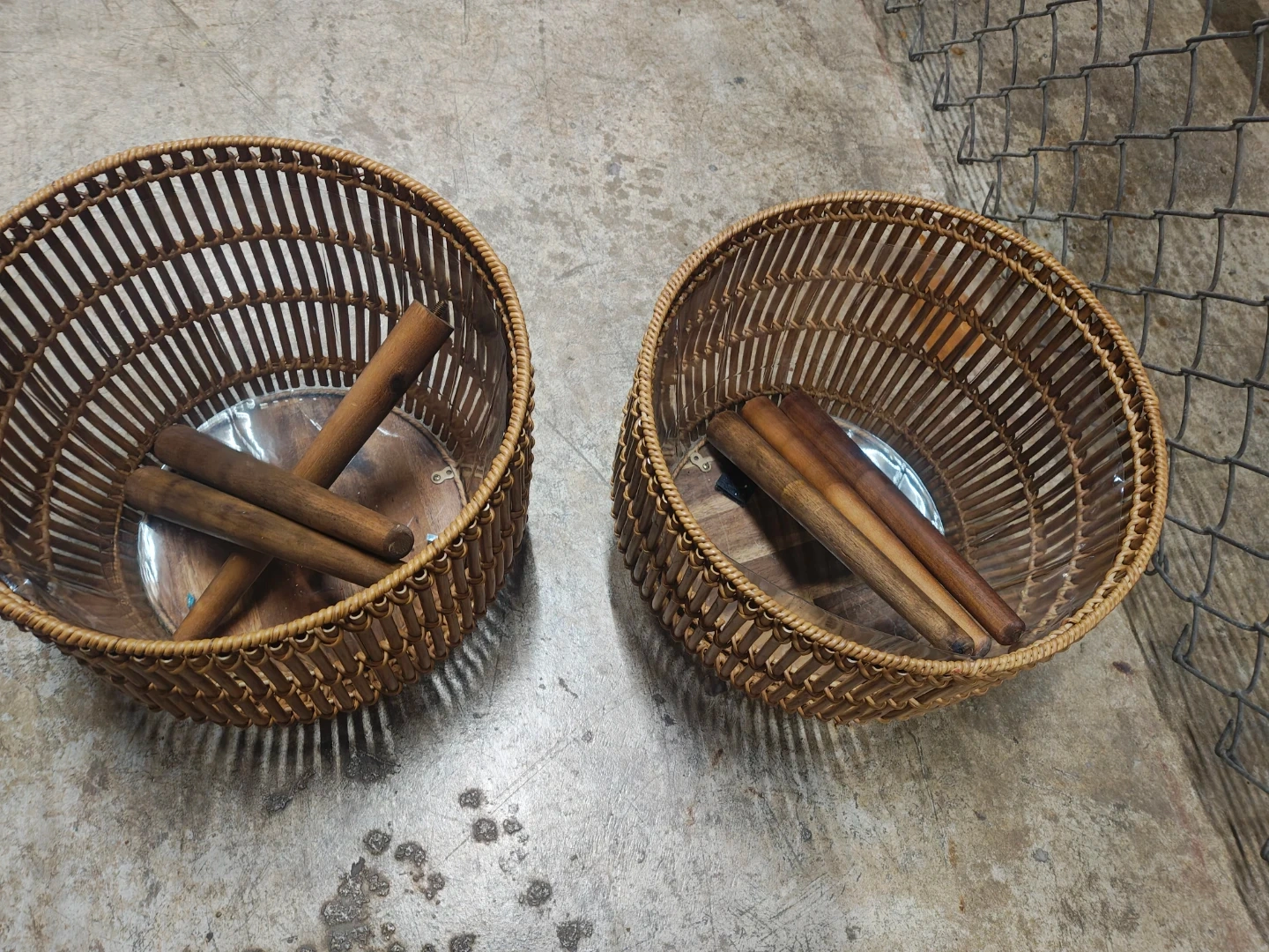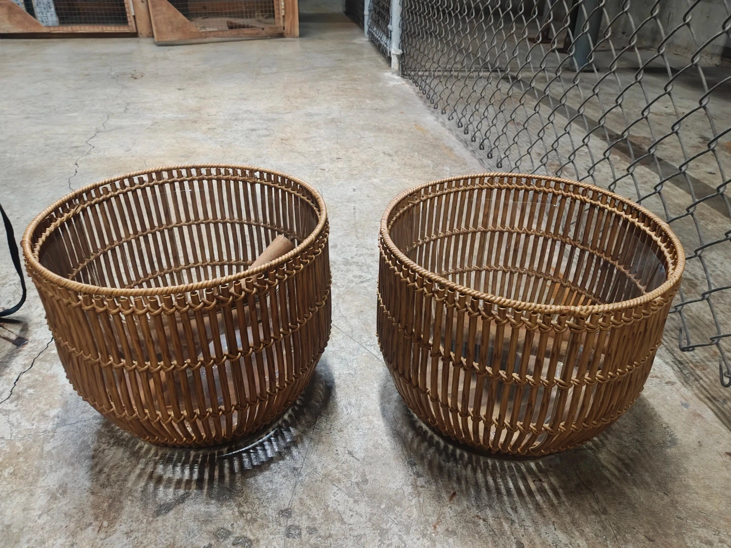 Two woven rattan baskets with a natural, earthy tone hand made each is unique. These baskets are suitable for holding plants or for general storage. They're made from durable rattan material. The set includes wooden inserts for stability. Paid $65 each. Never been used. Price is negotiable.