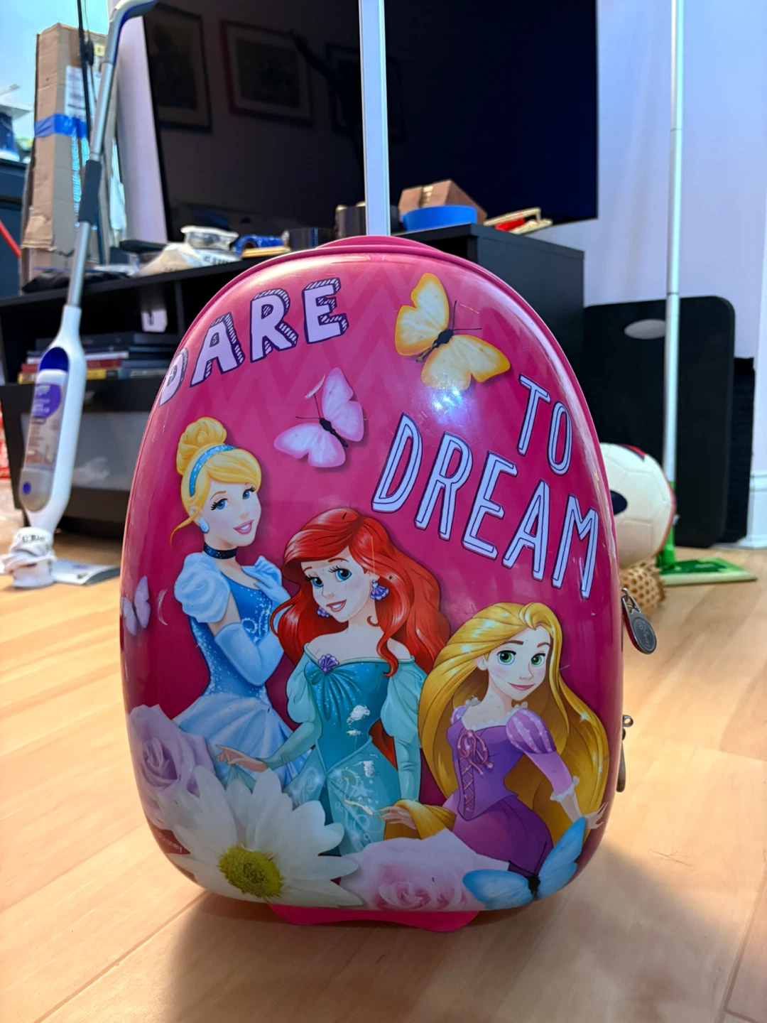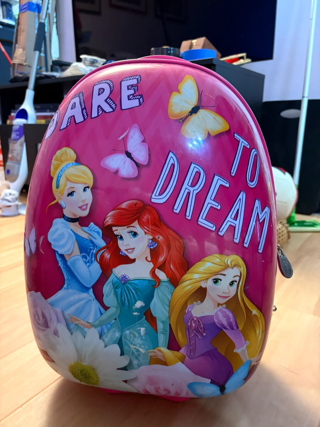 This fun pink rolling luggage features Cinderella, Ariel, and Rapunzel with the "Dare to Dream" phrase. It's perfect for your little one's travels or sleepovers. Hard shell construction with wheels and a retractable handle.