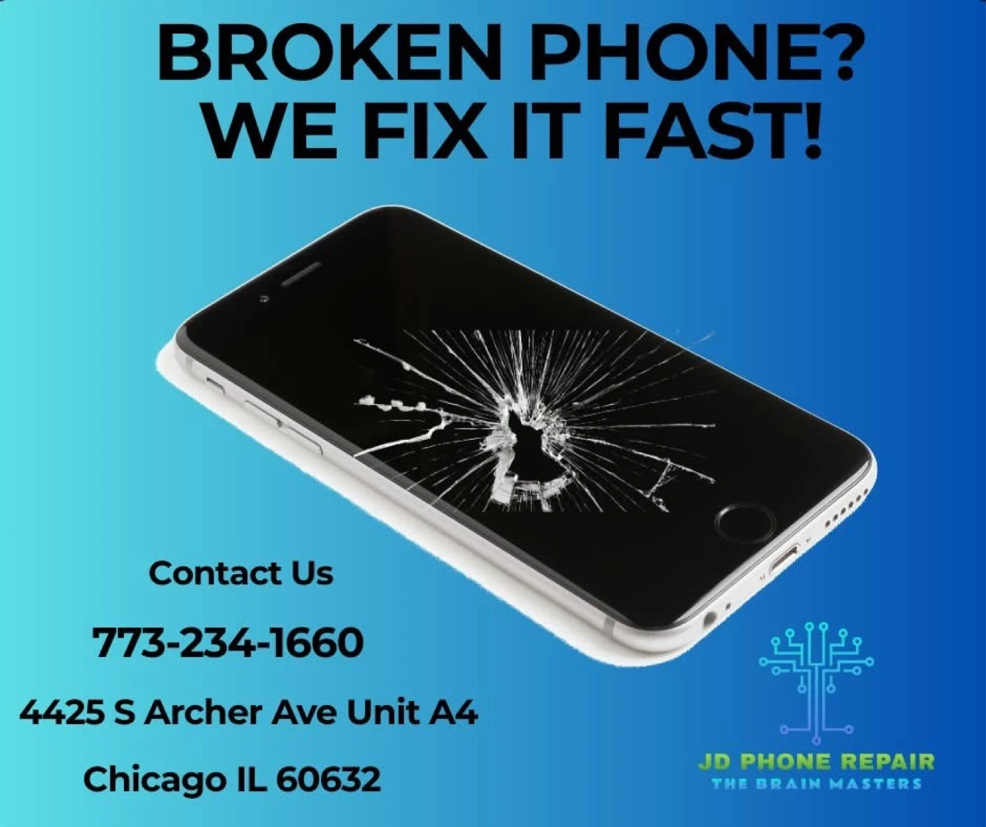 JD Phone Repair offers fast service for your broken iphone! Contact us at 773-234-1660 for expert repair. We're located at 4425 S Archer Ave Unit A4 in Chicago, IL 60632. Get your phone fixed by the brain masters! Prices start at $65