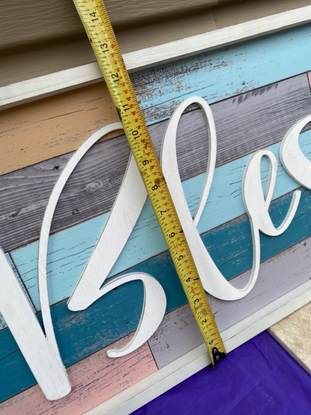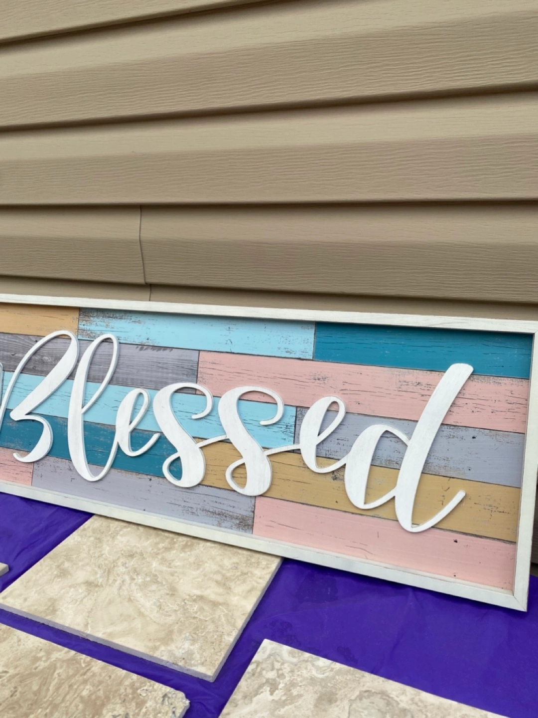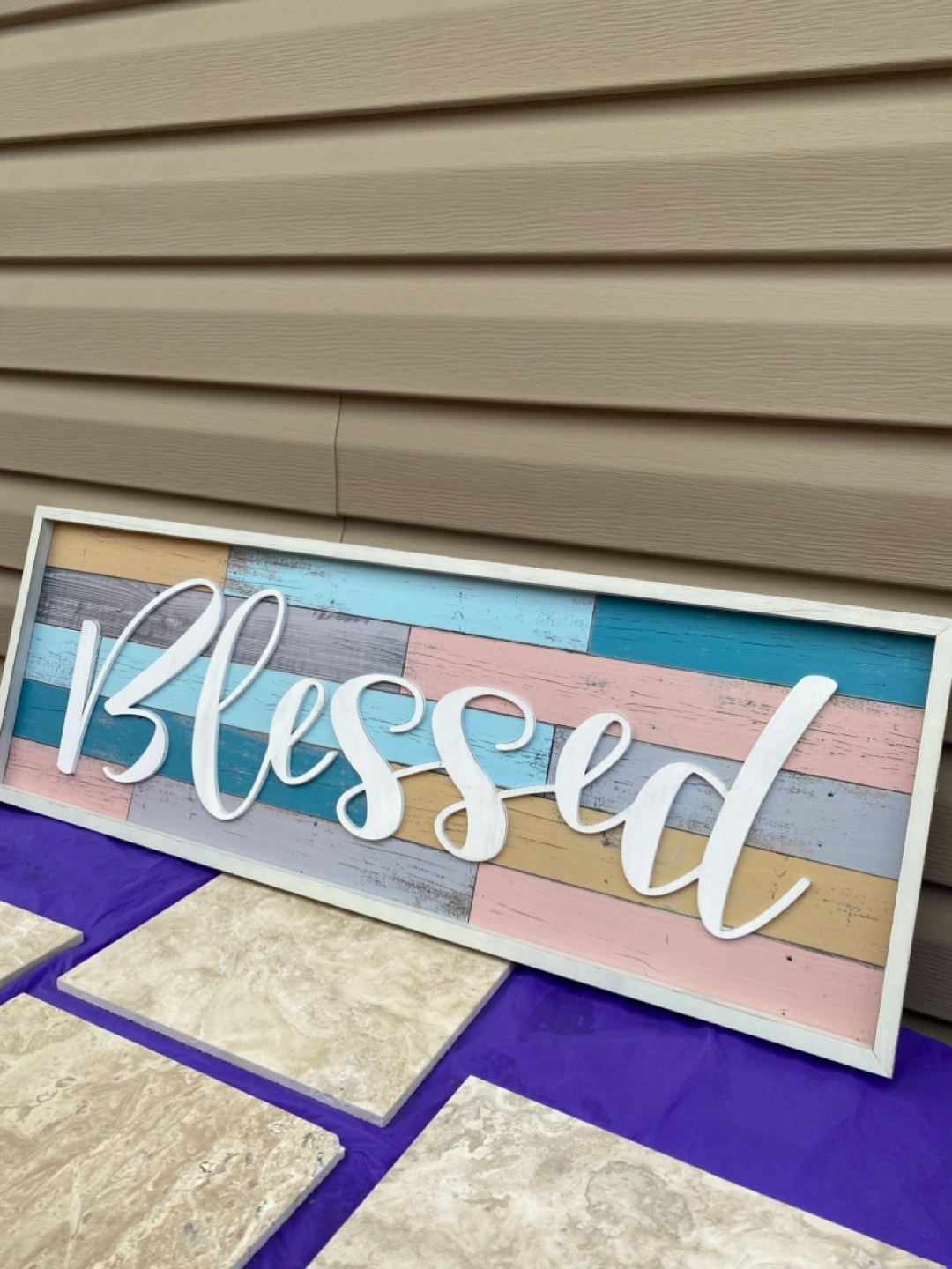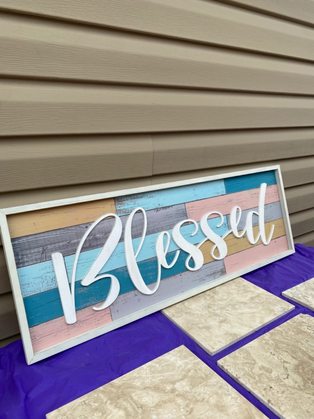 Long rectangular wooden sign. Features the word Blessed in raised white lettering against a pastel-colored wood background. White frame. Perfect for home decor.
