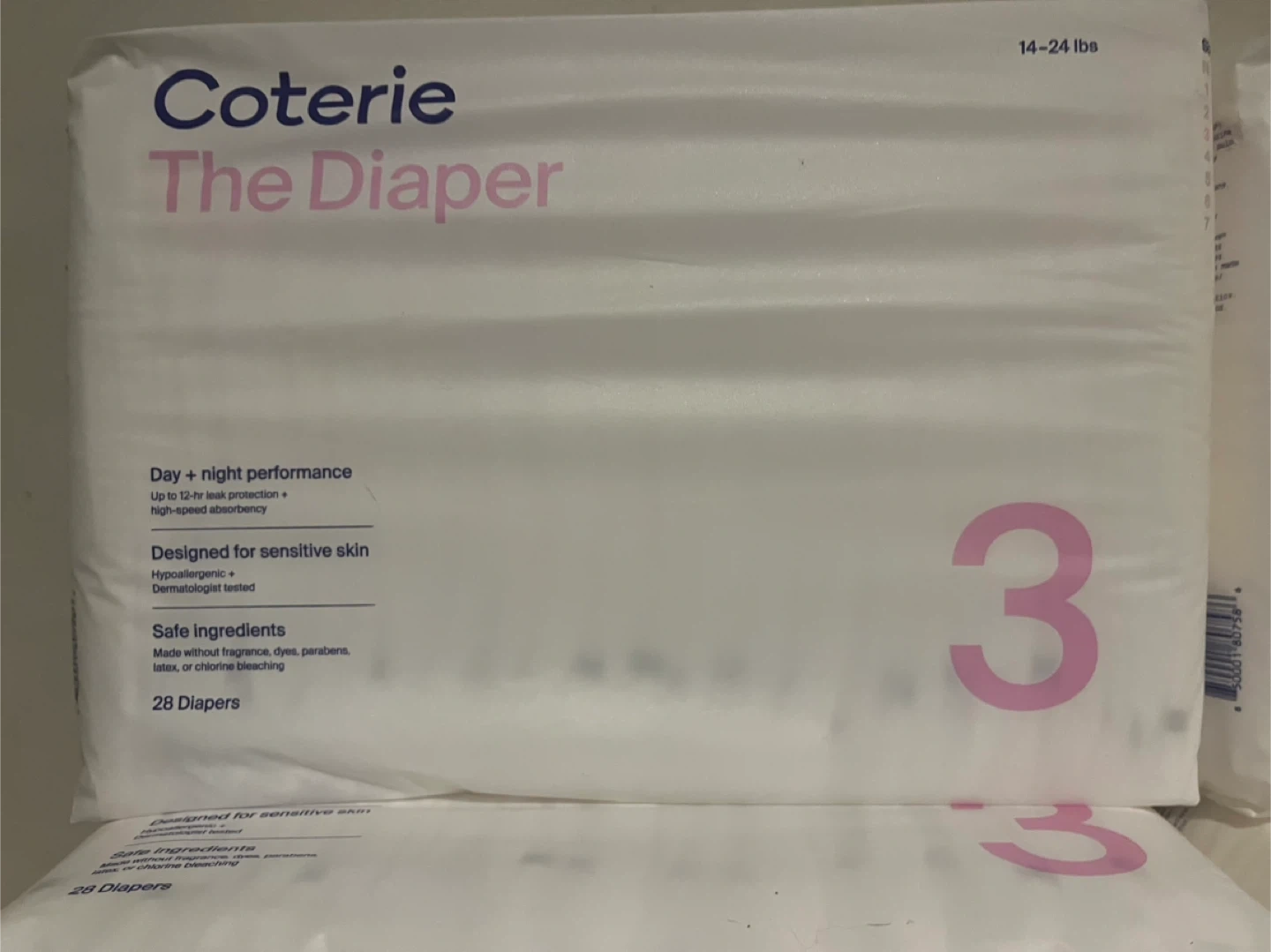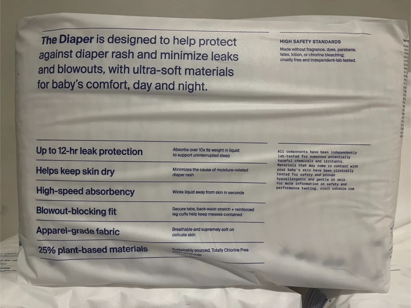 Coterie diapers. A fast wicking, highly absorbent diaper with clean ingredients. New. Size 3 (14-24 lbs): 84 total count for all 3 packs. From smoke pet free and a healthy home.