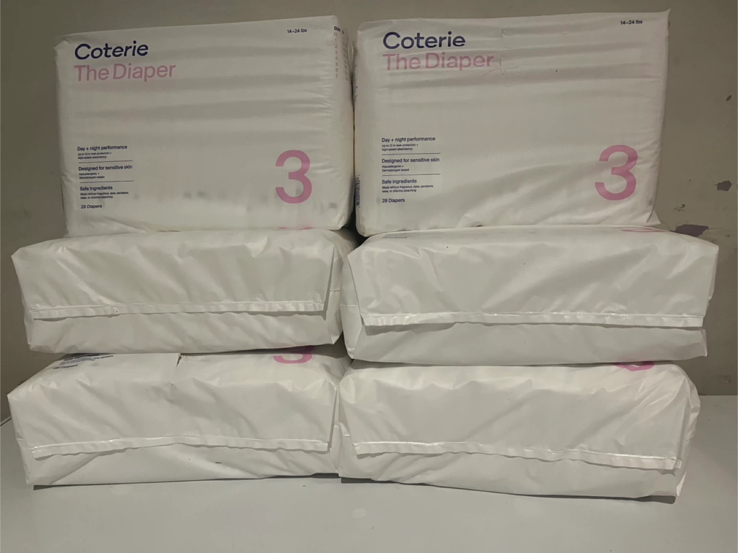 Coterie diapers. A fast wicking, highly absorbent diaper with clean ingredients. New. Size 3 (14-24 lbs): 84 total count for all 3 packs. From smoke pet free and a healthy home.