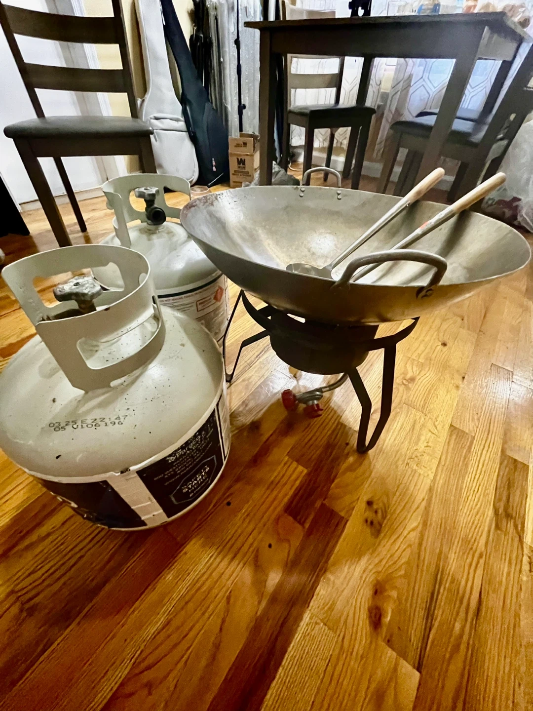 Selling a wok with cooking utensils and two propane tanks. The wok comes with 2 laddles and high pressurize stove. Perfect for kitchen catering ,outdoor cooking!