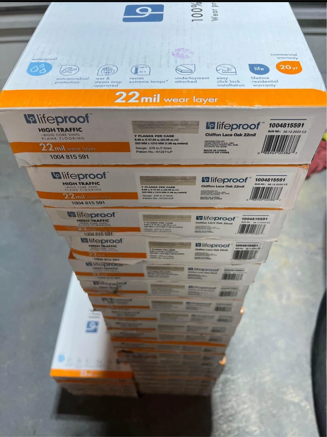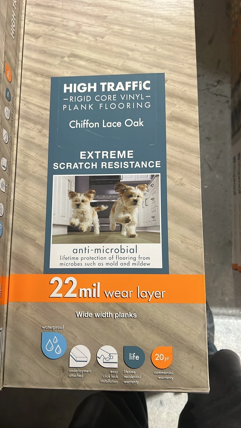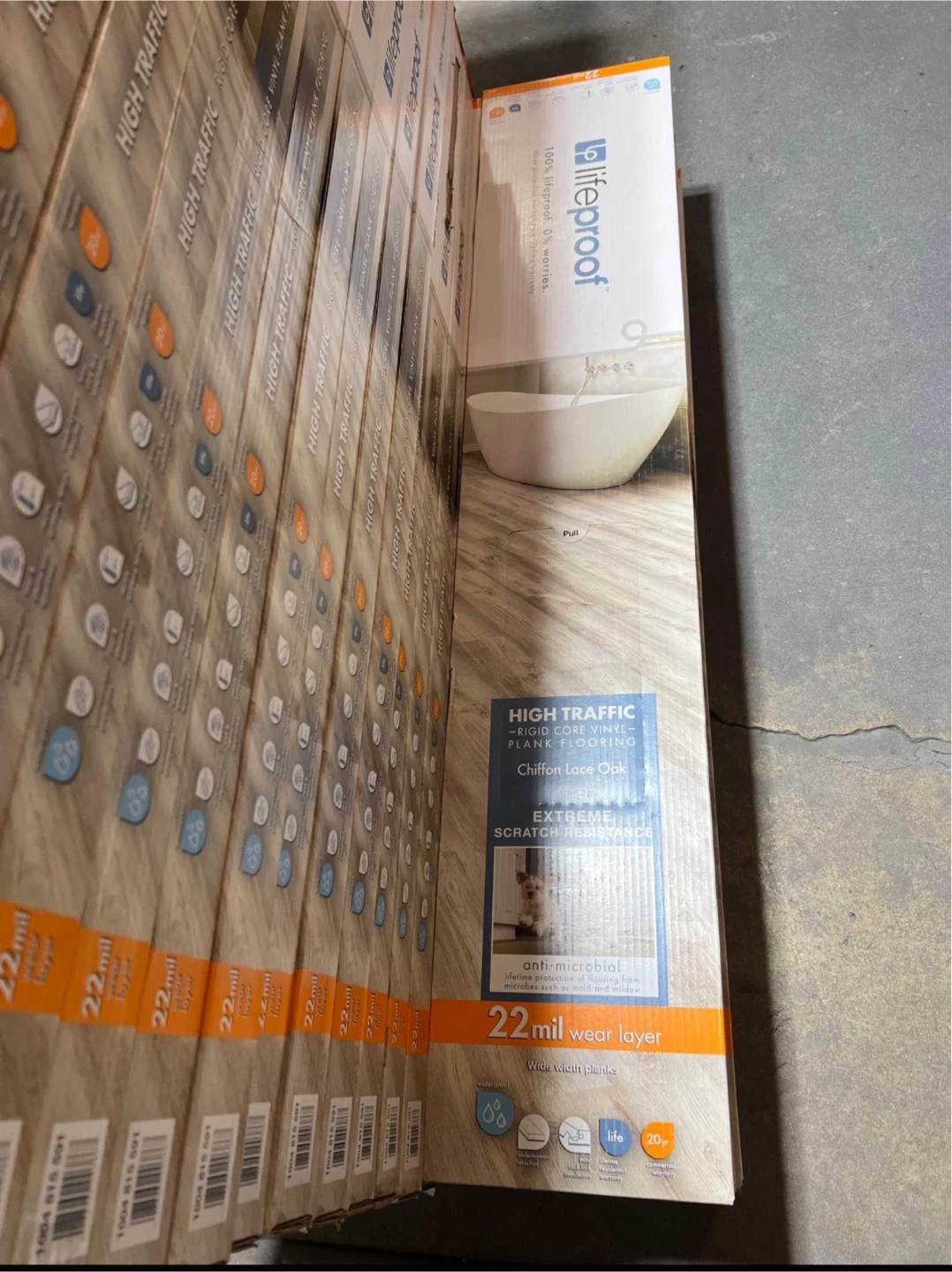 15Selling High Traffic Rigid Core Vinyl Plank Flooring in Chiffon Lace Oak. This flooring offers extreme scratch resistance and is anti-microbial, providing lifetime protection from microbes like mold and mildew. It features a 22 mil wear layer and wide width planks. Waterproof and easy to install with its click lock system. Each case covers 20.1 sq ft I HAVE 60 boxes $48 per box