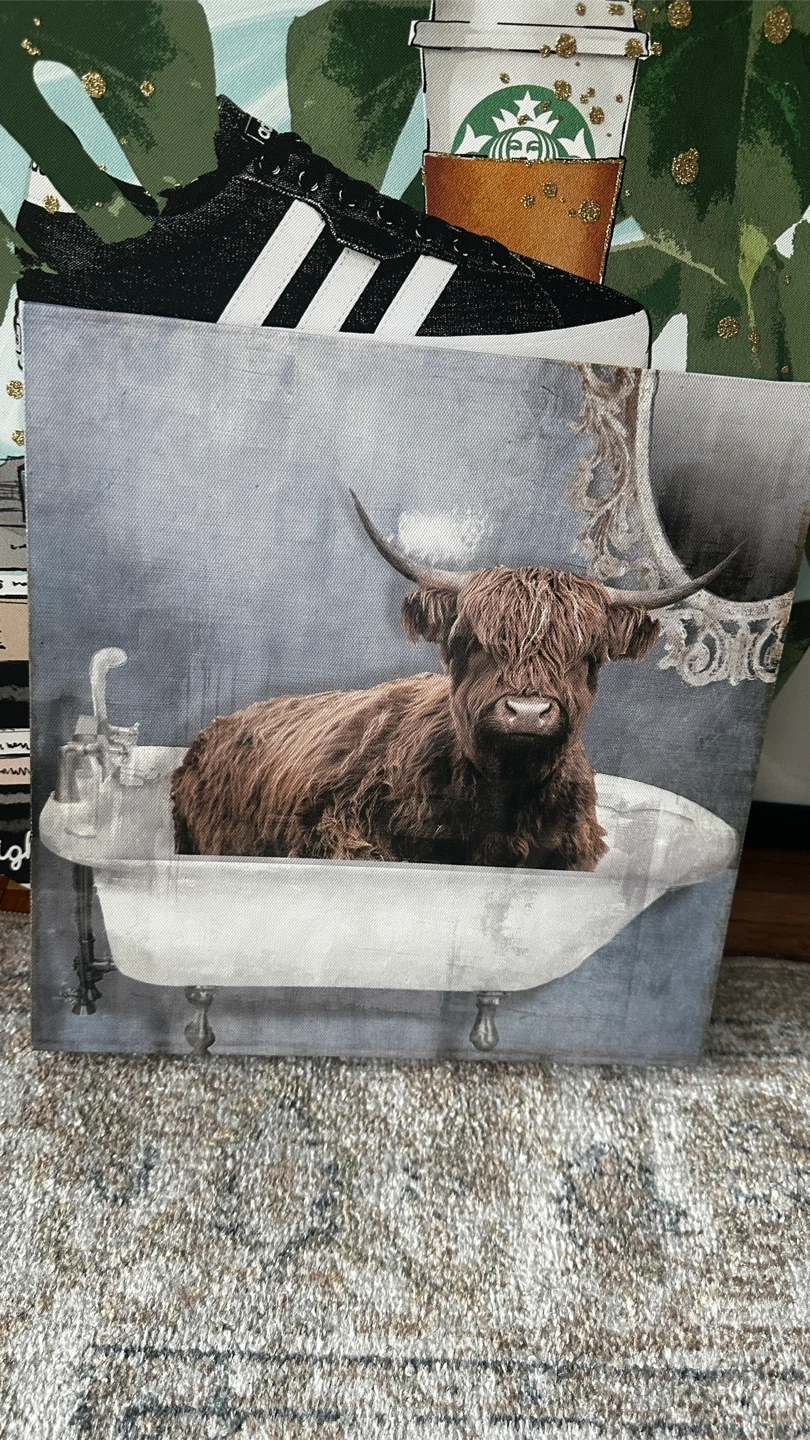 This is a canvas print featuring a Highland cow relaxing in a bathtub. It's a cute and quirky piece of art that would add some fun to any room