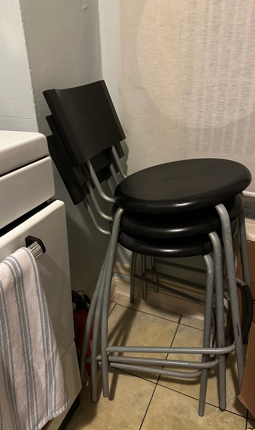 123ALL 3 HIGH TO CHAIRS FOR $5!!! Three high top stools. Can be used as chairs for a breakfast countertop, high top tables, a bar, and outdoor use. The seat and back rest is made of high-performance durable plastic in black color, round seat and a rectangular backrest. The legs of the chairs are metal with a coded finish used typically for outdoor furniture exposed to the weather elements. There is slight wear and tear from rain on one part of the legs. No other damages . in good suitable condition. High top chair Counter top chairs Outdoor chairs Chair Black Metal