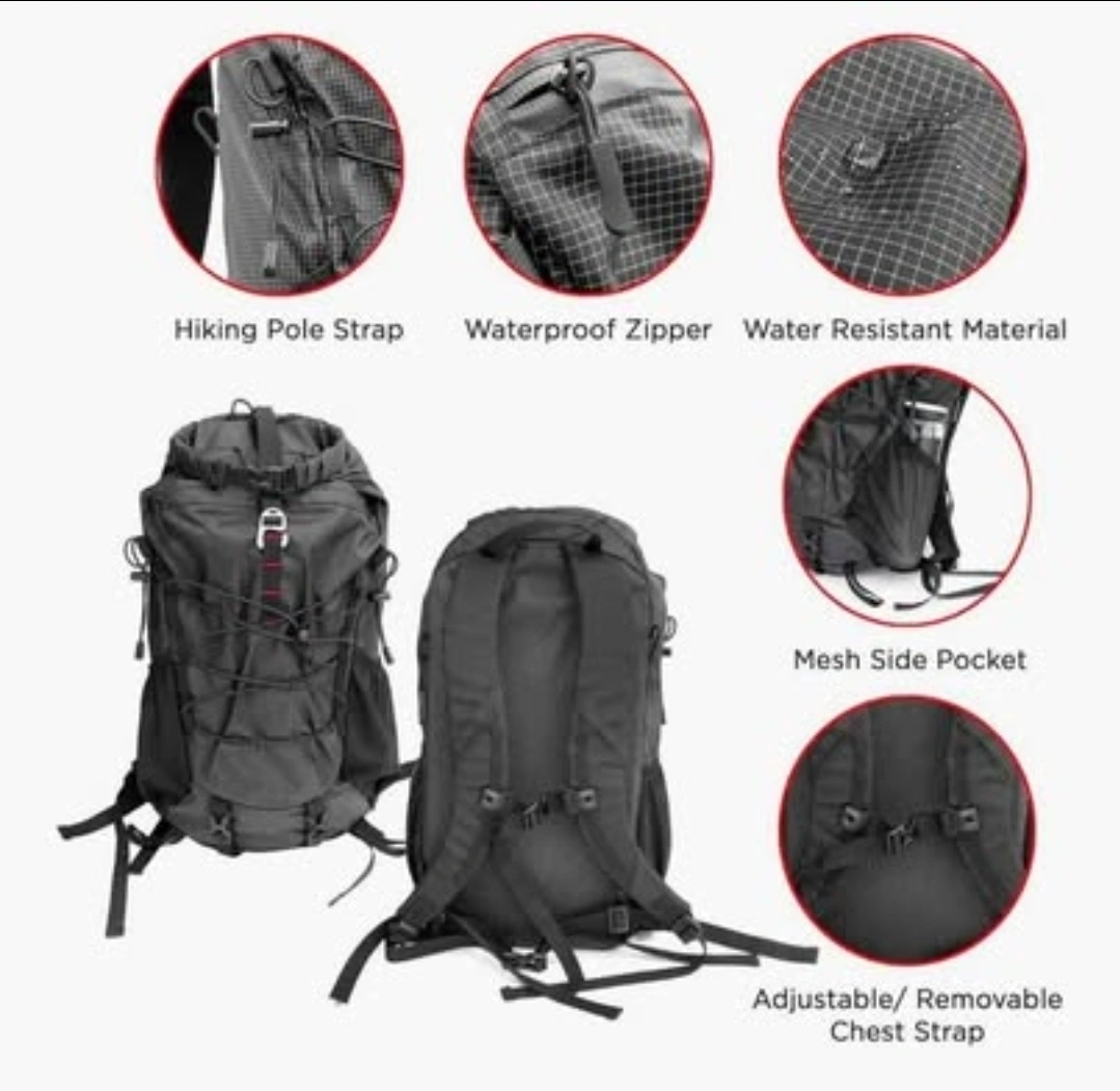 This hiking backpack features a waterproof zipper and water-resistant material, perfect for outdoor adventures! It also has a hiking pole strap, mesh side pocket, and adjustable/removable chest strap. The bag includes a seal buckle, strap buckle, zig-zag shock cord, and attachment straps