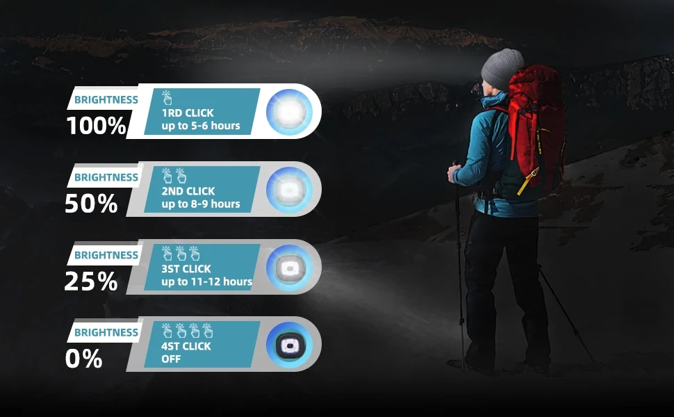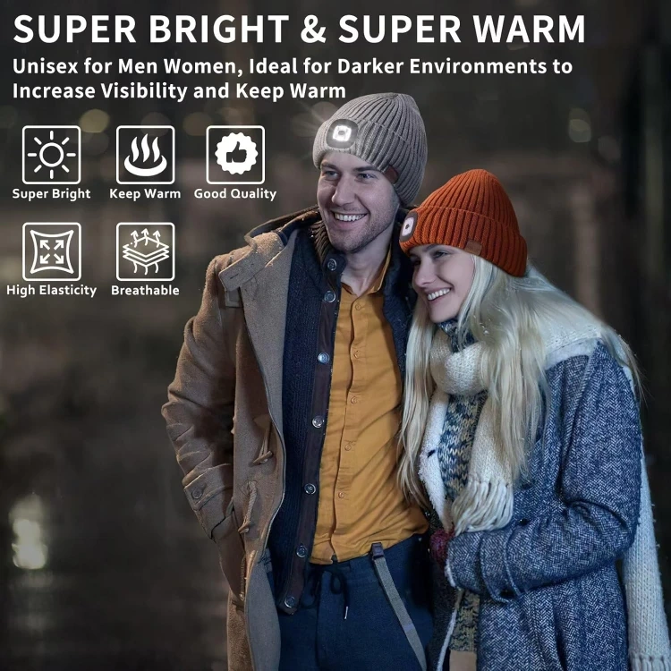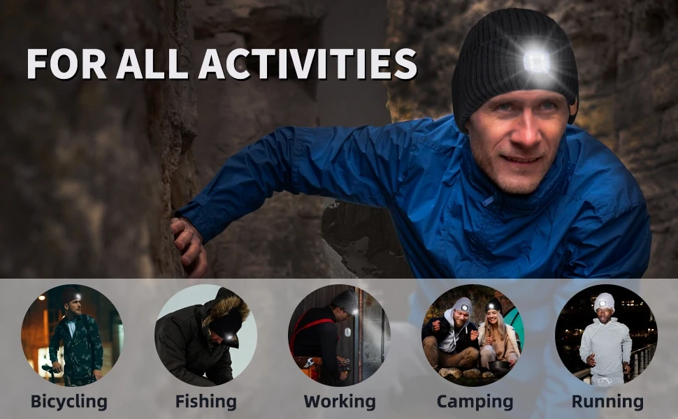 3 Adjustable Brightness: The LED light beanie is designed with 3 brightness levels, you can adjust the brightness of the beanie by pressing button according to your own needs. With larger battery capacity, the light will last up to 5-6 hours in HIGH brightness; 8-9 hours in MEDIUM, and 11-12 hours in the LOW. Great Christmas gifts for men, it will always light your way when you need it.