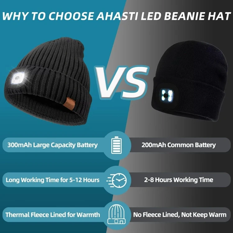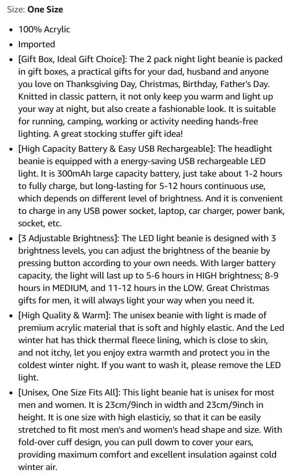 High Capacity Battery & Easy USB Rechargeable: The headlight beanie is equipped with a energy-saving USB rechargeable LED light. It is 300mAh large capacity battery, just take about 1-2 hours to fully charge, but long-lasting for 5-12 hours continuous use, which depends on different level of brightness. And it is convenient to charge in any USB power socket, laptop, car charger, power bank, socket, etc.