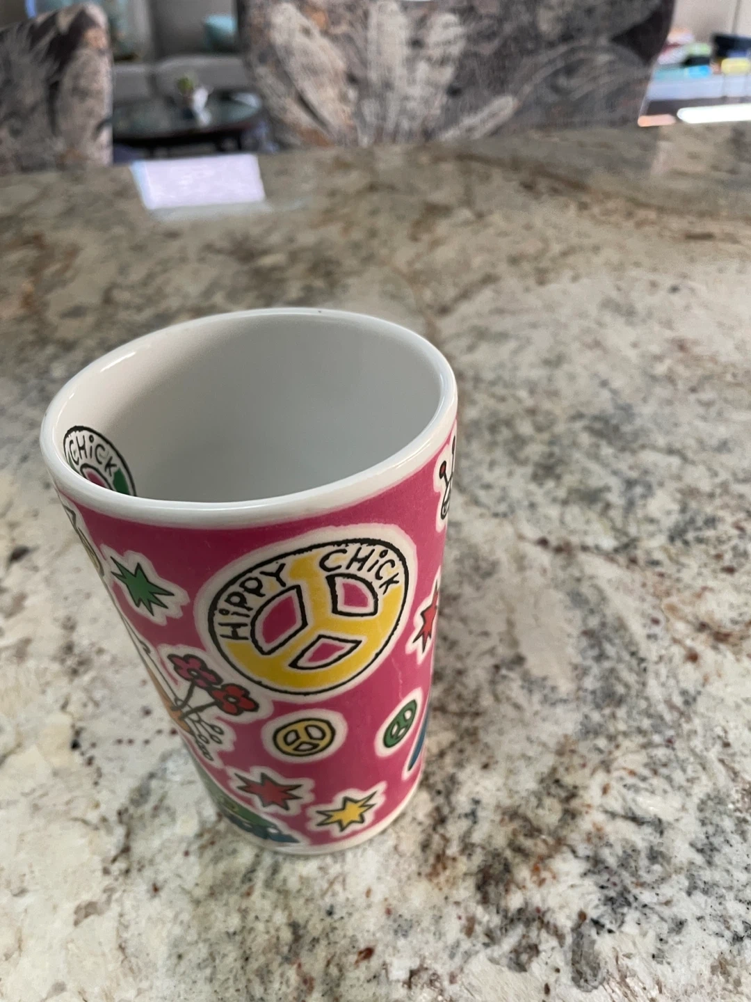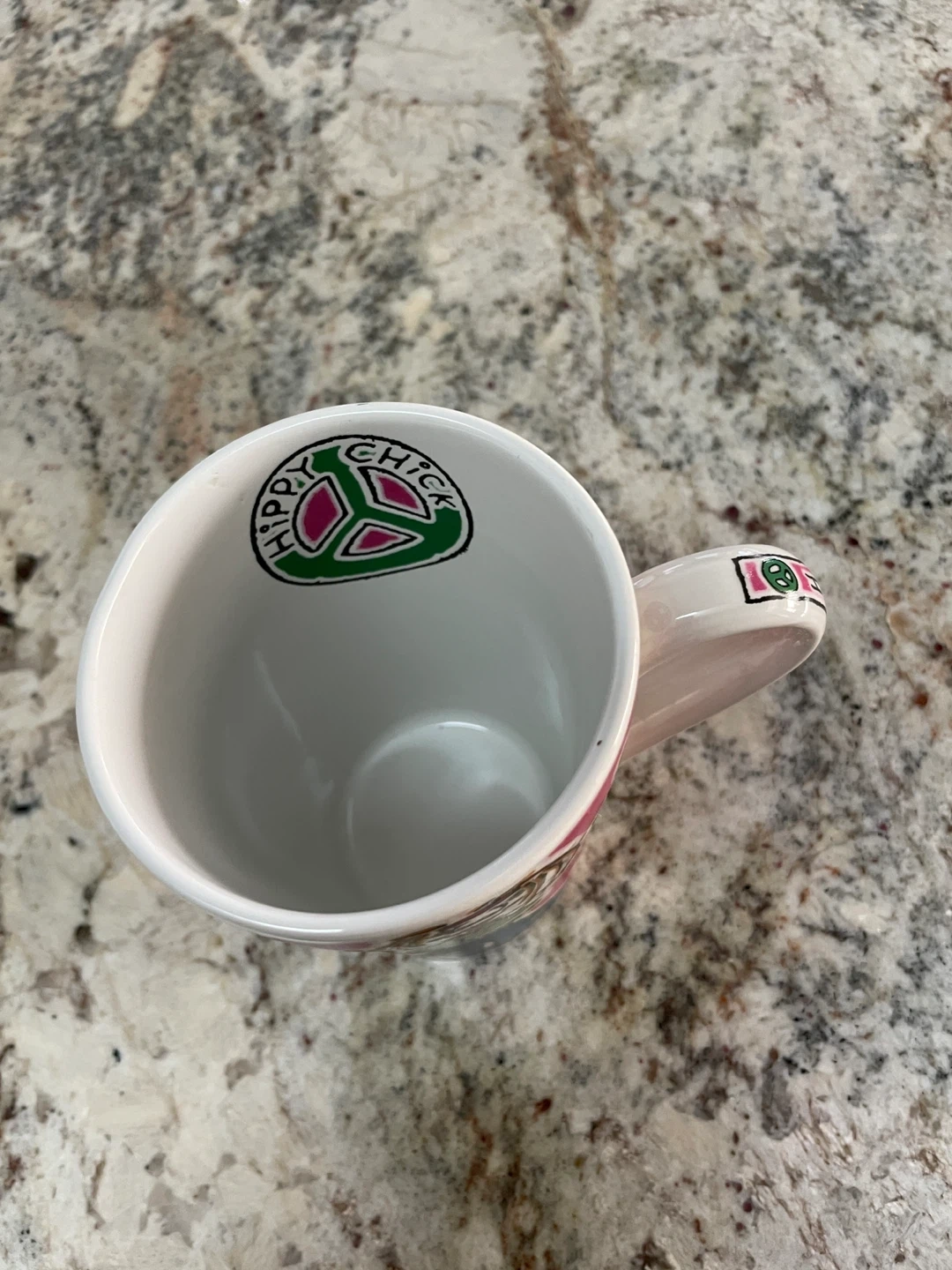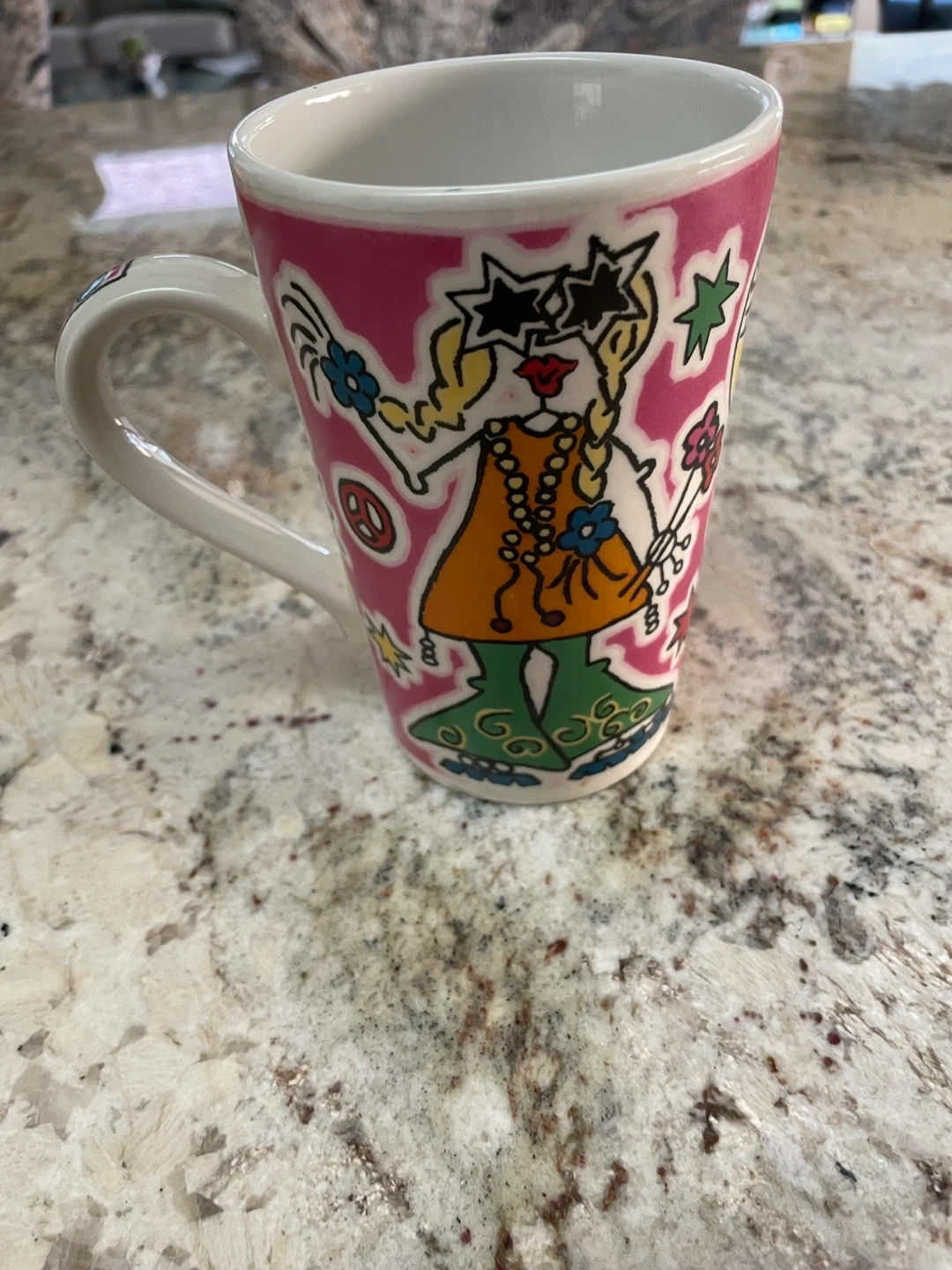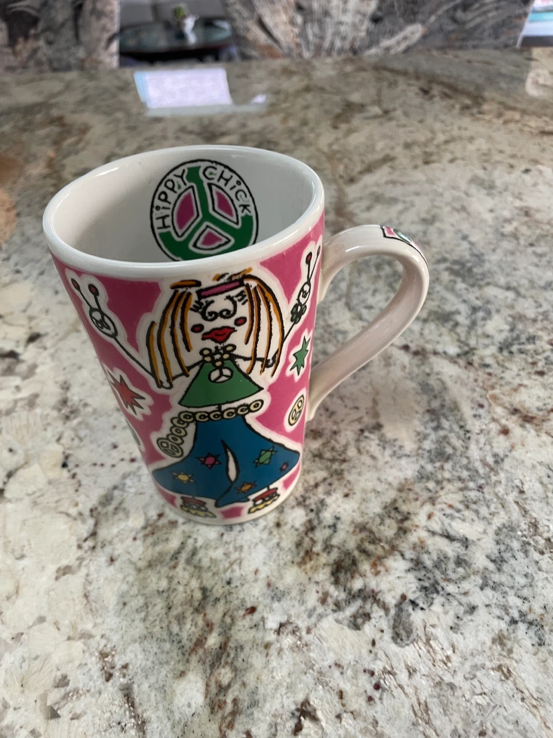 65Selling a fun vintage Hippy Chick mug! It's made in England and has a groovy design with peace signs and flowers. Perfect for adding a bit of retro flair to your morning coffee or tea Made in England (see base). In excellent vintage condition, it holds 14 oz, is 5 1/4” tall with a top diameter of 3 1/2”. Peace sign inside the mug and in numerous places on the exterior. Colorful, beaded chicks in bell bottoms. Flower power! Super fun! Likely very late 60’s or early 70’s. Would make a great gift!