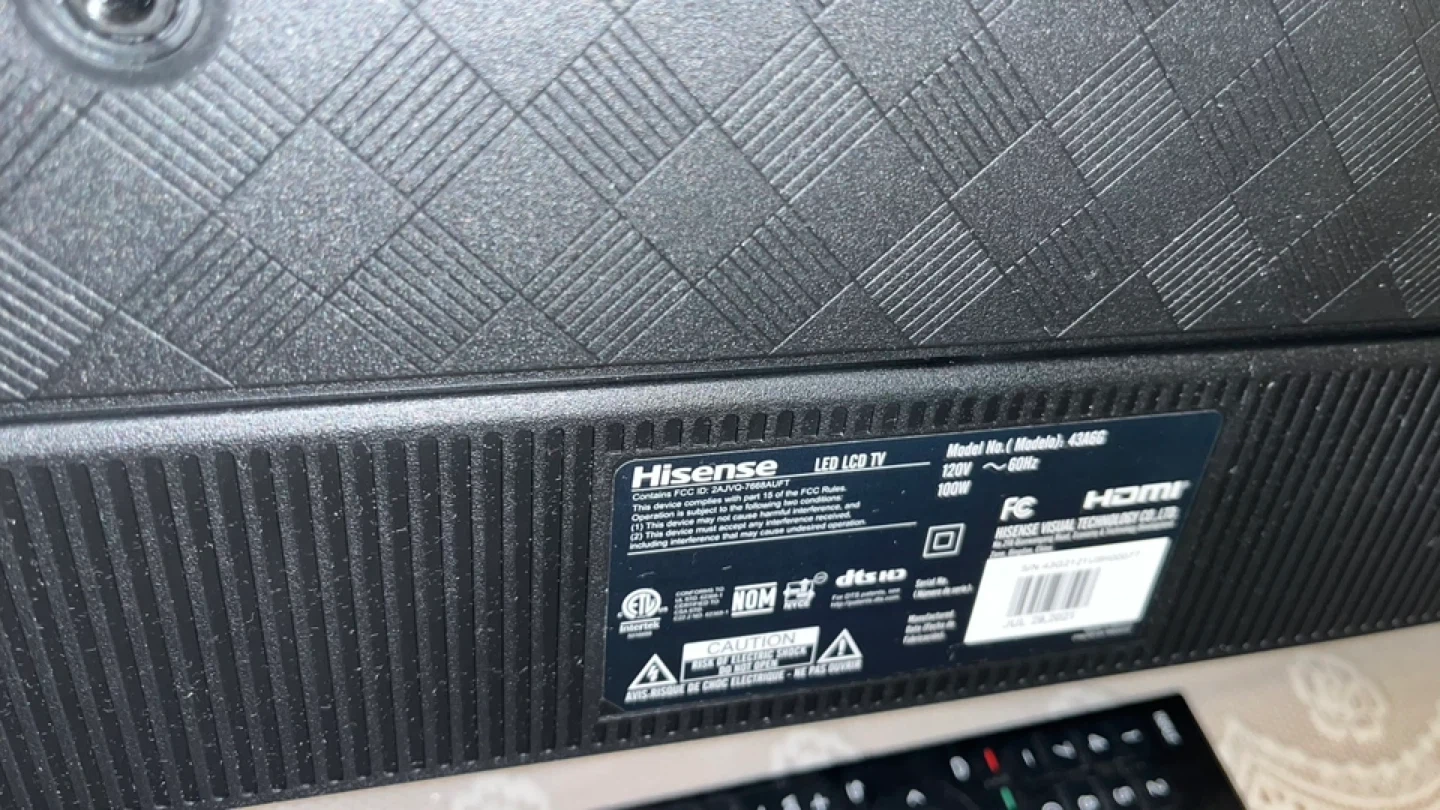 Selling a Hisense 43-inch LED LCD TV, model 43S6G. It operates at 120V and 60Hz with a power consumption of 100W. This TV is equipped with HDMI connectivity for high-quality audio and video transmission. Originally bought for $300+