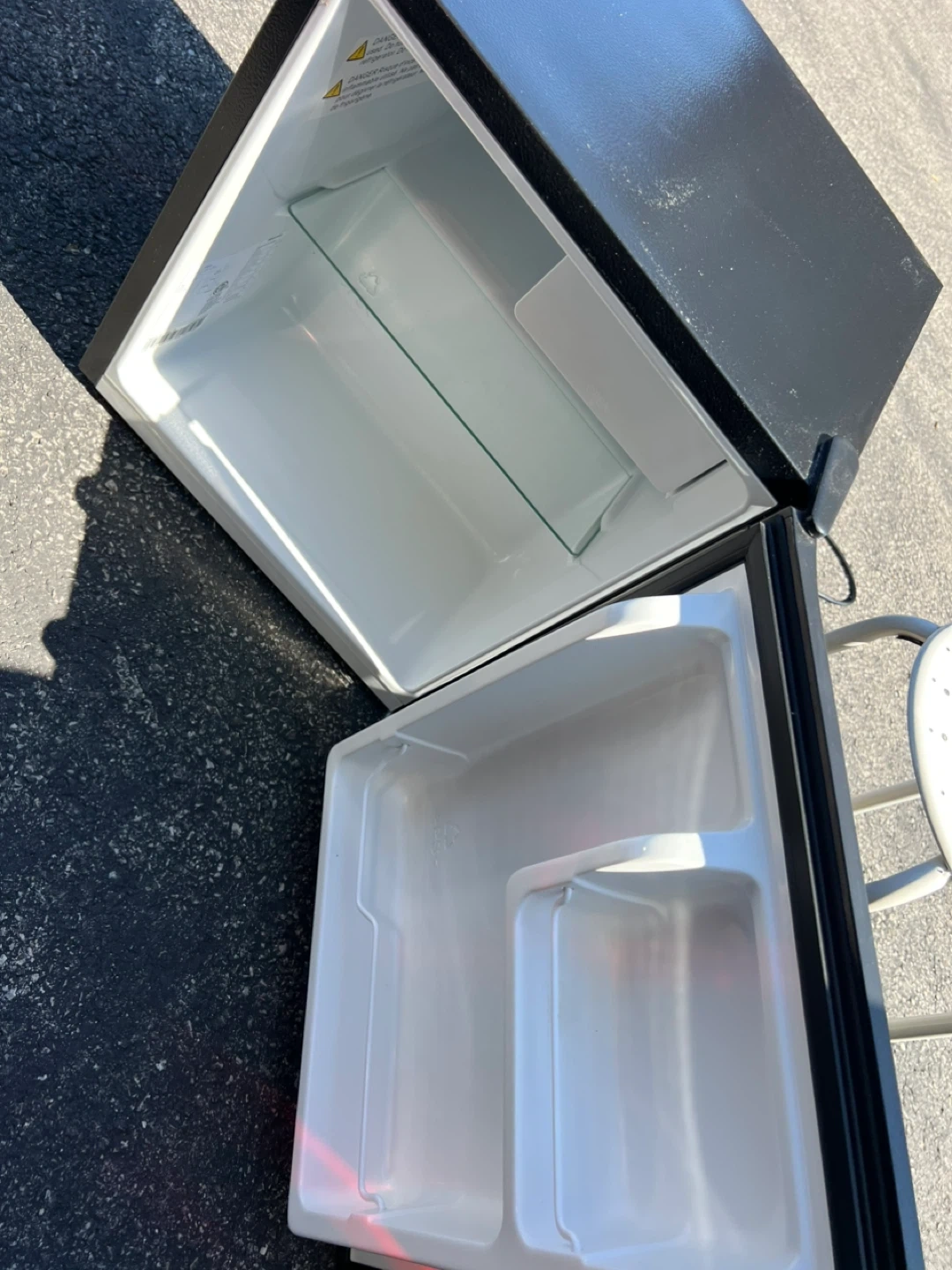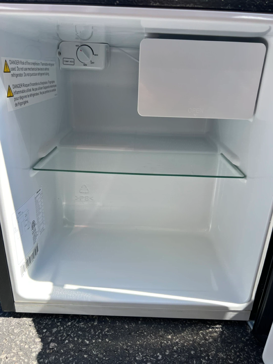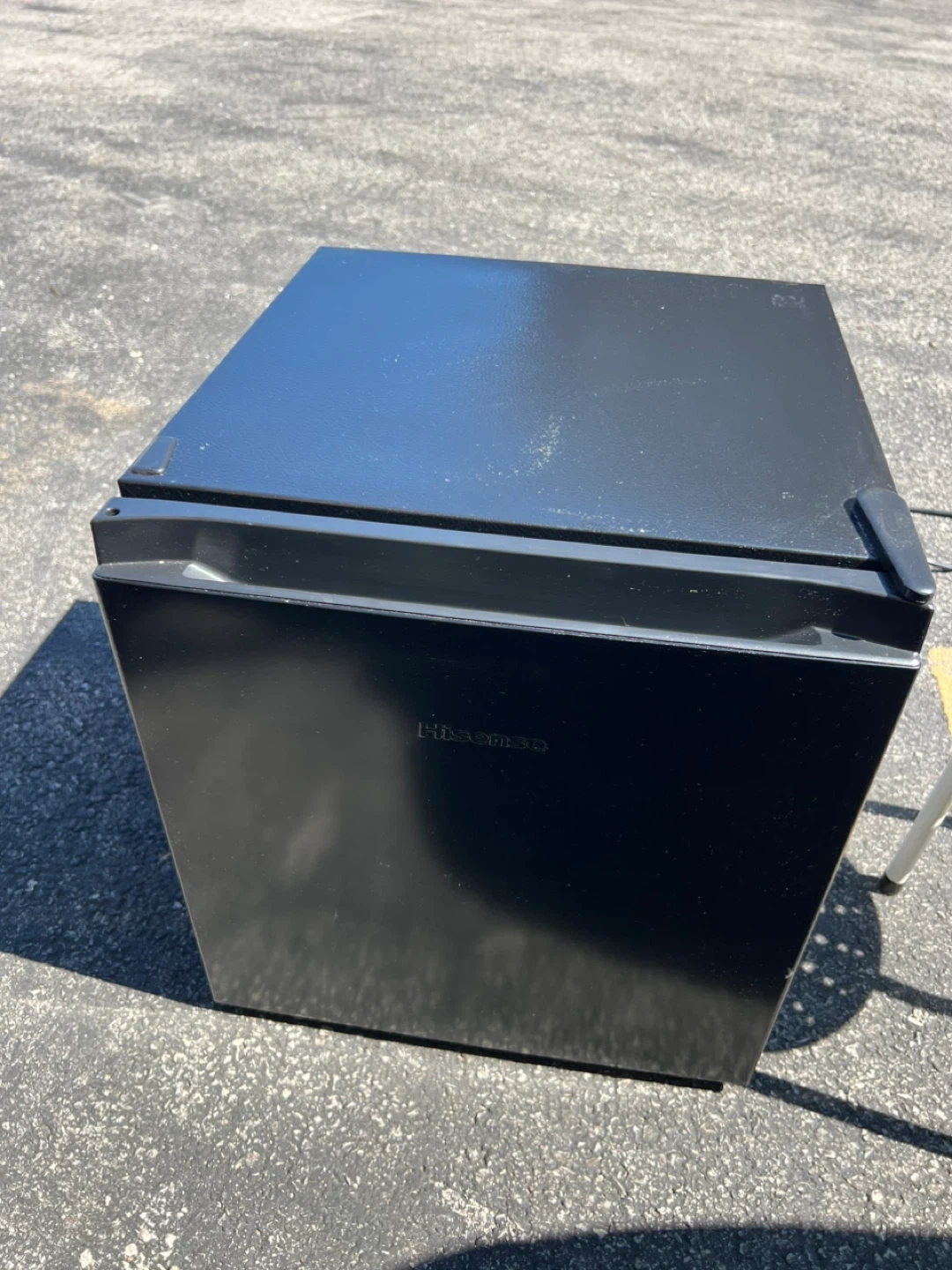 Selling a compact Hisense refrigerator in black. It's in good condition and perfect for a dorm room, office, or small apartment. Features include adjustable temperature control and a glass shelf.