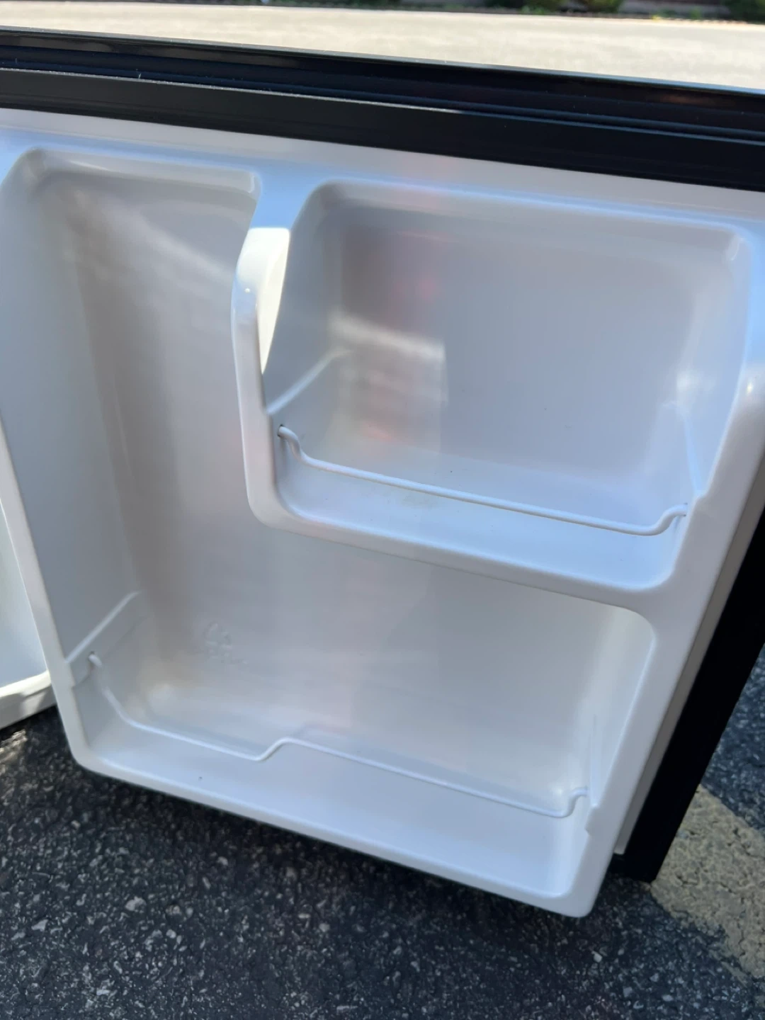 Selling a compact Hisense refrigerator in black. It's in good condition and perfect for a dorm room, office, or small apartment. Features include adjustable temperature control and a glass shelf.