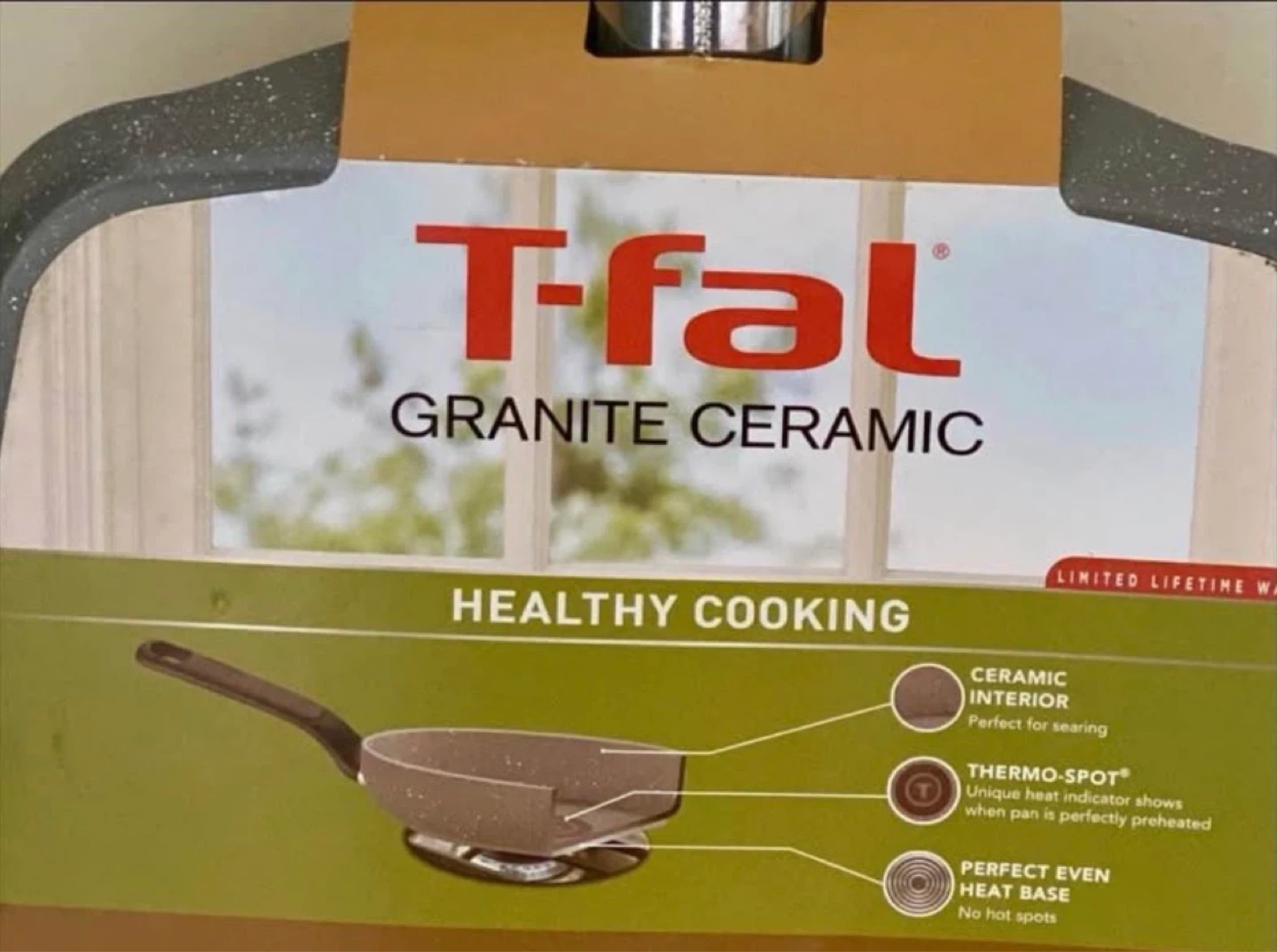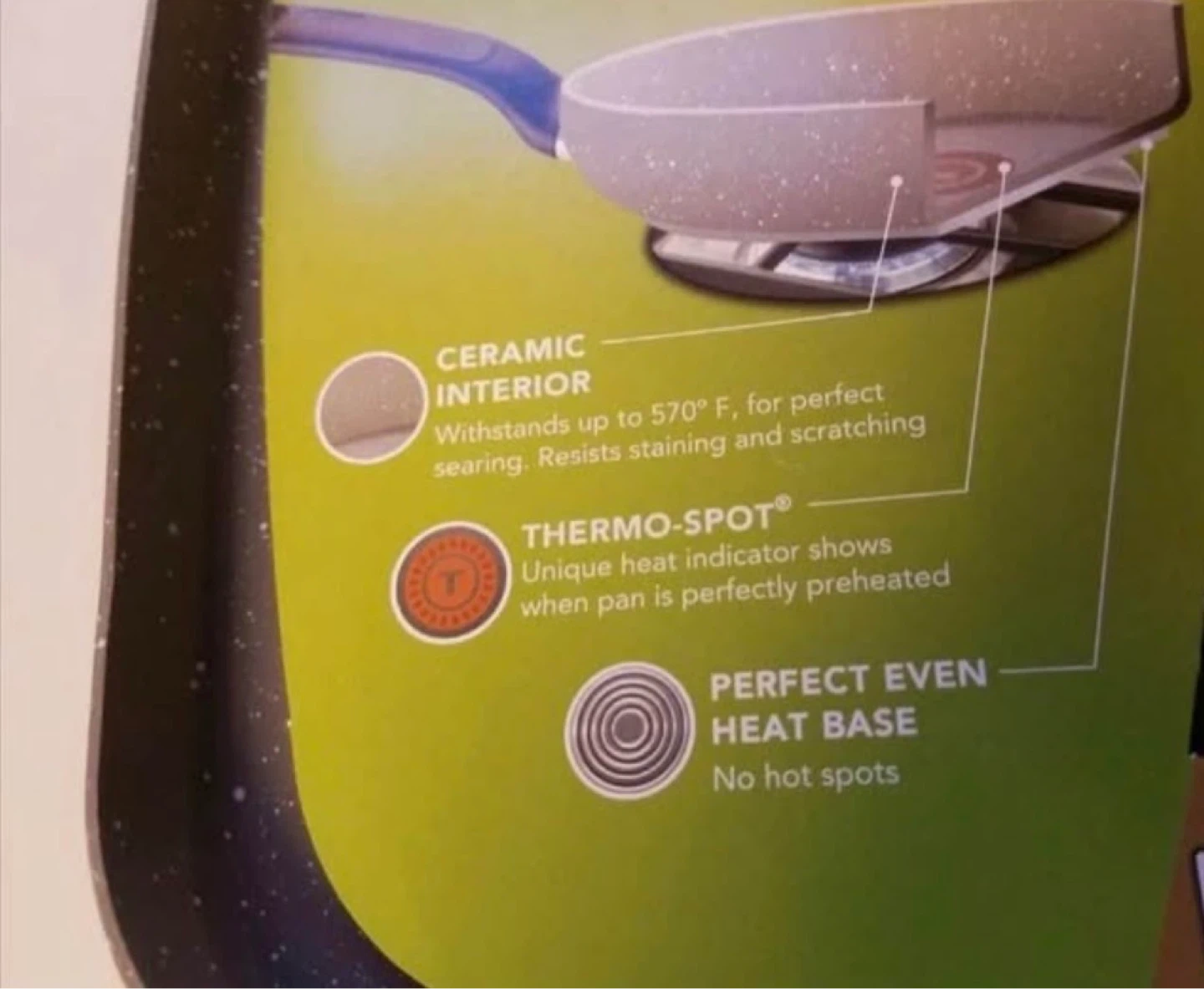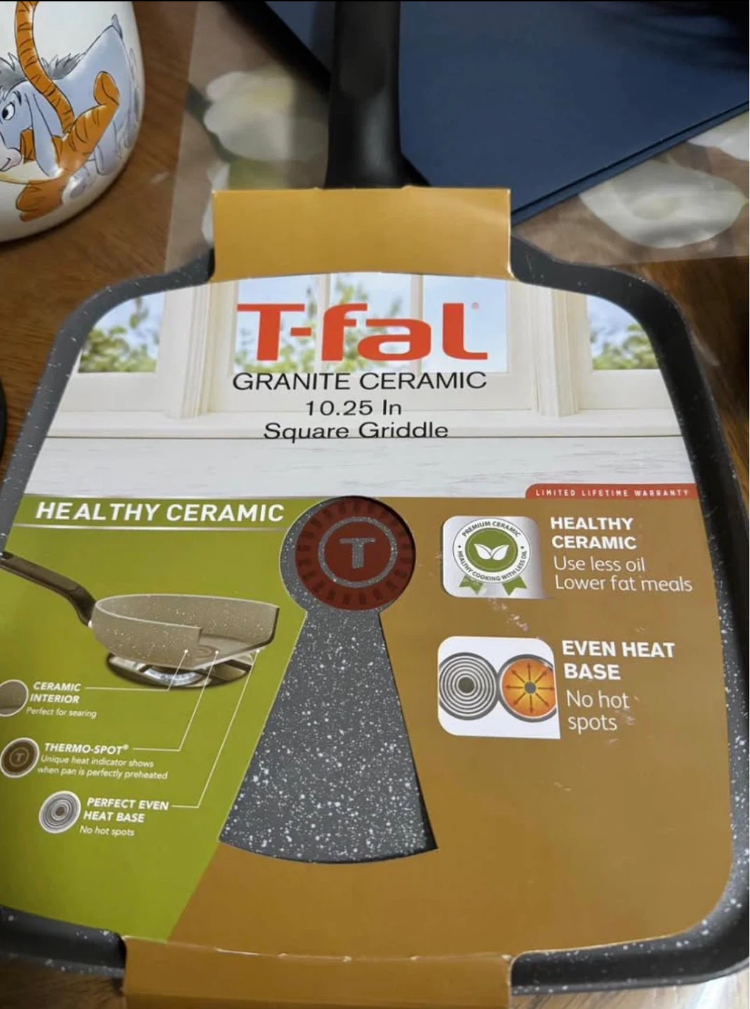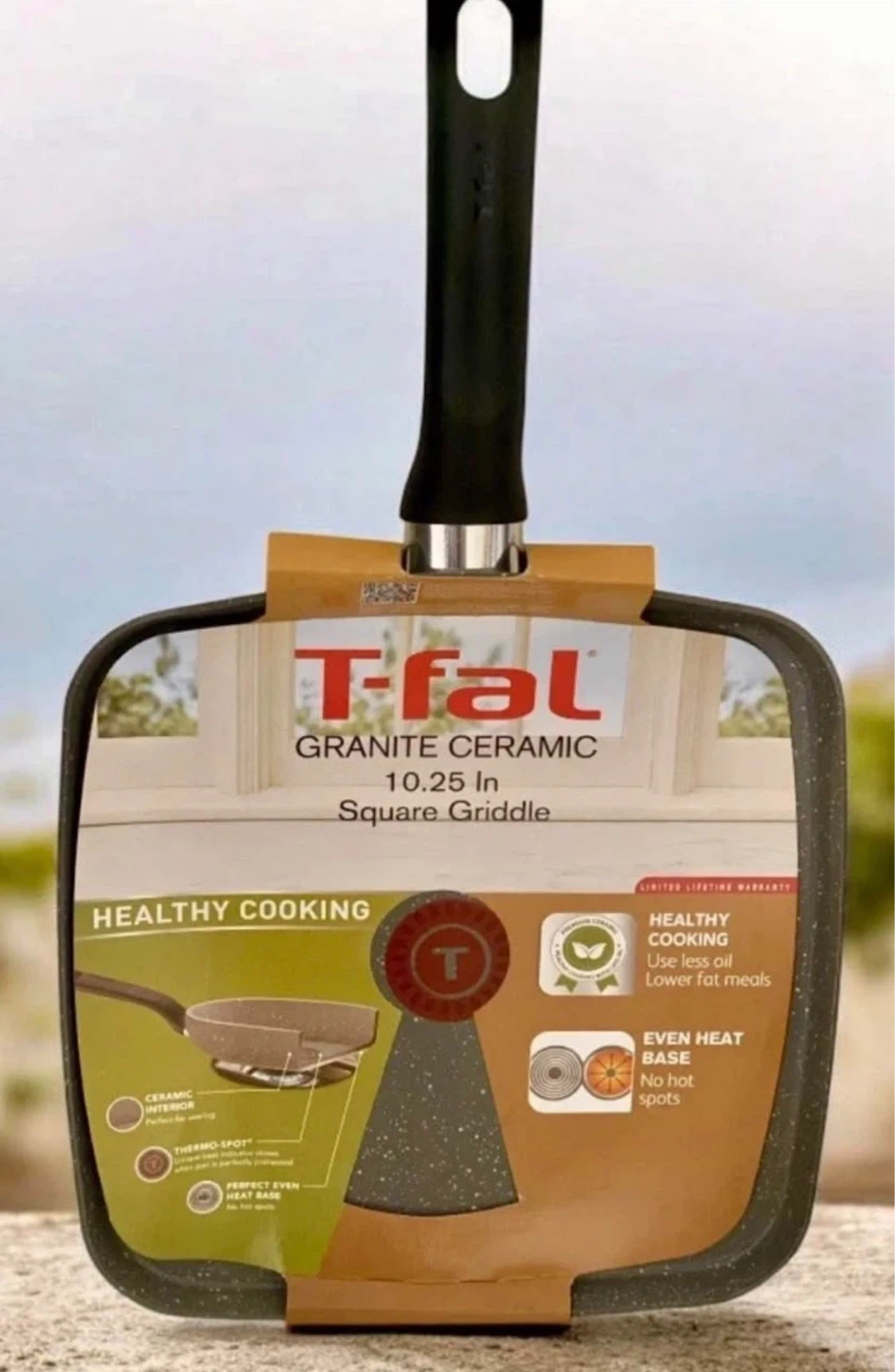 This T-fal griddle features a granite ceramic interior that withstands up to 570 degrees F. It resists staining and scratching and has a Thermo-Spot indicator. The base is designed for perfect, even heat with no hot spots. It's great for searing and uses less oil for healthier meals!