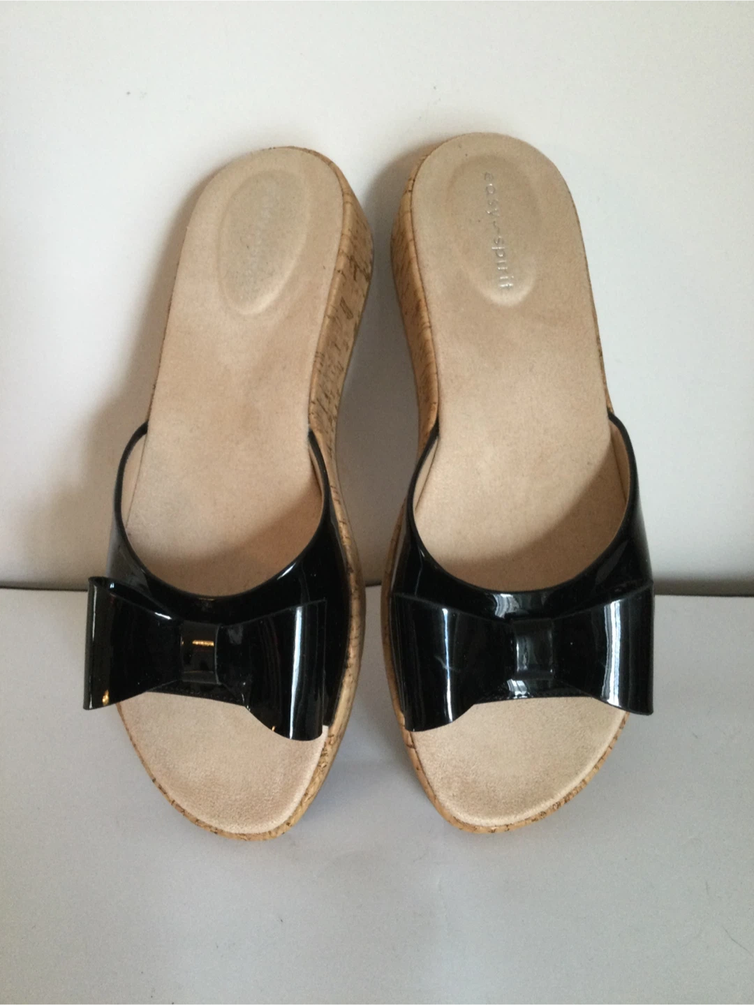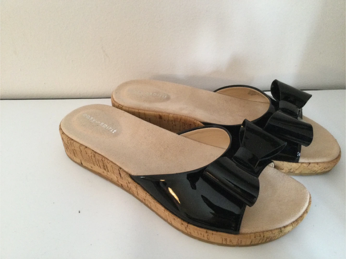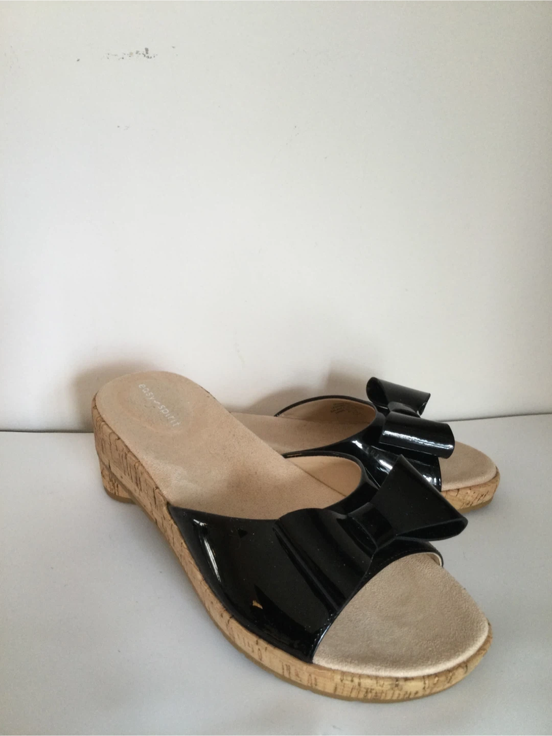 These Easy Spirit slide sandals are black with a patent finish and a decorative bow. They feature a cork wedge sole. They're comfortable slides for casual wear.