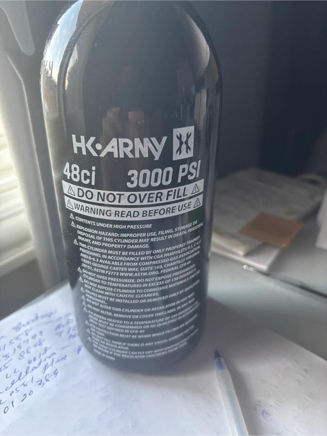 Selling an HK Army 48ci 3000 PSI tank! It's in good condition and ready for your next game Brand new air’ed up once found my paint ball gun was defective and now I have no need for it Moving need it gone