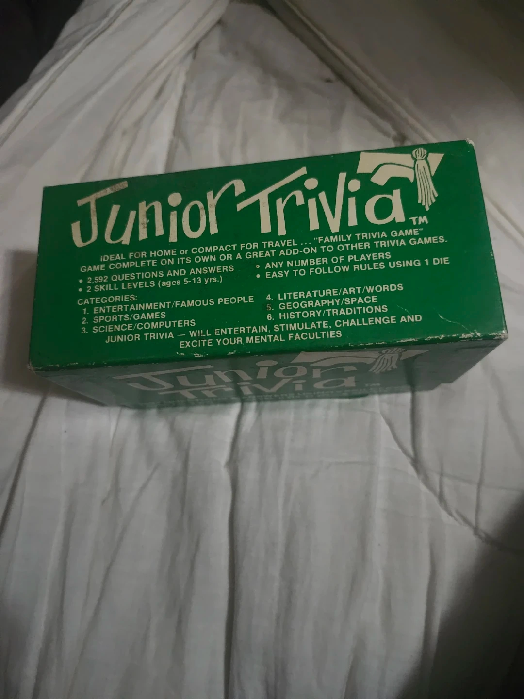 This is the Junior Trivia "Family Trivia Game". It's ideal for home or travel and includes 2,592 questions and answers across 6 categories. The game has 2 skill levels suitable for ages 5-13 years.