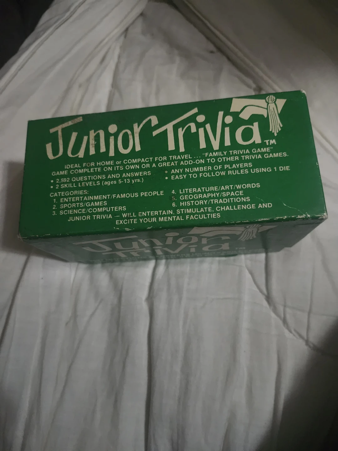 This is the Junior Trivia "Family Trivia Game". It's ideal for home or travel and includes 2,592 questions and answers across 6 categories. The game has 2 skill levels suitable for ages 5-13 years.