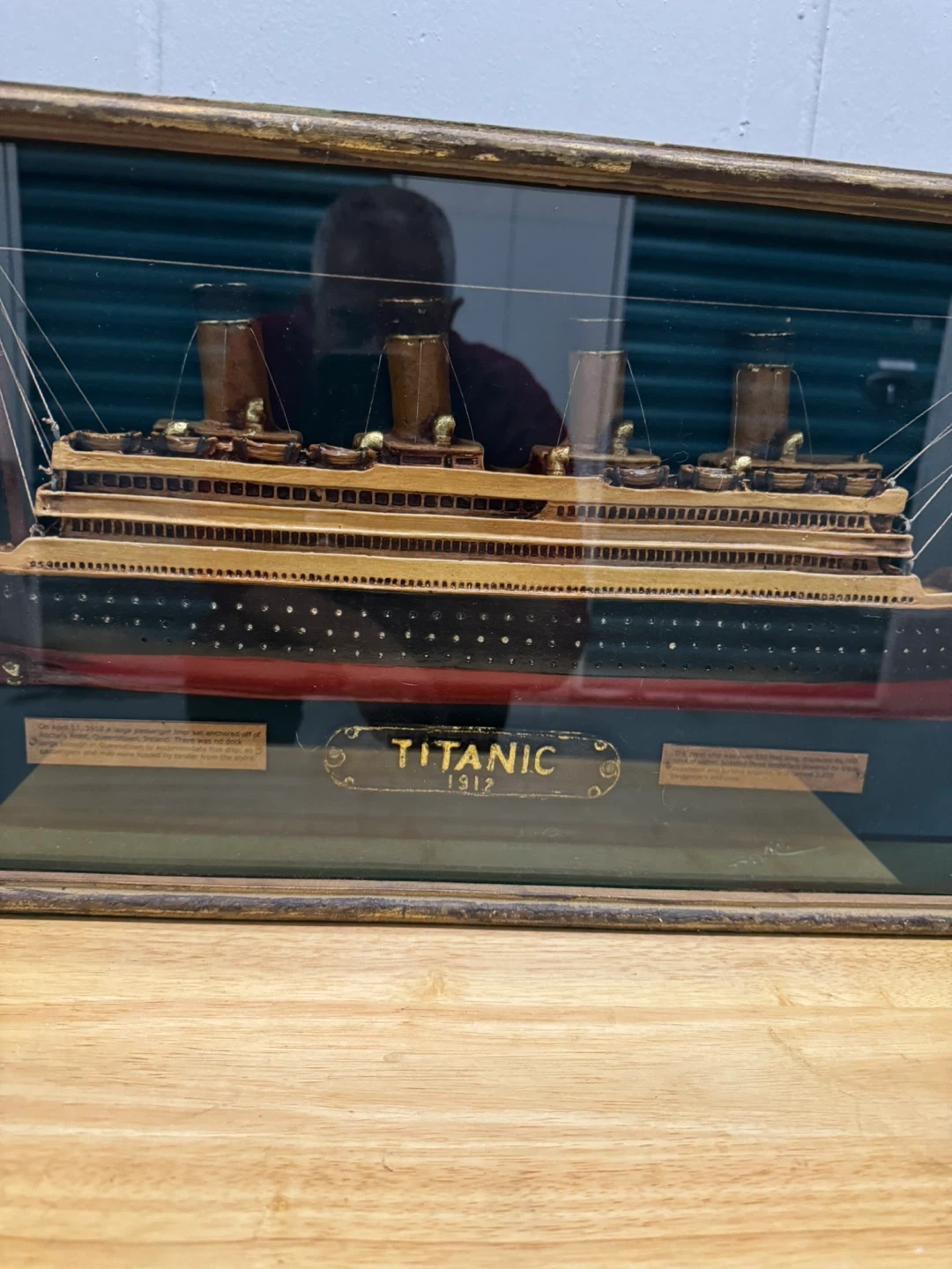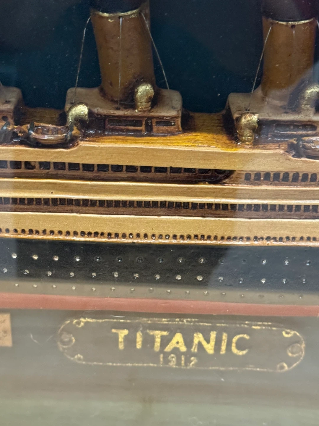Selling a detailed model of the Titanic from 1912, displayed in a protective case. It includes historical images and information about the ship and its passengers. A great piece for any history buff or collector!