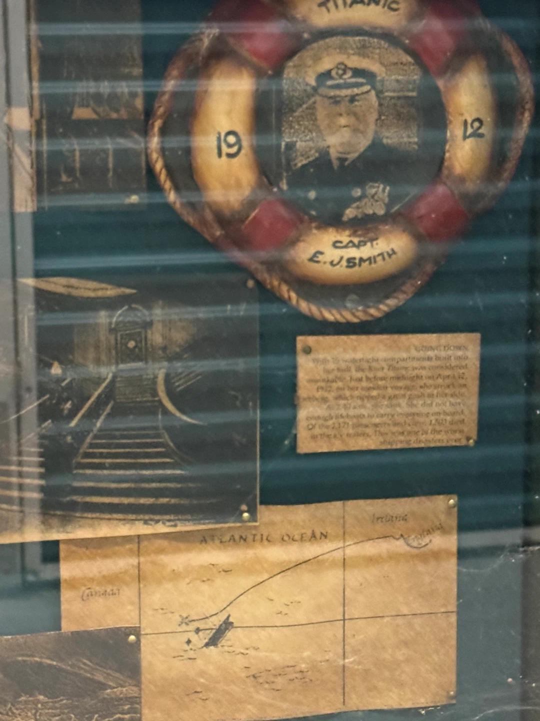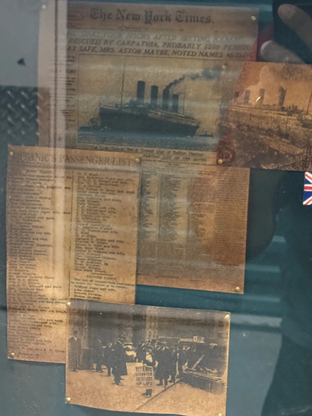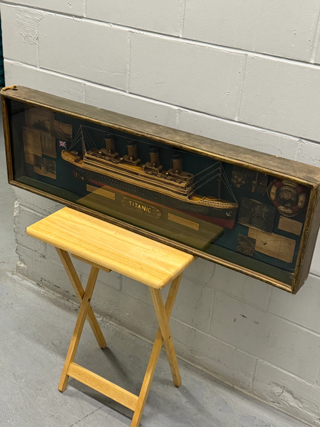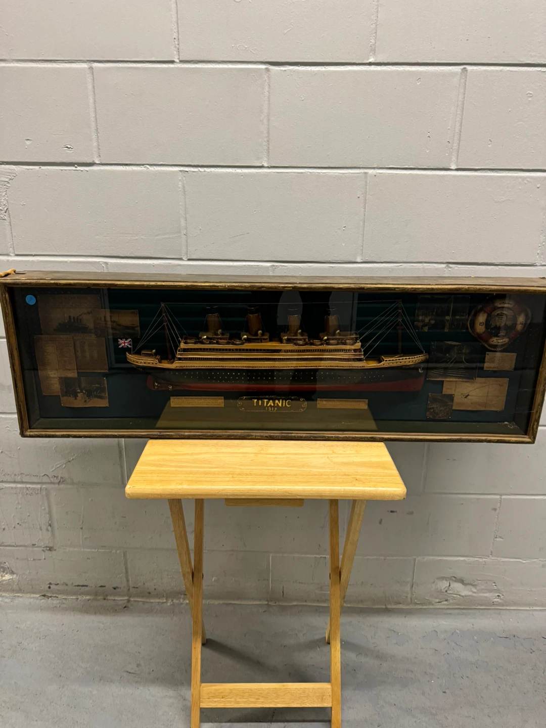 Selling a detailed model of the Titanic from 1912, displayed in a protective case. It includes historical images and information about the ship and its passengers. A great piece for any history buff or collector!
