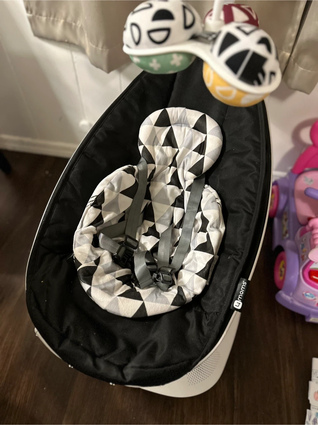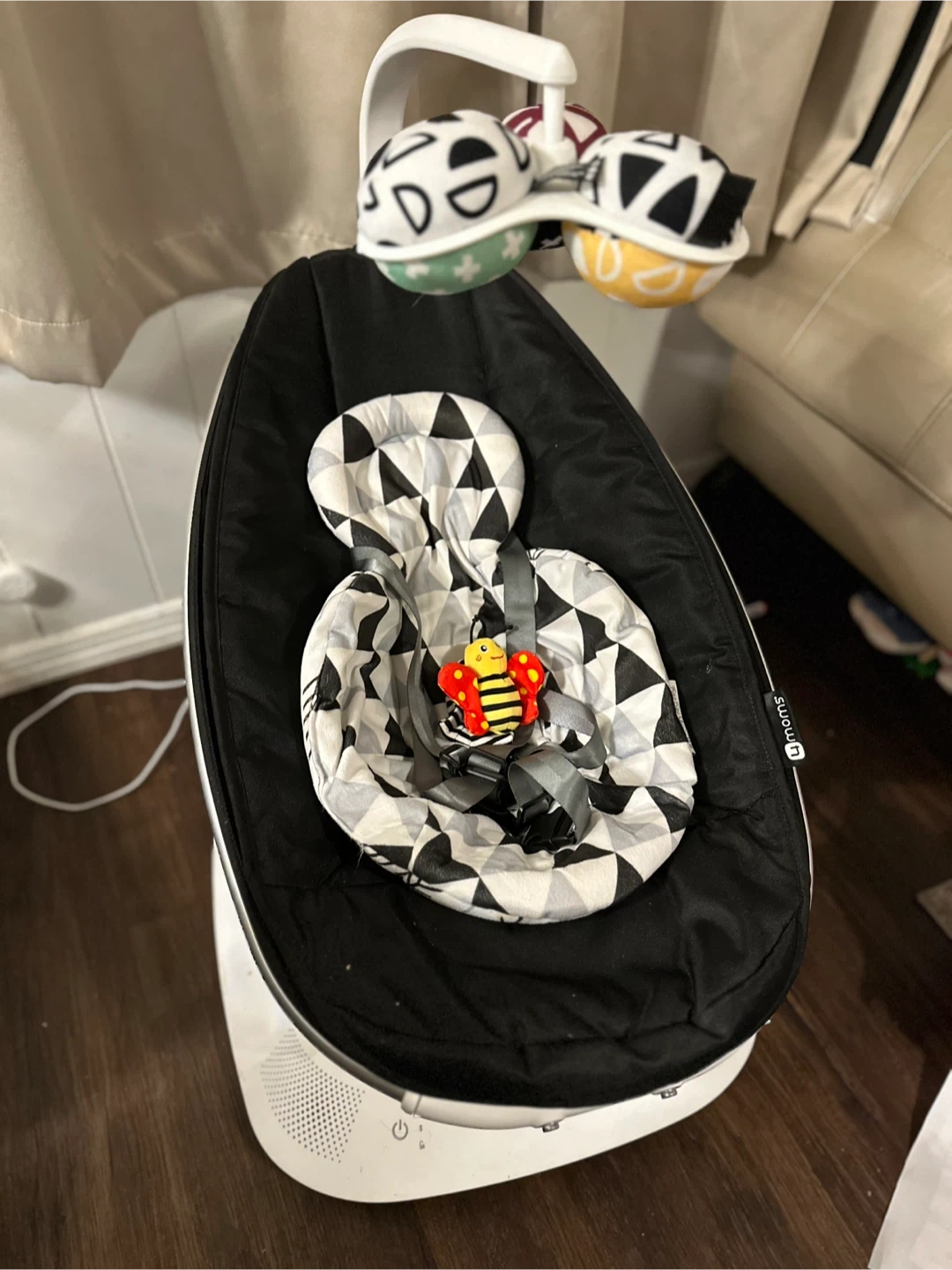 This 4moms Mamaroo bouncer is in great condition. It features a black base with a gray and white patterned seat. Includes a mobile with plush toys.