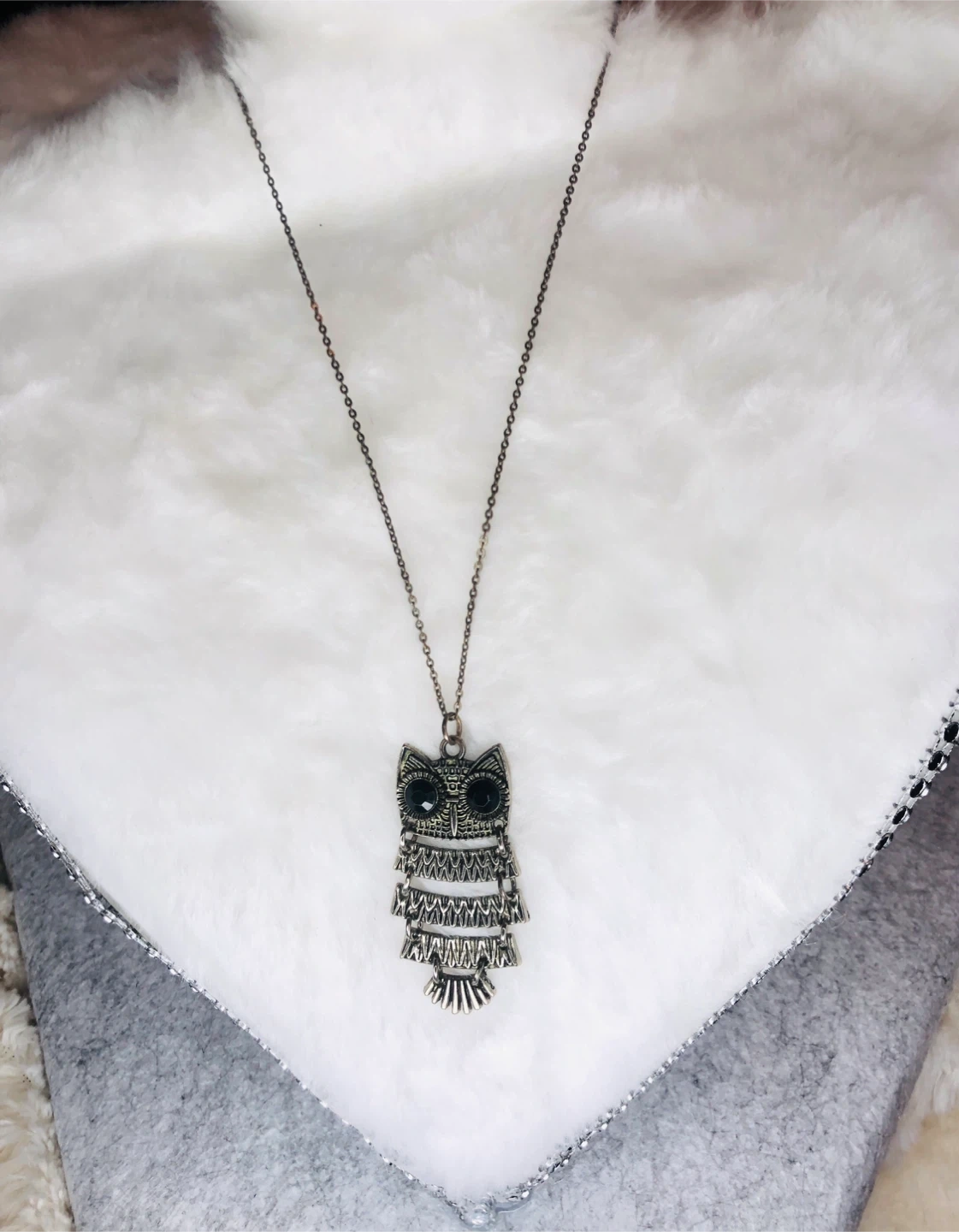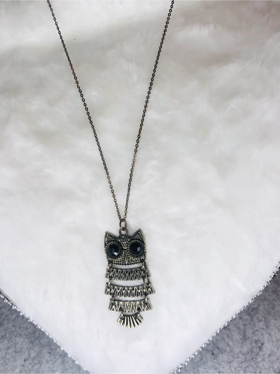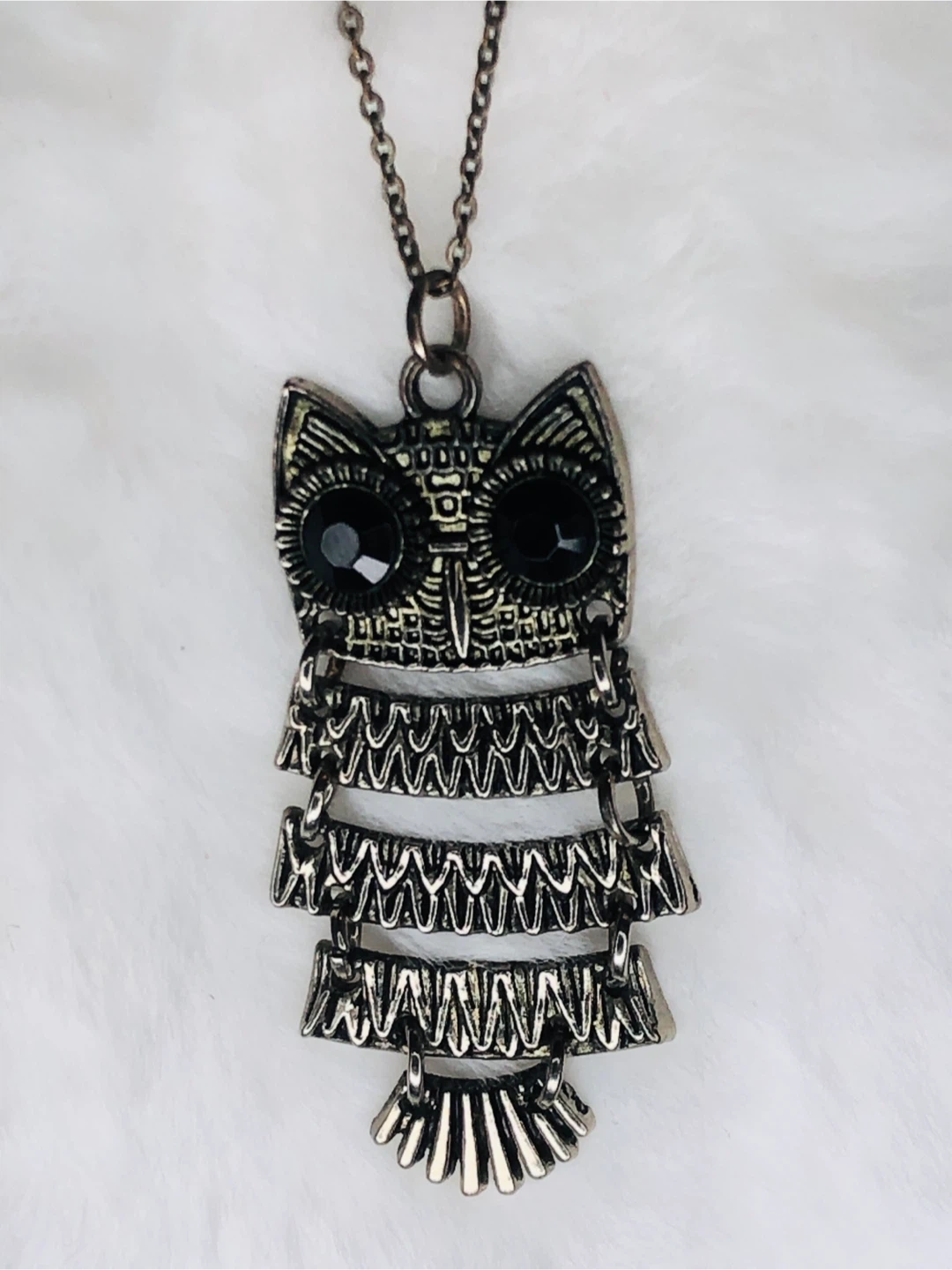 This necklace features a detailed owl pendant with black accent stones. The chain is a silver-tone metal. It's a unique accessory that adds personality to any outfit!