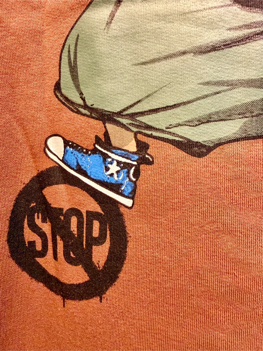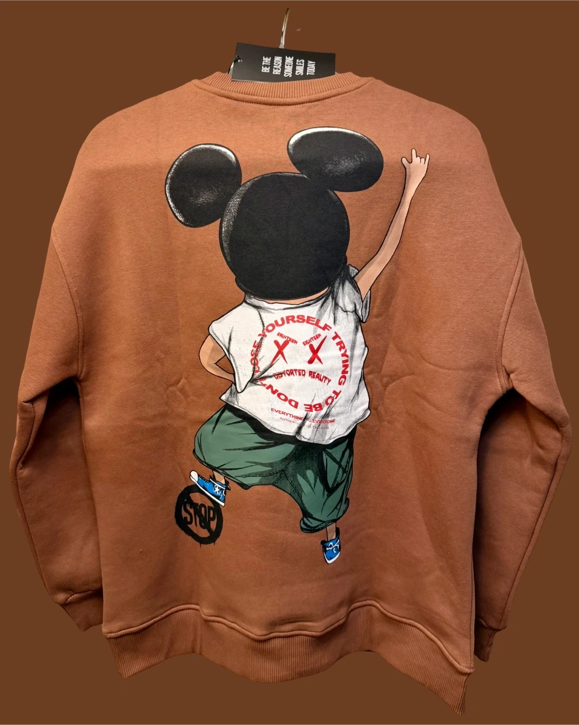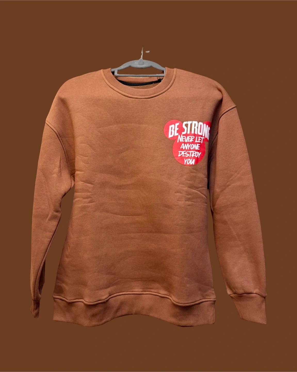 This brown crewneck sweatshirt features a large graphic on the back with the text 'don’t lose yourself trying to be '. It also has text on the front that says 'be strong never let anyone destroy you'.