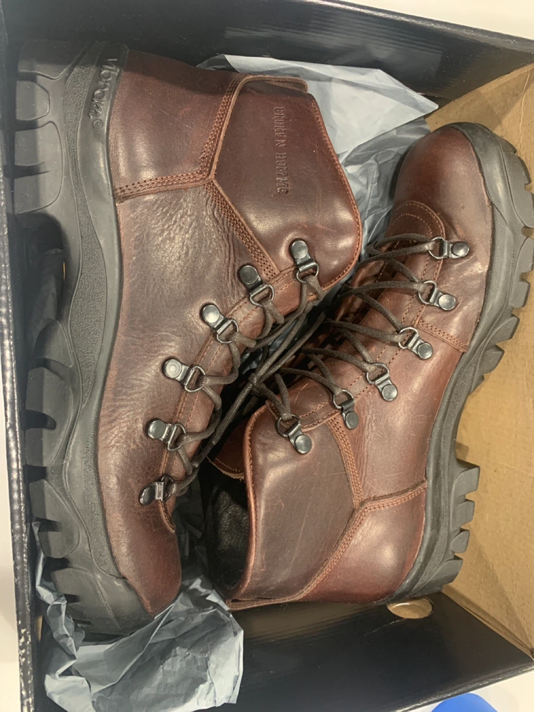 LEATHER BOOTS Brahma Bull winter hiking boots in oxblood color. Leather upper with Vibram soles for great traction. Includes original box and packaging.