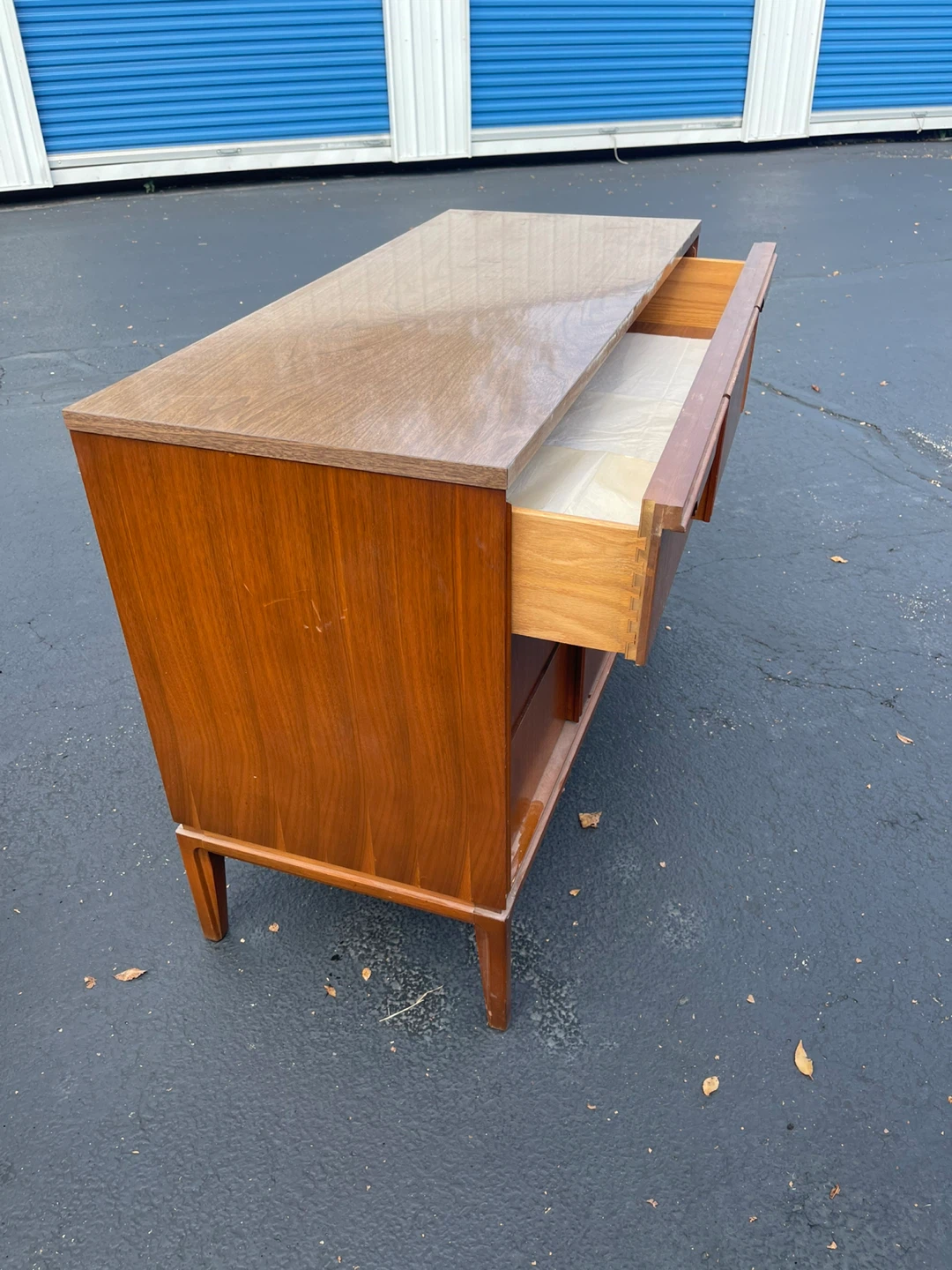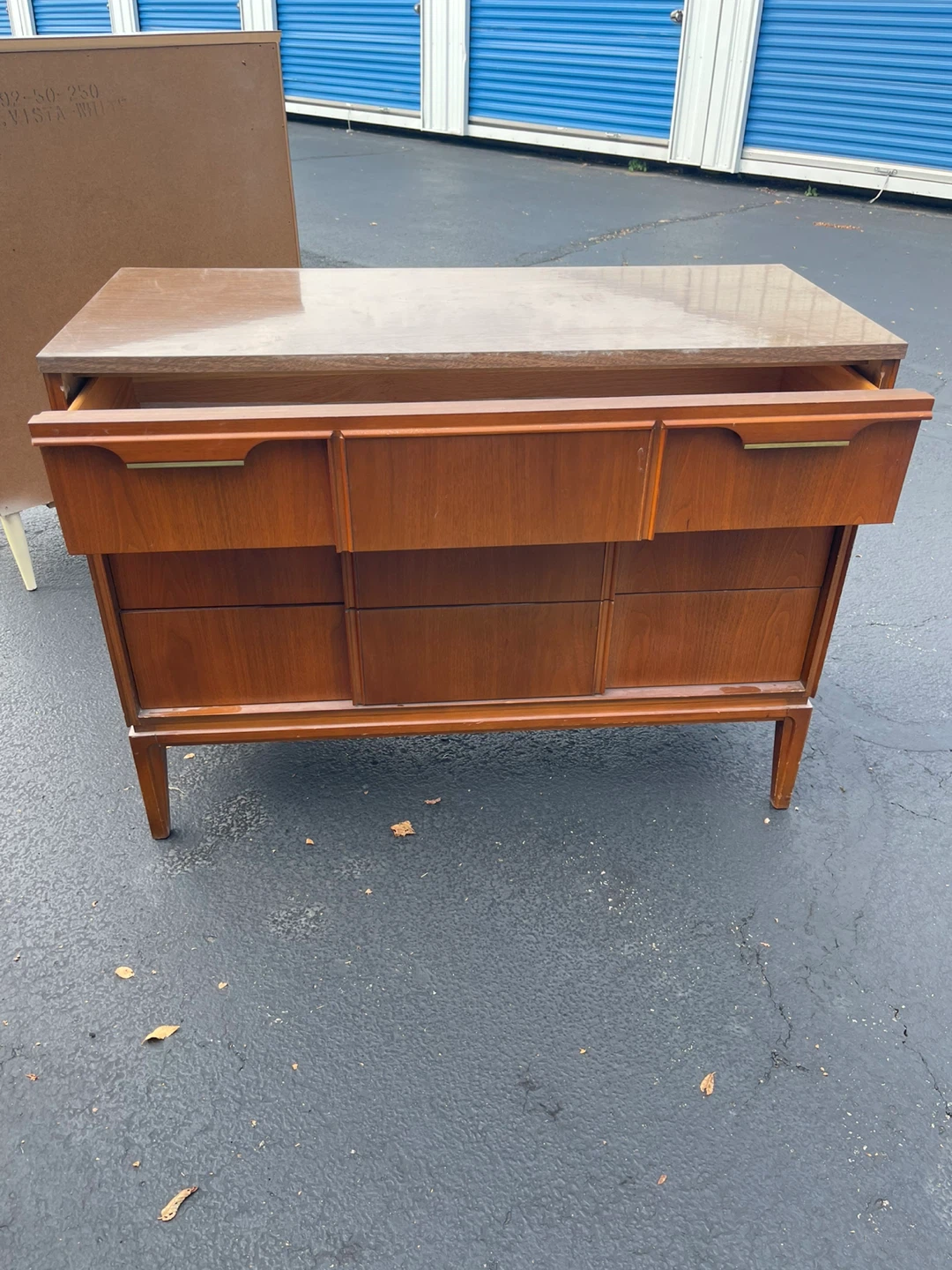 Selling a vintage Bassett dresser in walnut color. It features several drawers for storage. The dresser has a classic mid-century modern design. Perfect for adding a touch of retro style to your home!