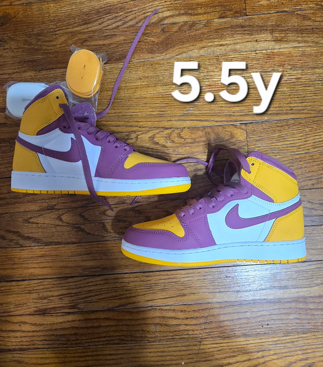 Selling a pair of Nike Air Jordan 1 High sneakers in size 5.5Y. These stylish shoes feature a vibrant color combination of yellow, purple, and white. They also come with extra laces, and its box.