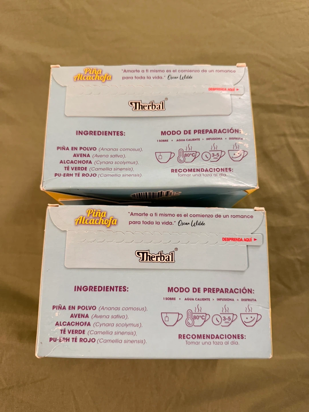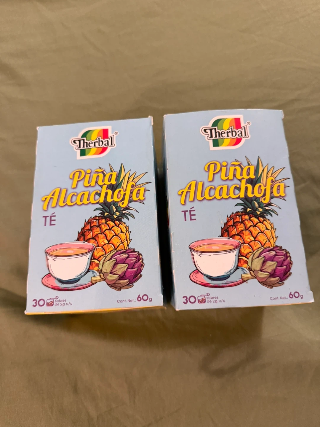 Piña Alcachofa tea. Each box contains 30 tea bags, 2g each for a total of 60g per box. Ingredients include pineapple powder, oat, and artichoke. This tea is vegan and made with 100% natural ingredients. Prepare with hot water at 80°C and steep for 3-5 minutes.
