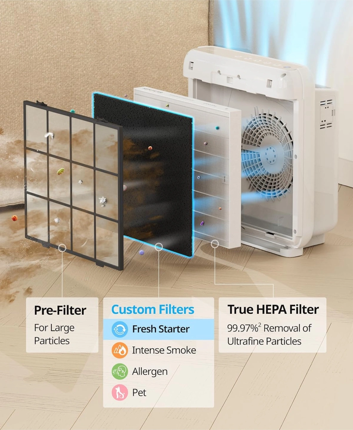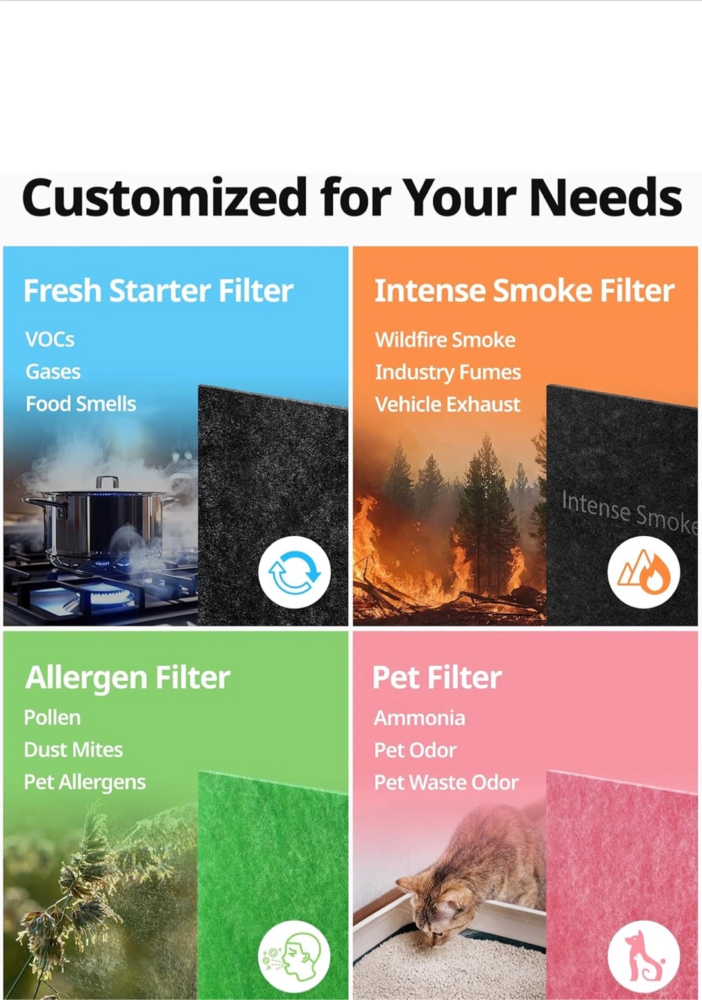 Coway Airmega replacement filter set. Includes pre-filter, custom filters (fresh starter, intense smoke, allergen, pet), and true HEPA filter. Removes ultrafine particles, gases, odors. Great for large particles, smoke, allergens, and pets.