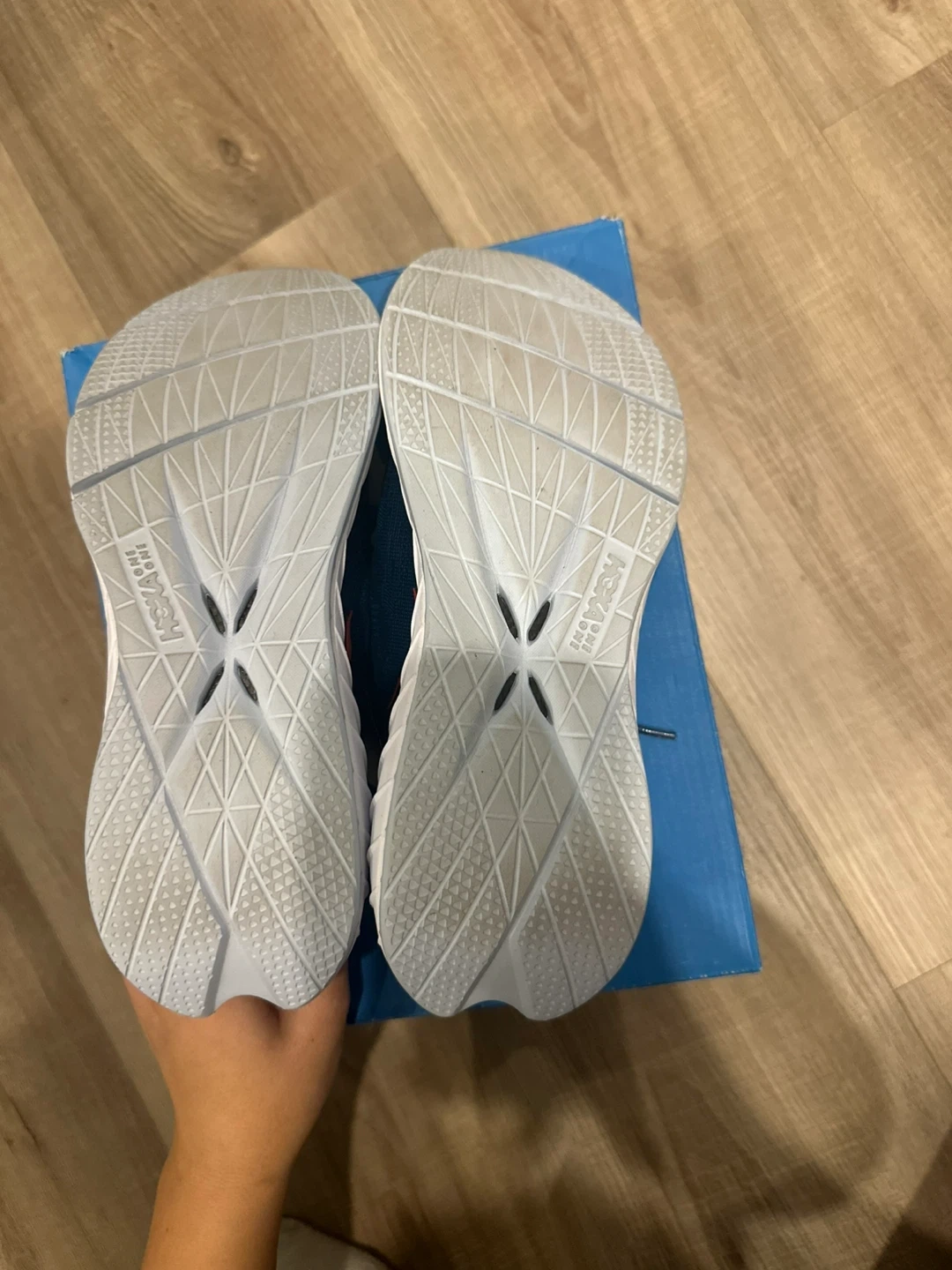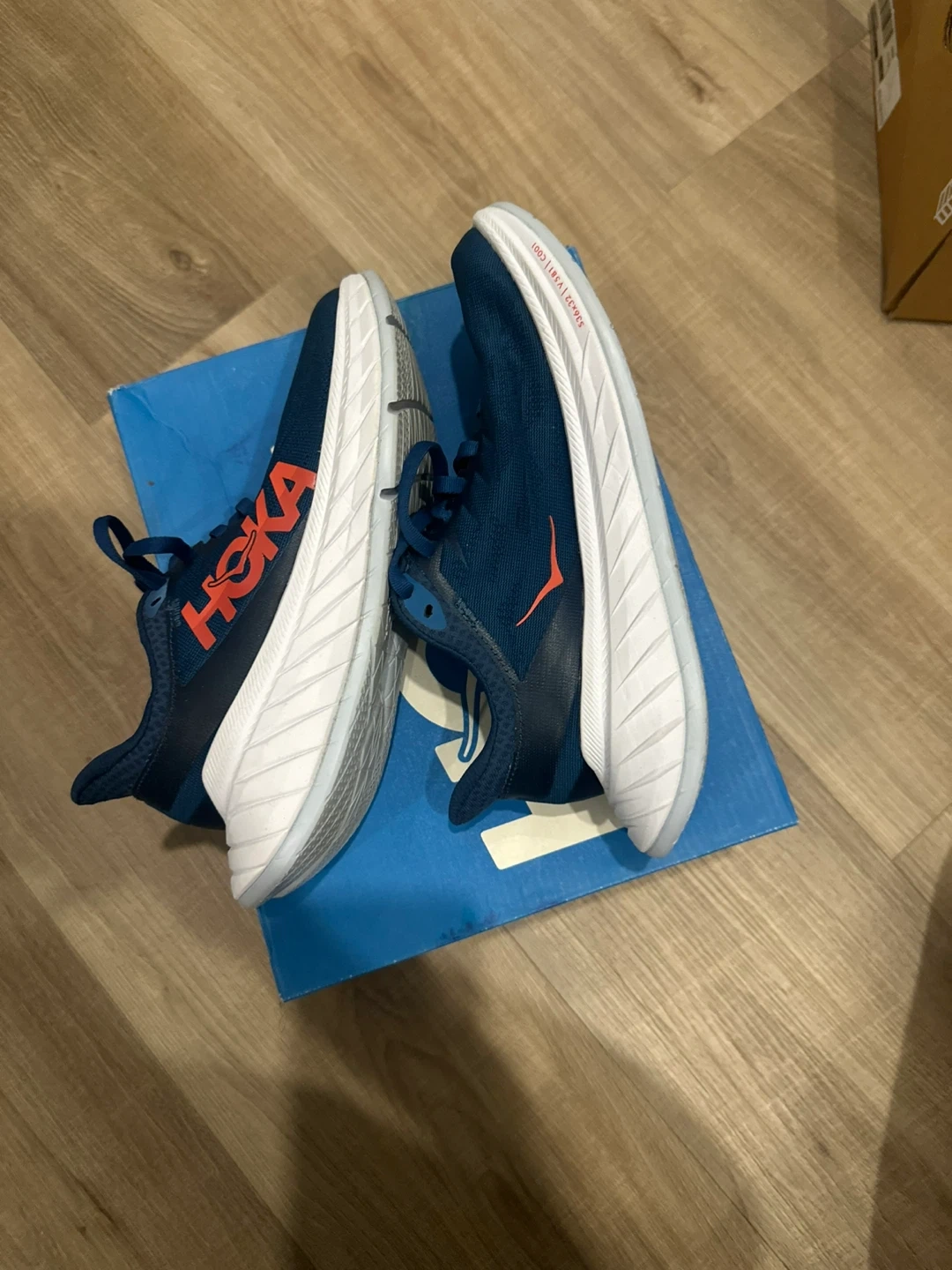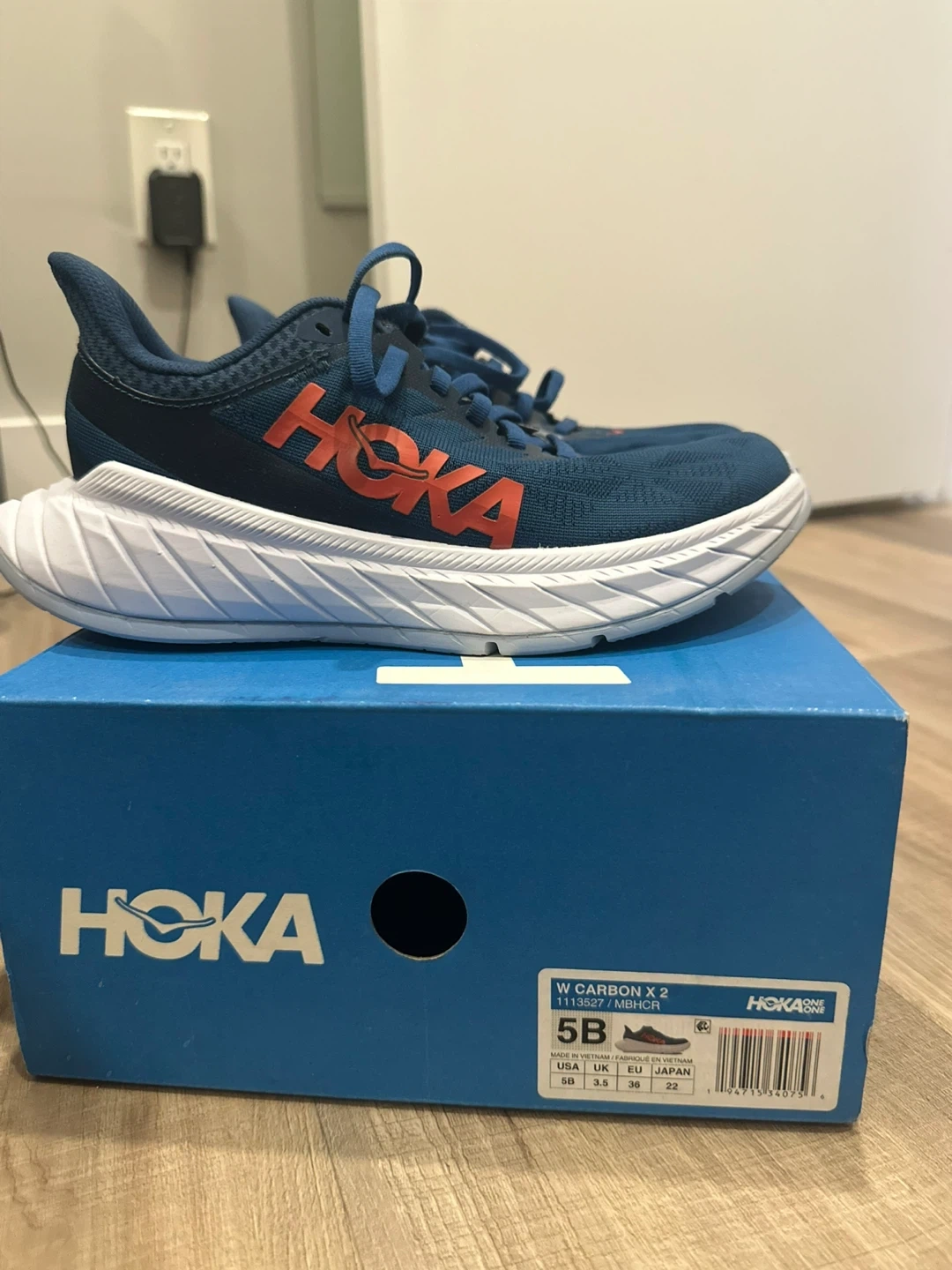 10Selling a pair of Hoka Carbon X 2 women's running shoes in size 5B. They are in great condition and come with the original box. These shoes are known for being lightweight and providing excellent cushioning for running or walking. Worn few times.