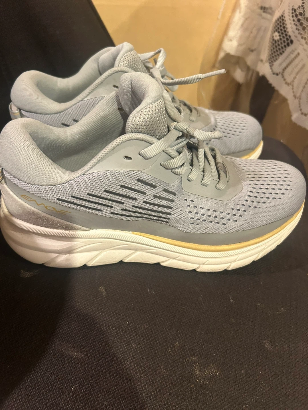 Selling a pair of Hoka ENVE women's running shoes in gray. They are in good condition and ready for a new home! Size 9/5
