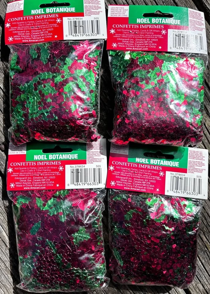 15Holiday Confetti Botanical Shapes. Red & Green. New in Package. $2 each, all 4 Packs for $5. * Add a festive sparkle to parties, cards, gift wrap, paintings, and crafts * Shiny holly & poinsettia leaves, and berry shapes * 2.5 oz per pack