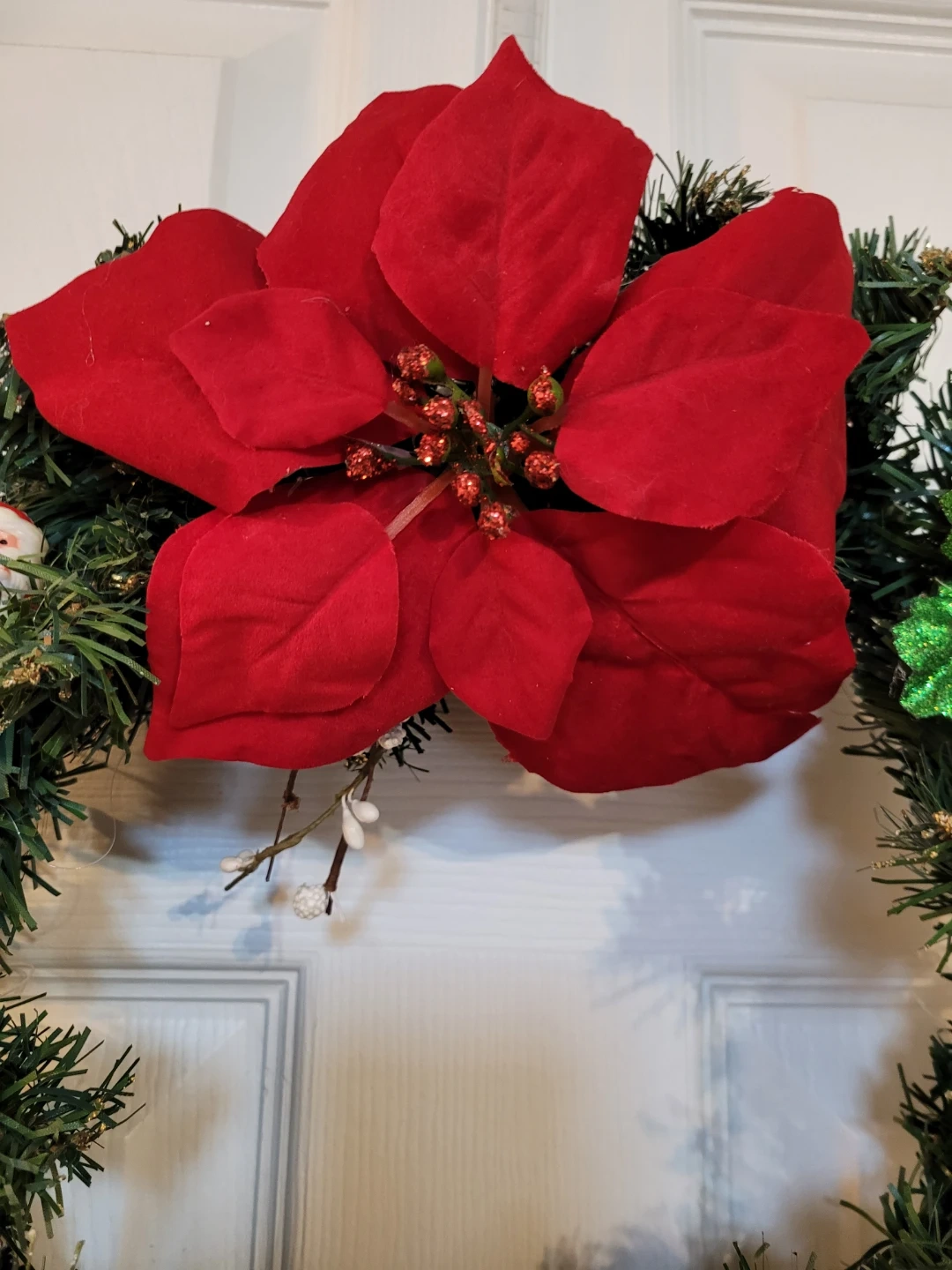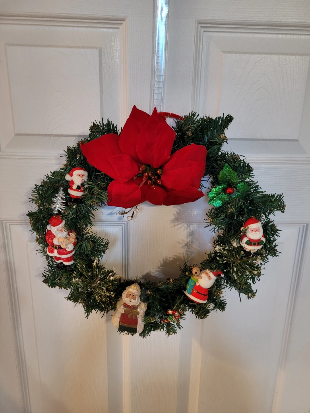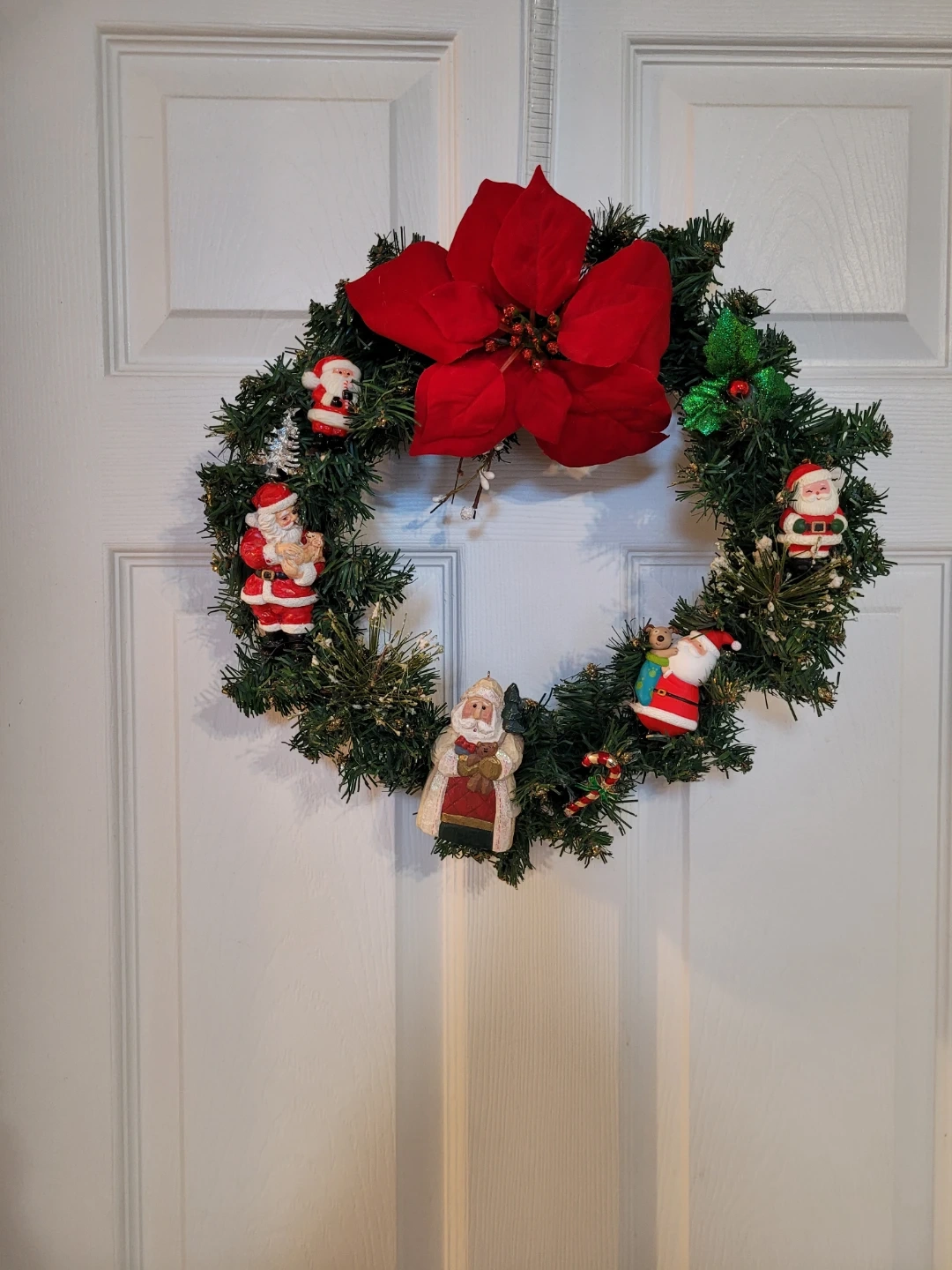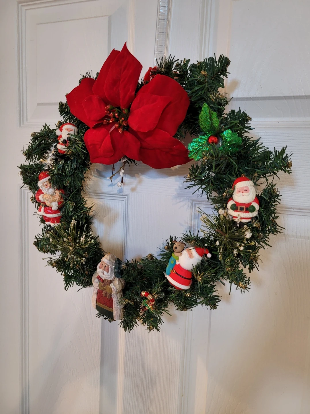 85Here's a festive Crafted Christmas wreath featuring adorable Santa Claus figurines and a bright red poinsettia! It's perfect for adding a touch of holiday cheer to your home. Feel free to check out my other unique items listed.