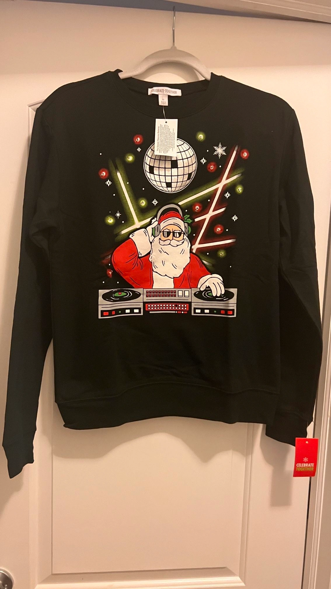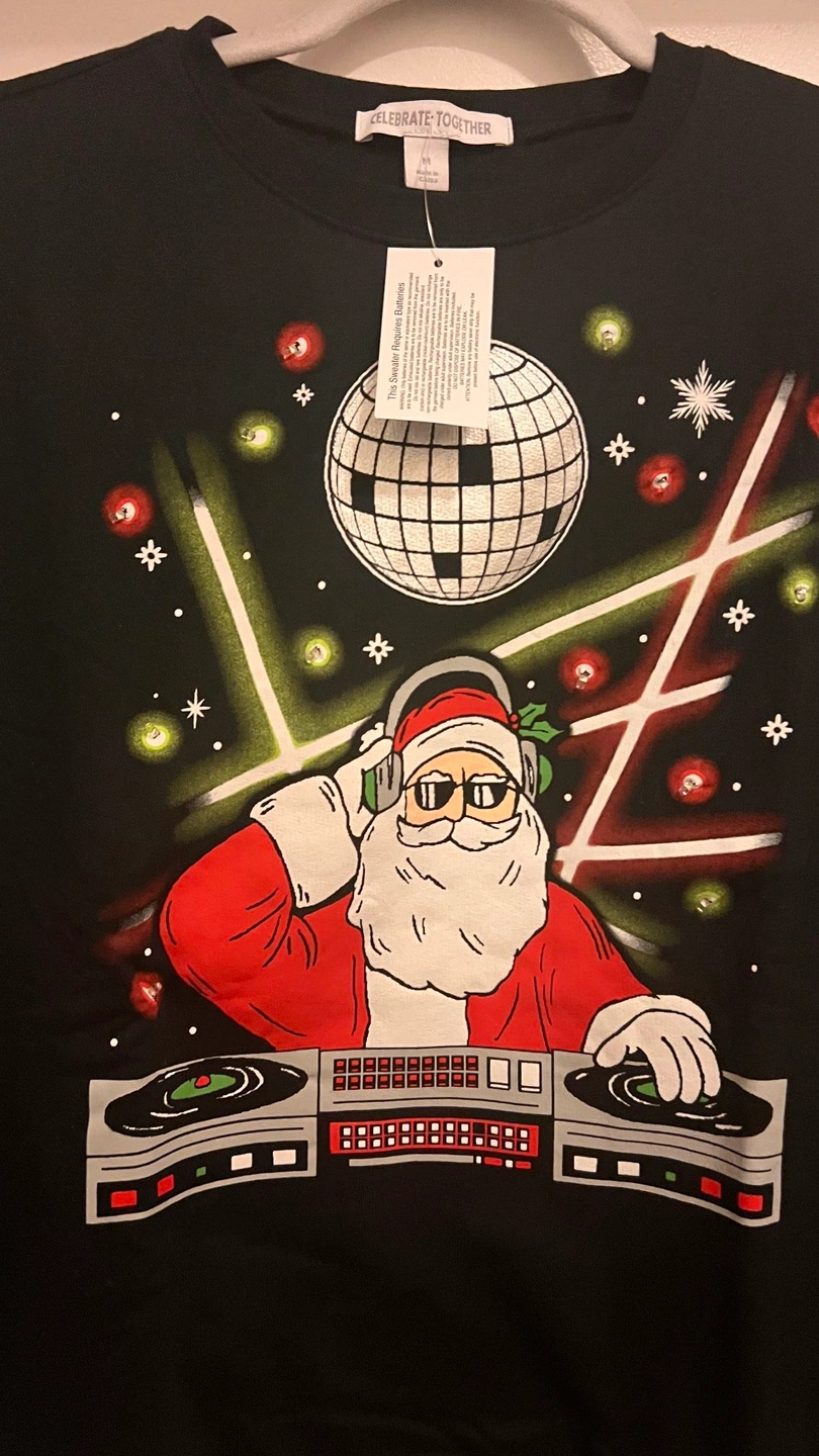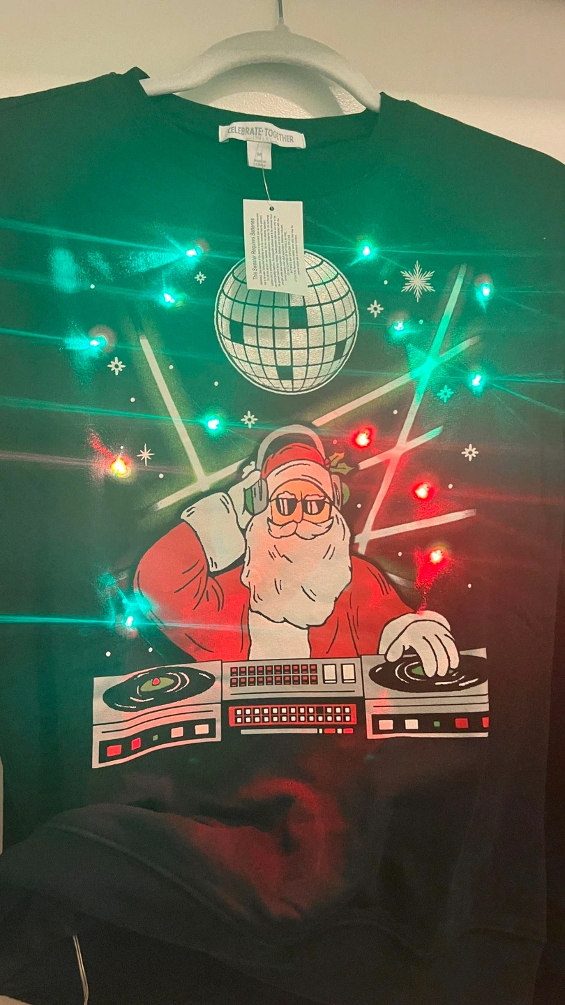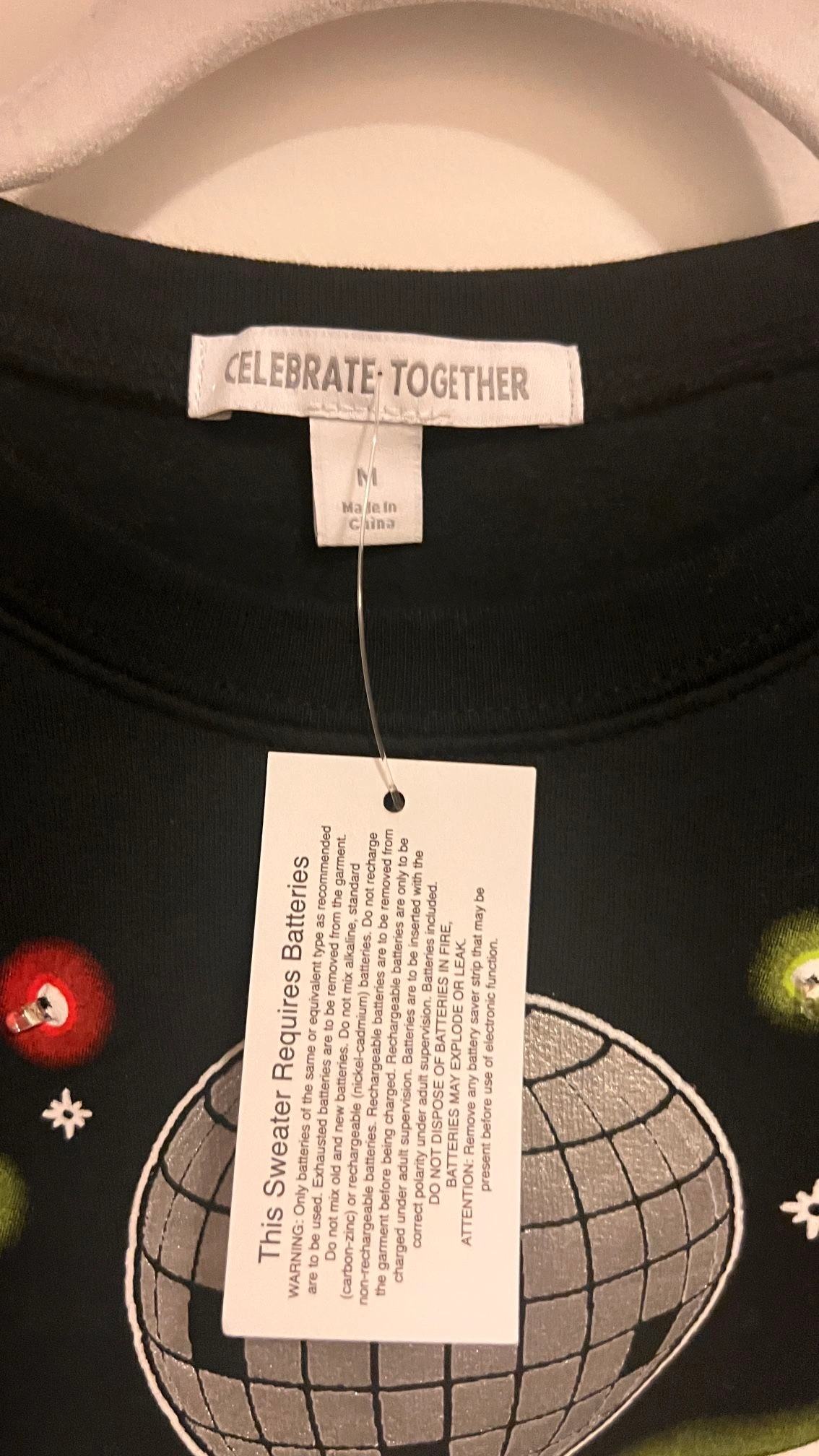 Brand New Size Medium Long sleeve Black Include batteries Flash red and green Size Type: Regular Size: M Color: Black Material: Cotton Style: Crewneck Brand: Celébrate together