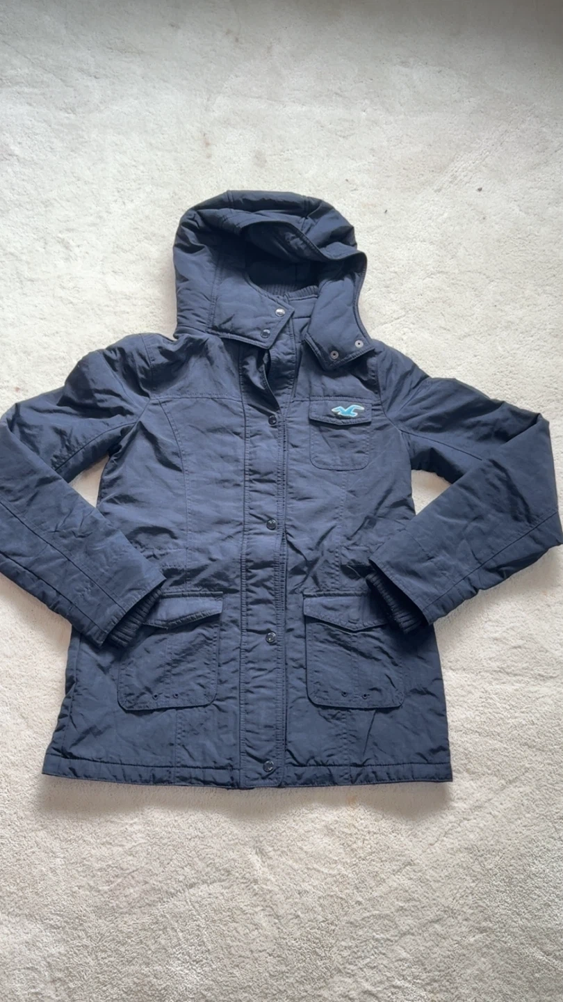 18I'm selling a Hollister puffer jacket in navy blue. It's in great condition and perfect for cooler weather! It features a hood and multiple pockets.