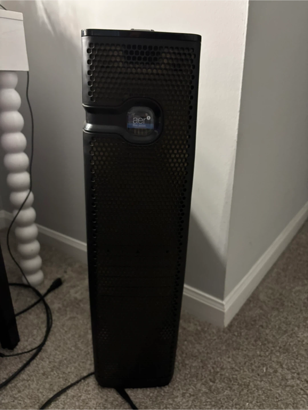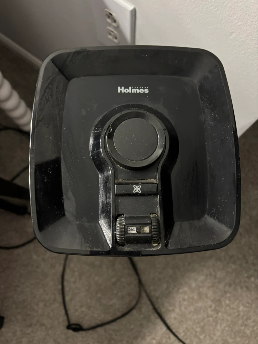 I'm selling a Holmes air purifier. It's black and in good condition. It features an adjustable fan speed.