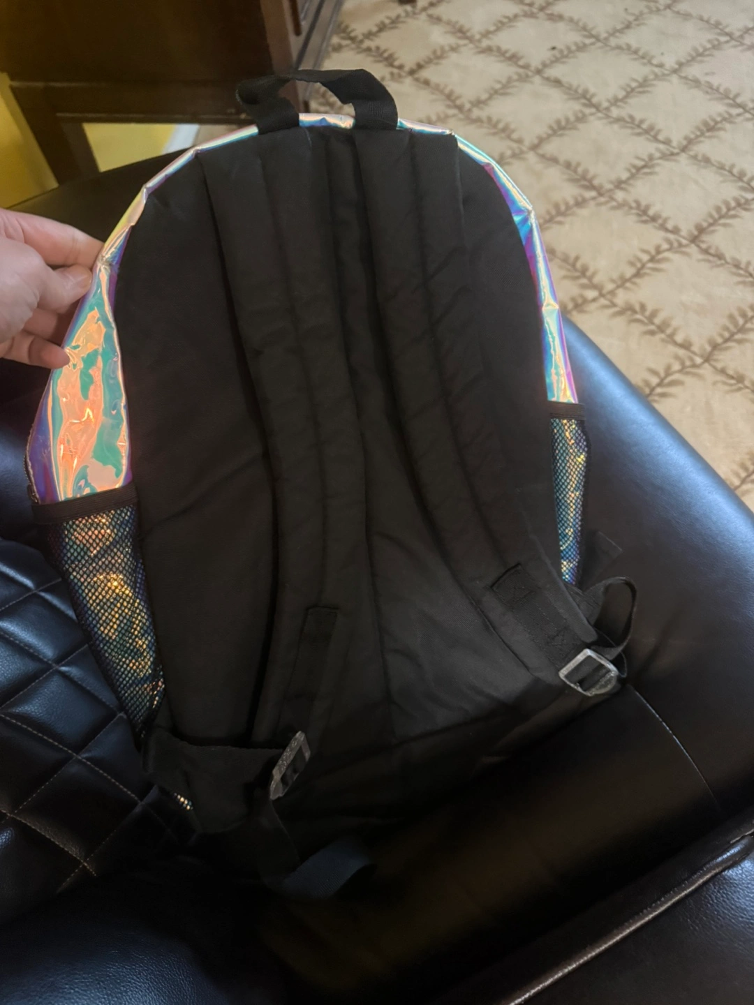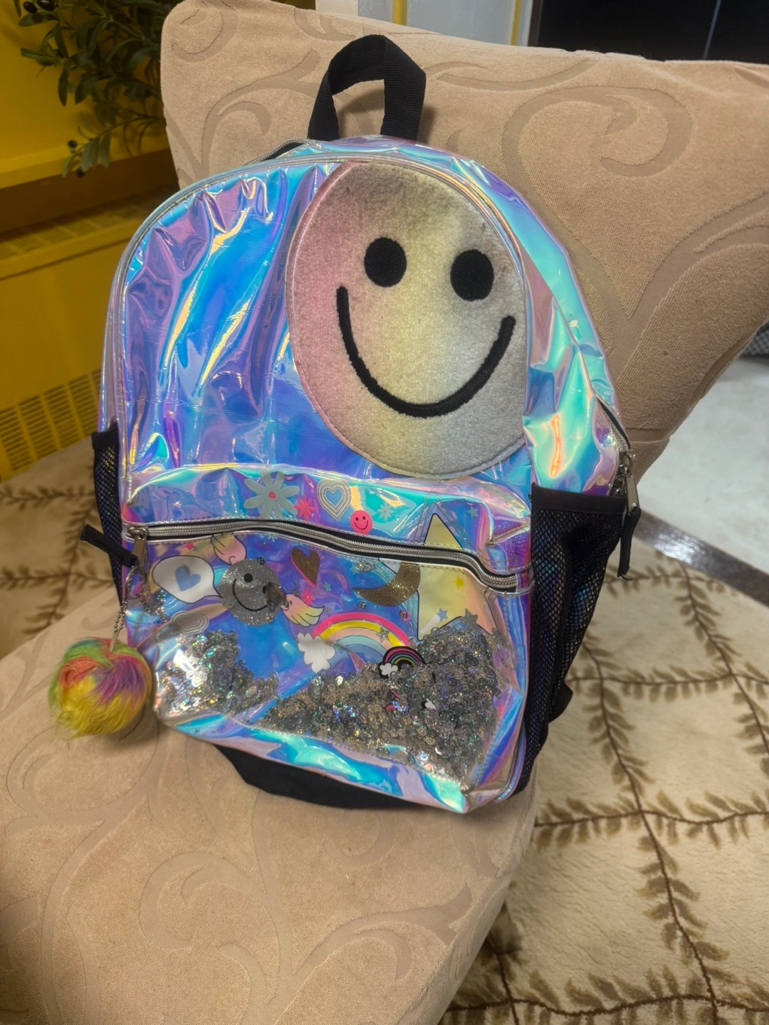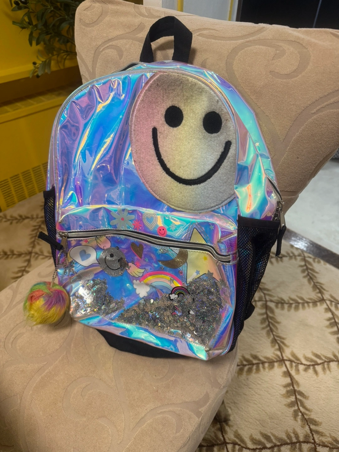10Cute iridescent backpack. Features a large smiley face and sparkly accents. Great for school or everyday use. Has a main compartment and side pockets.