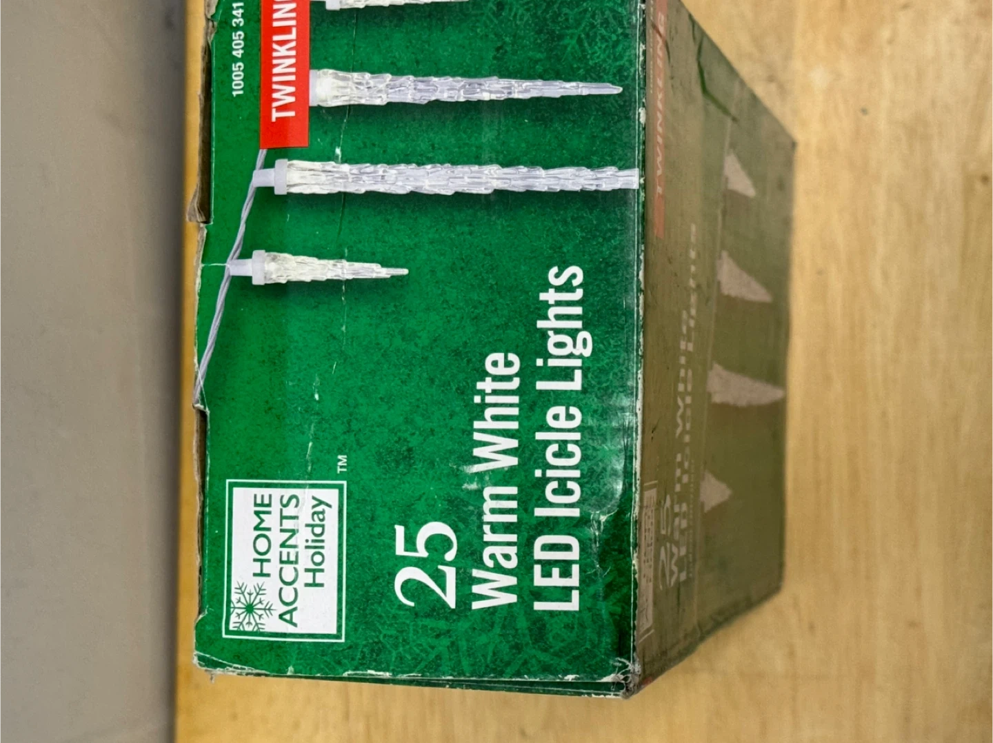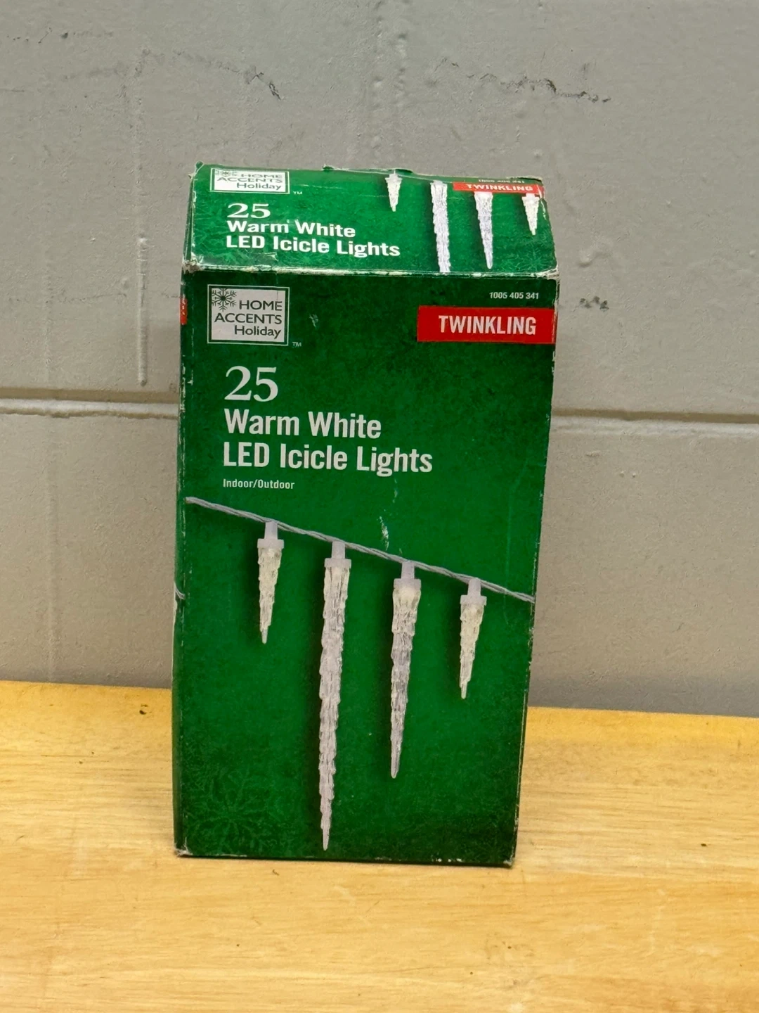 Selling a set of 25 warm white LED icicle lights from Home Accents Holiday! These lights are suitable for both indoor and outdoor use and come in their original box