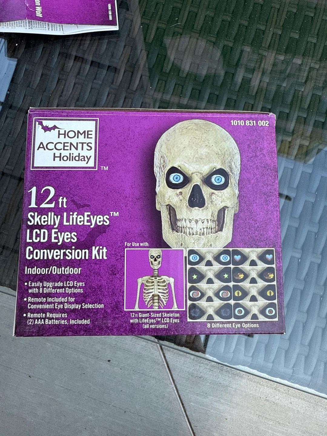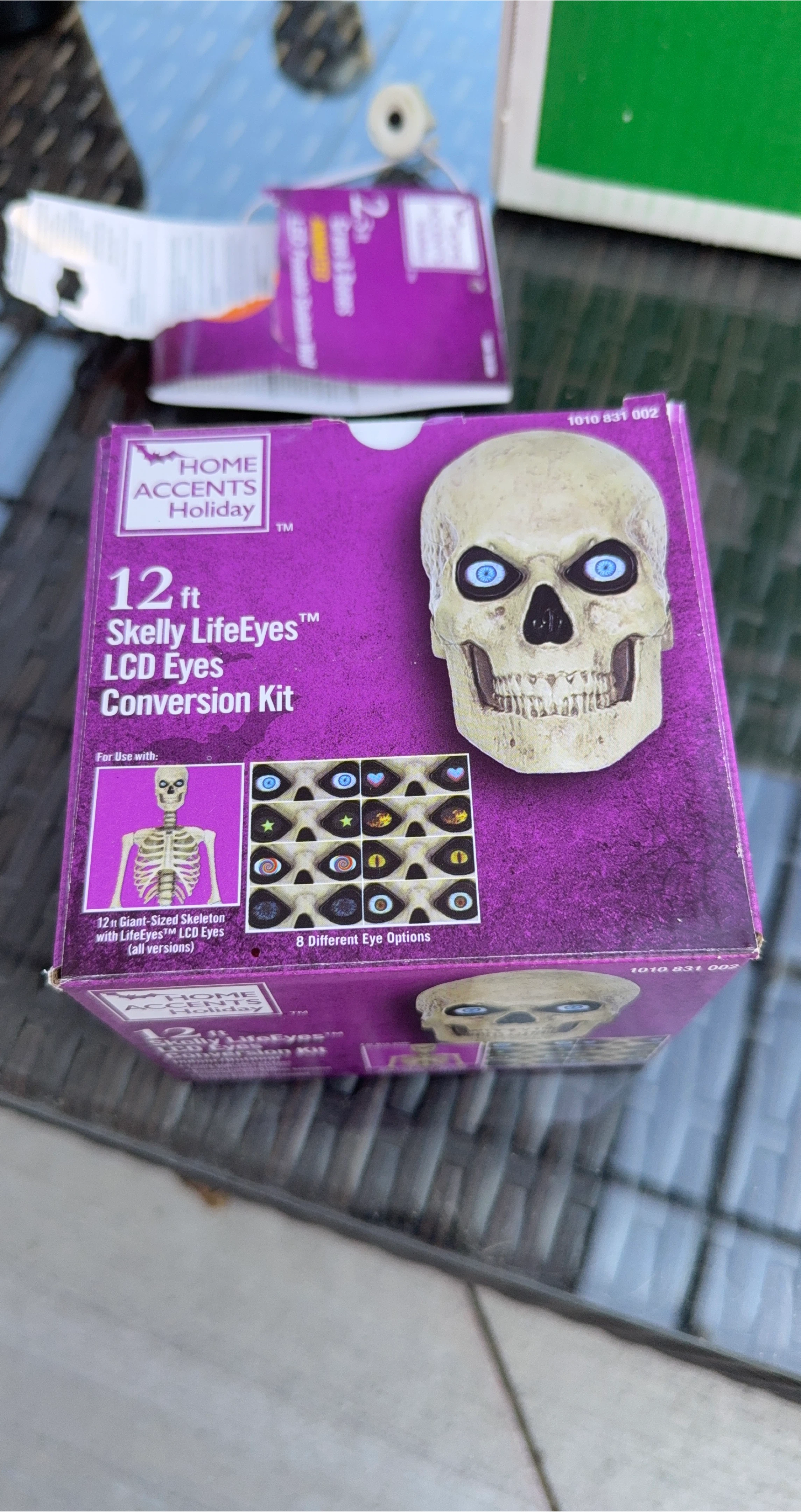 Here's a Home Accents Holiday 12 ft Skelly LifeEyes LCD Eyes Conversion Kit. It's for use with 12 in giant-sized skeleton with LifeEyes LCD Eyes (all versions). It's indoor/outdoor and easily upgrades LCD Eyes with 8 different options. Remote included for convenient eye display selection and requires (2) AAA batteries, which are included! Pick up by Irving Park and Cumberland