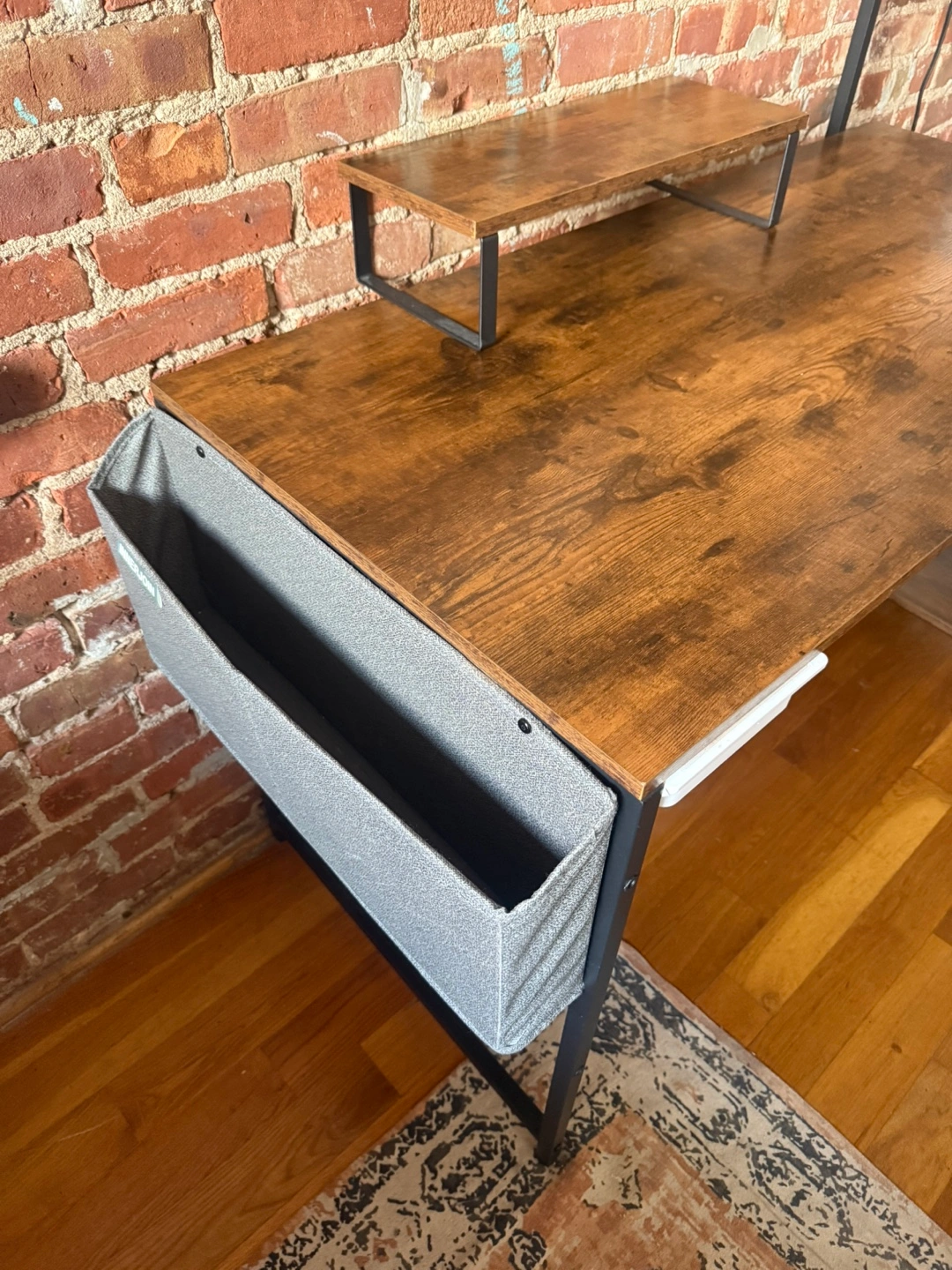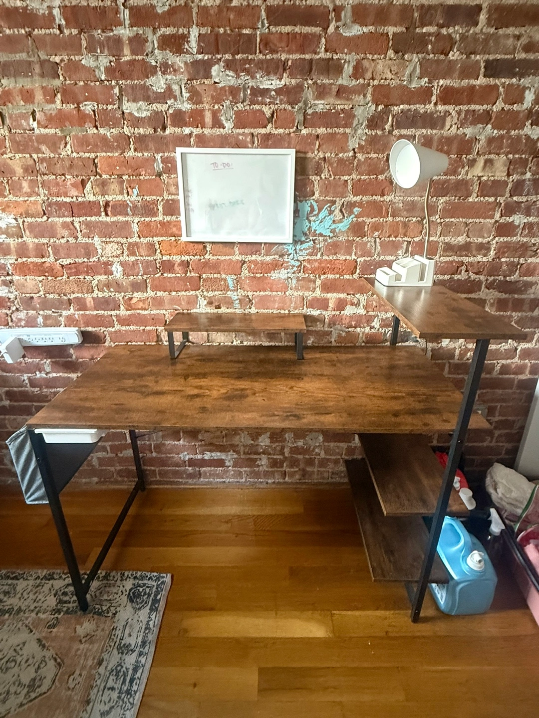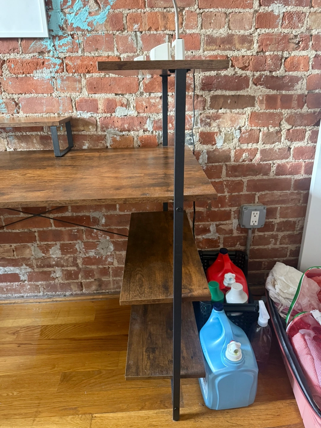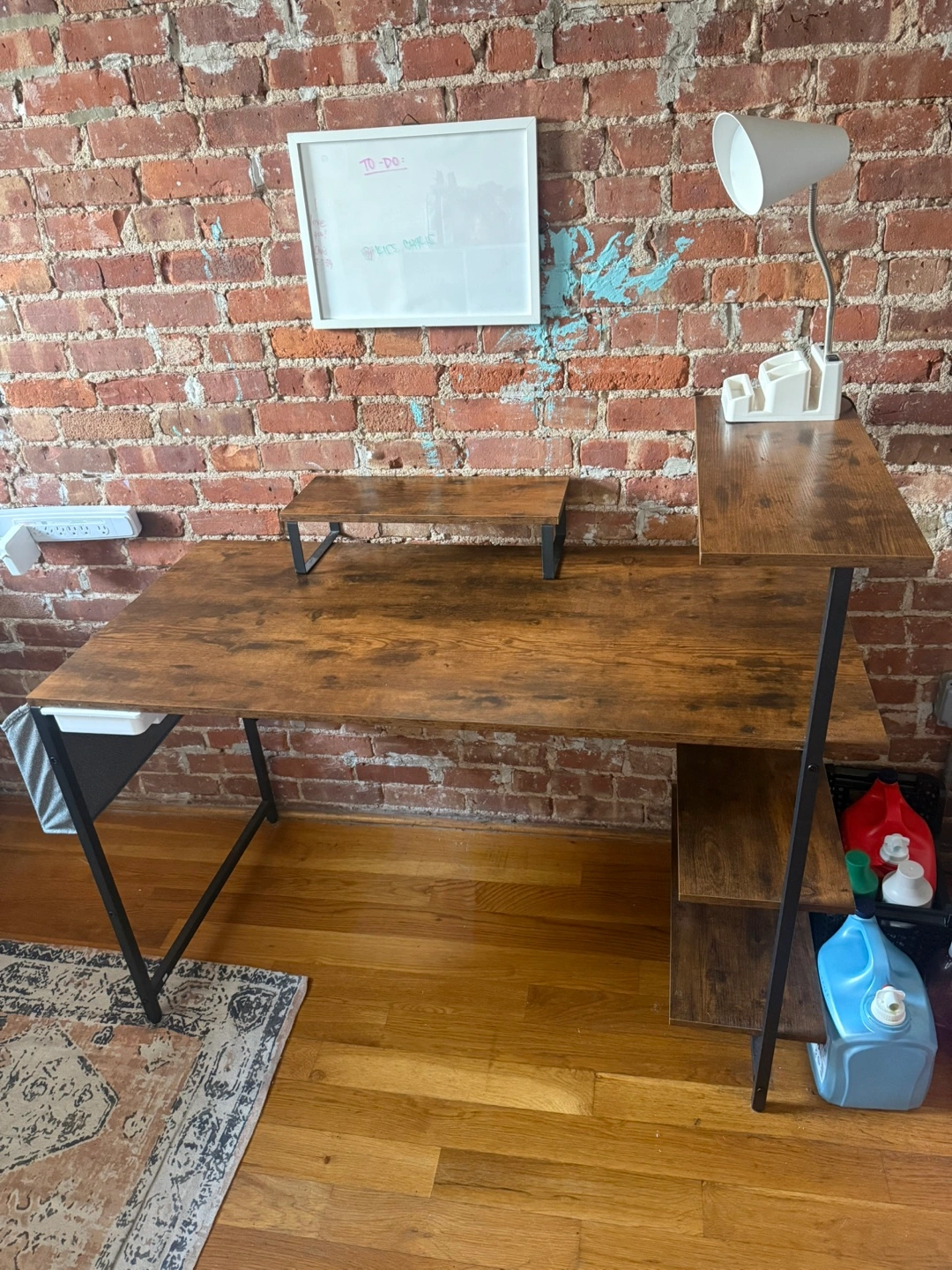 Color: Rustic Brown This is a Home Office Desk with 4-Tier Shelves, Organizers, Detachable Monitor Stand and Desk Lamp. This desk has ample storage space and organizational features. The item is disassembled so you will have to reassemble it. However, the necessary tools and pieces will be provided. I’m in the process of moving out so everything must go and I’m willing to negotiate price!